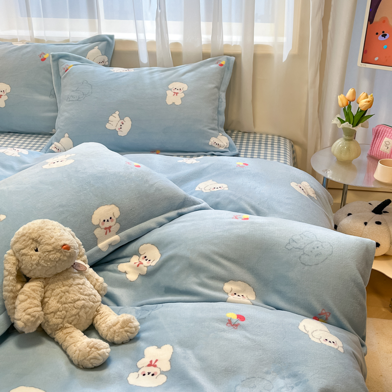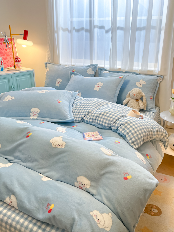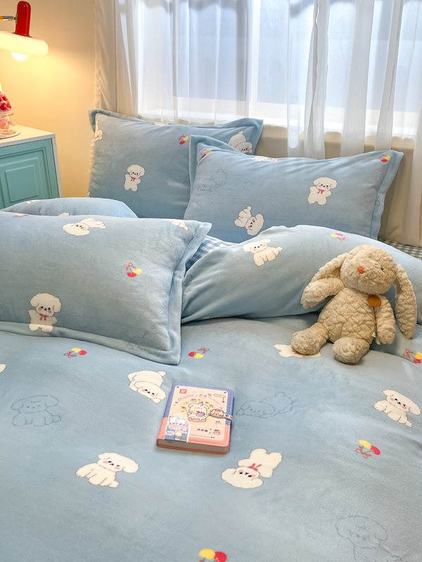 (总)慕尚家纺 2025新款豆豆绒刺绣四件套,大耳狗 白蓝,玫瑰 白粉