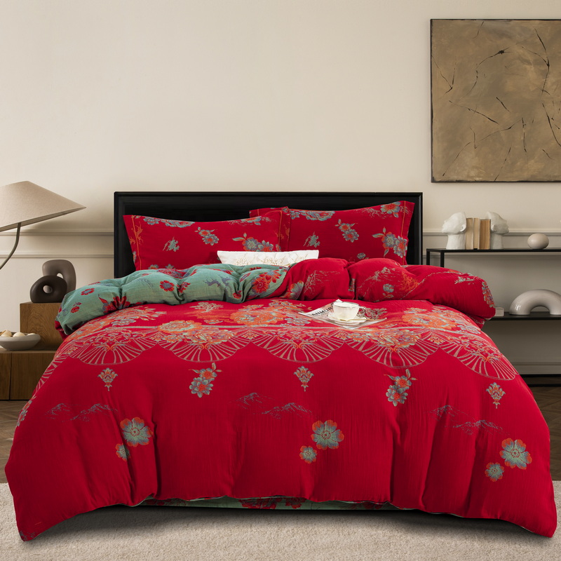 鲁爱 2025新款大版色织提花全棉双层纱四件套 福禄-红