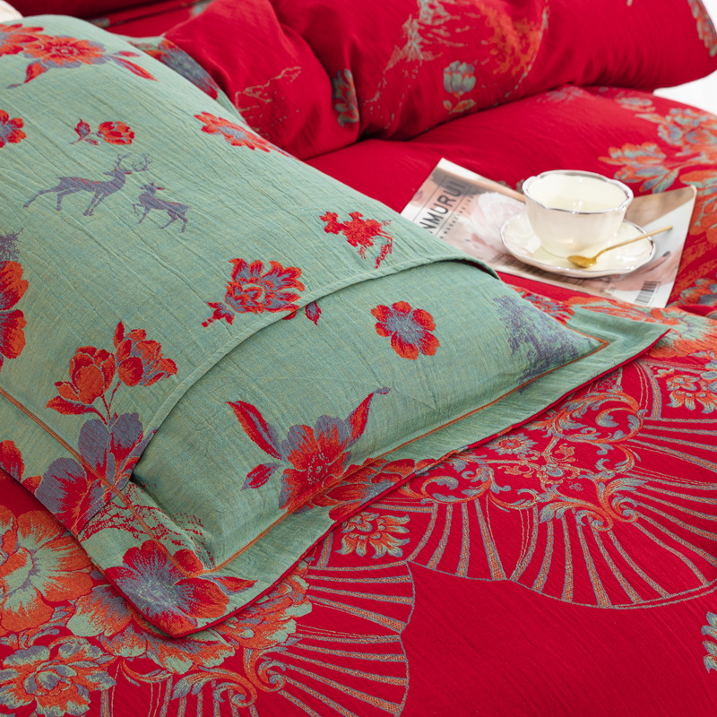 商品名称:鲁爱 2025新款大版色织提花全棉双层纱四件套 福禄-红