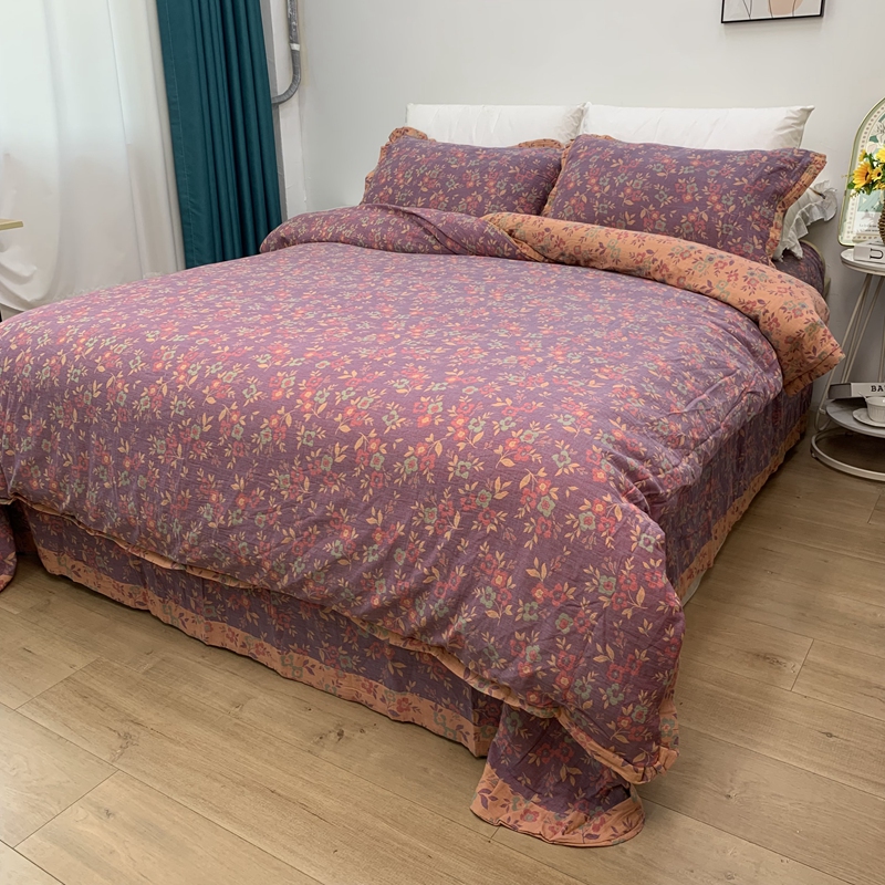 商品名称:鲁爱家纺供货 2025新款全棉色织双层纱花边款四件套 诗意-紫罗兰
