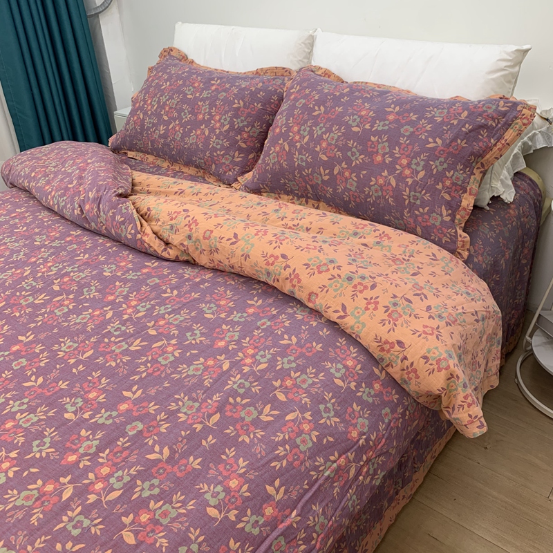 鲁爱家纺供货 2025新款全棉色织双层纱花边款四件套 诗意-紫罗兰