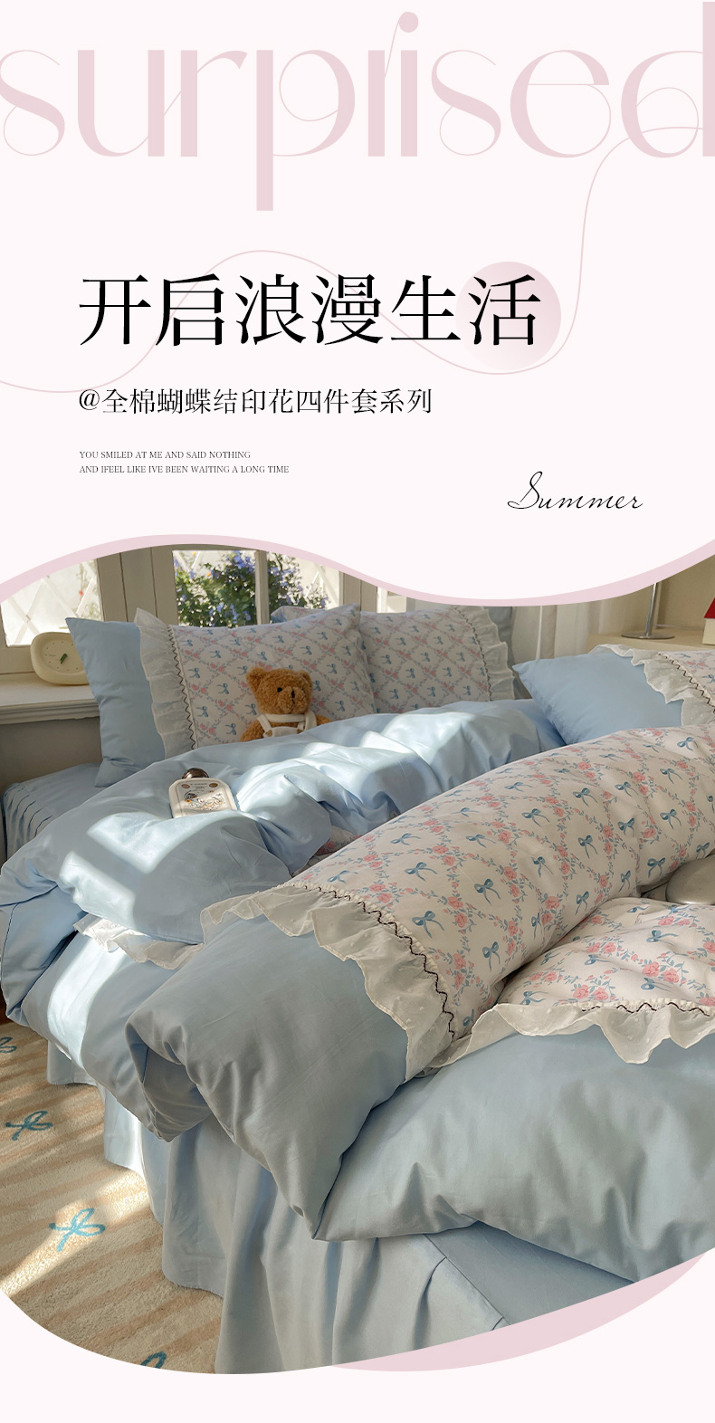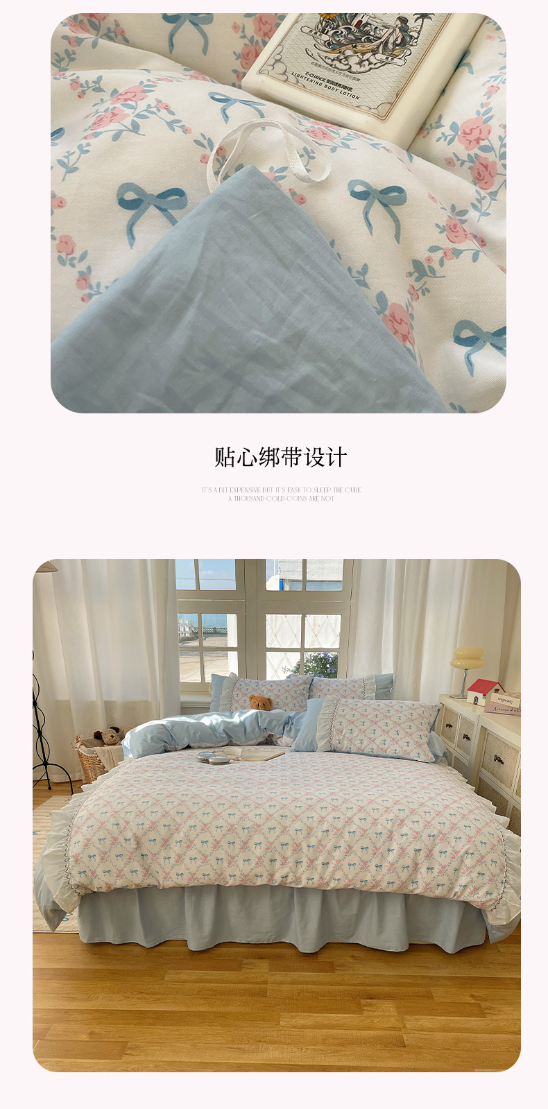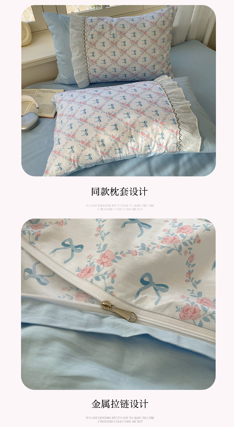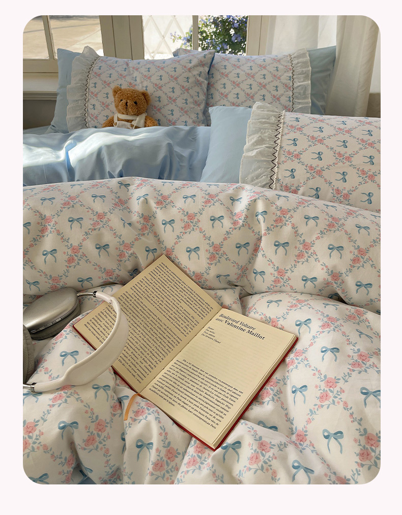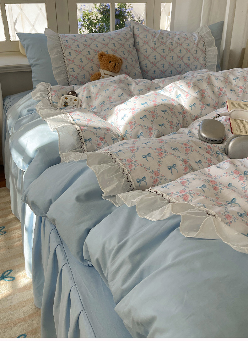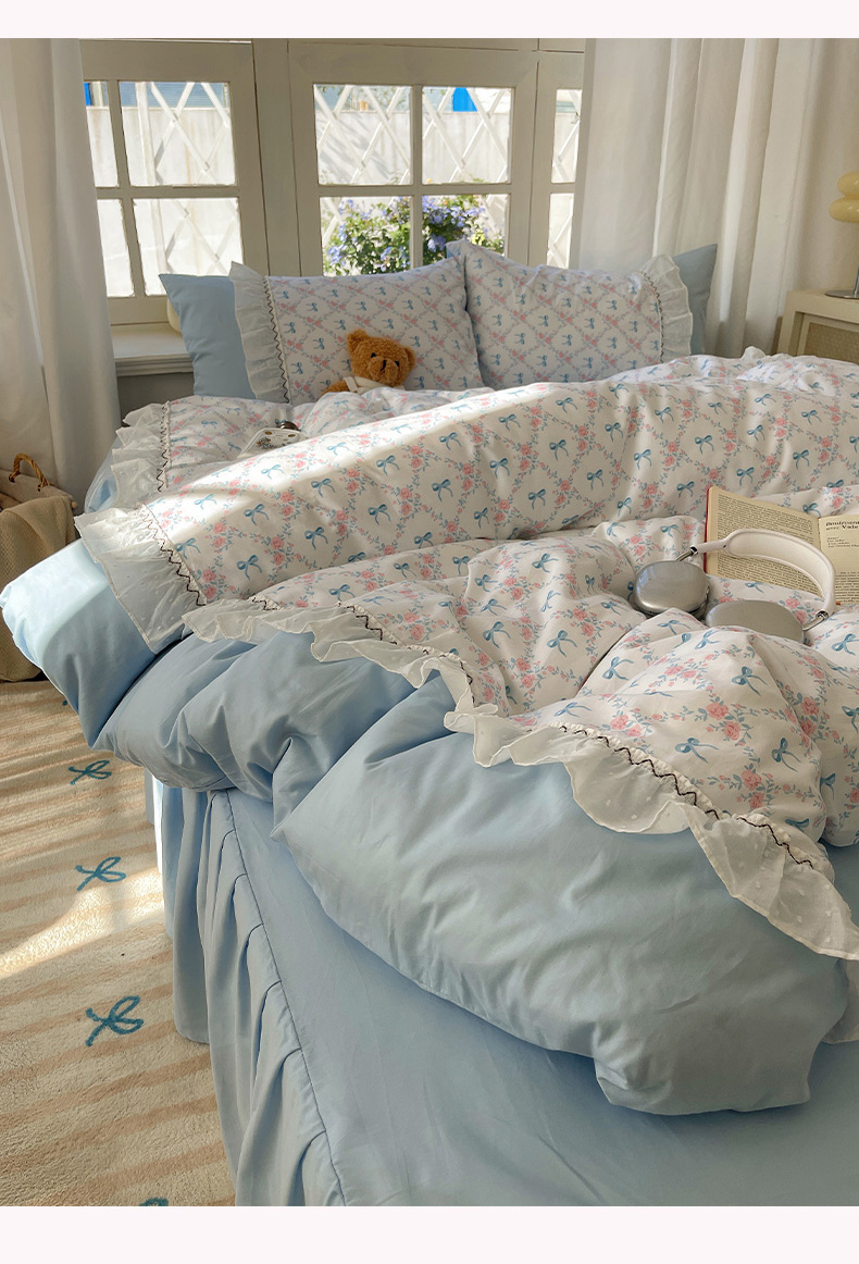 (总)瑞莱 2025新款水洗棉拼接工艺花边款四件套-波点蝴蝶结,波点蝴蝶结-蓝