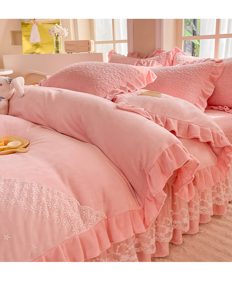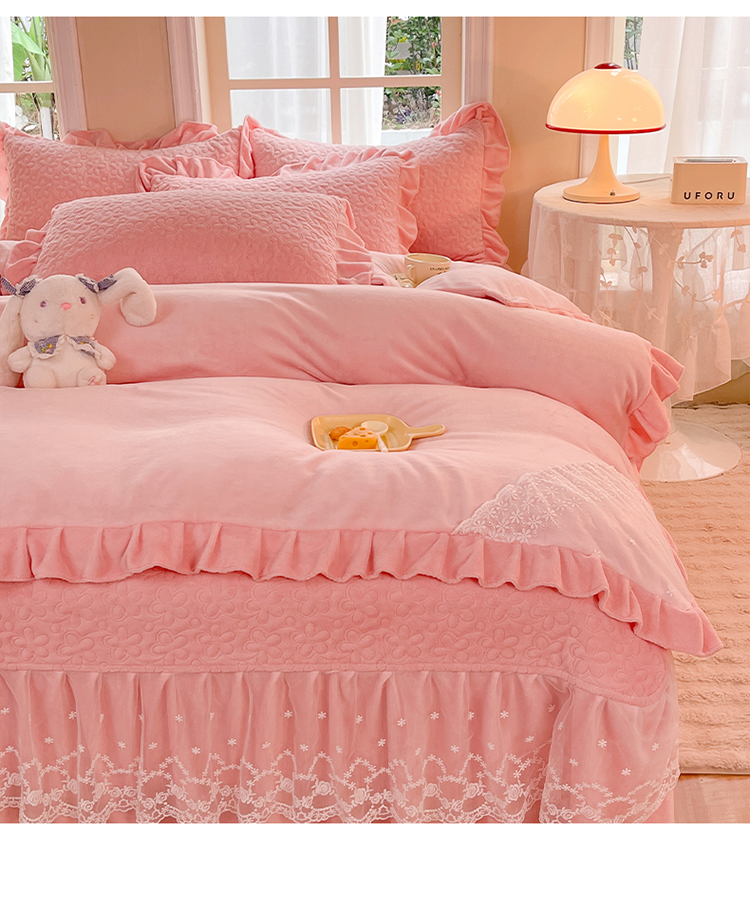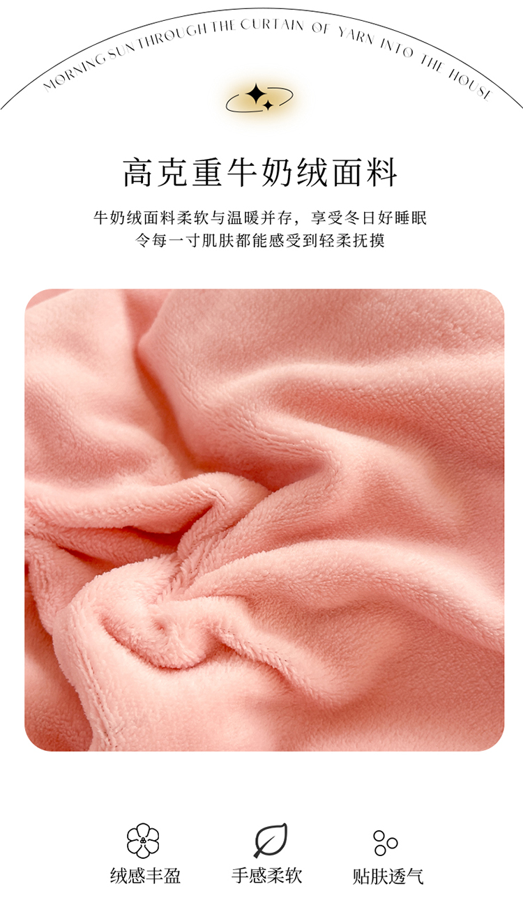 商品名称:2025秋冬新款220g全消光牛奶绒床盖四件套12斤重加厚婴儿绒法莱绒床裙款床盖款四件套 浪漫花语—樱花粉