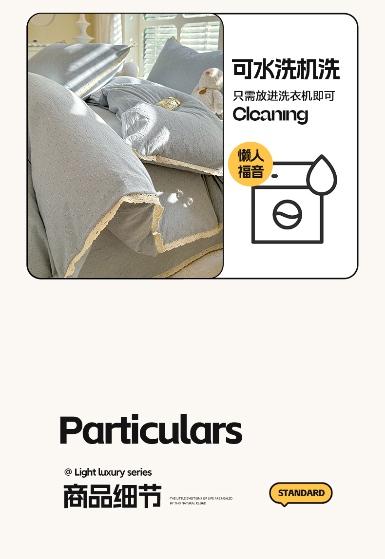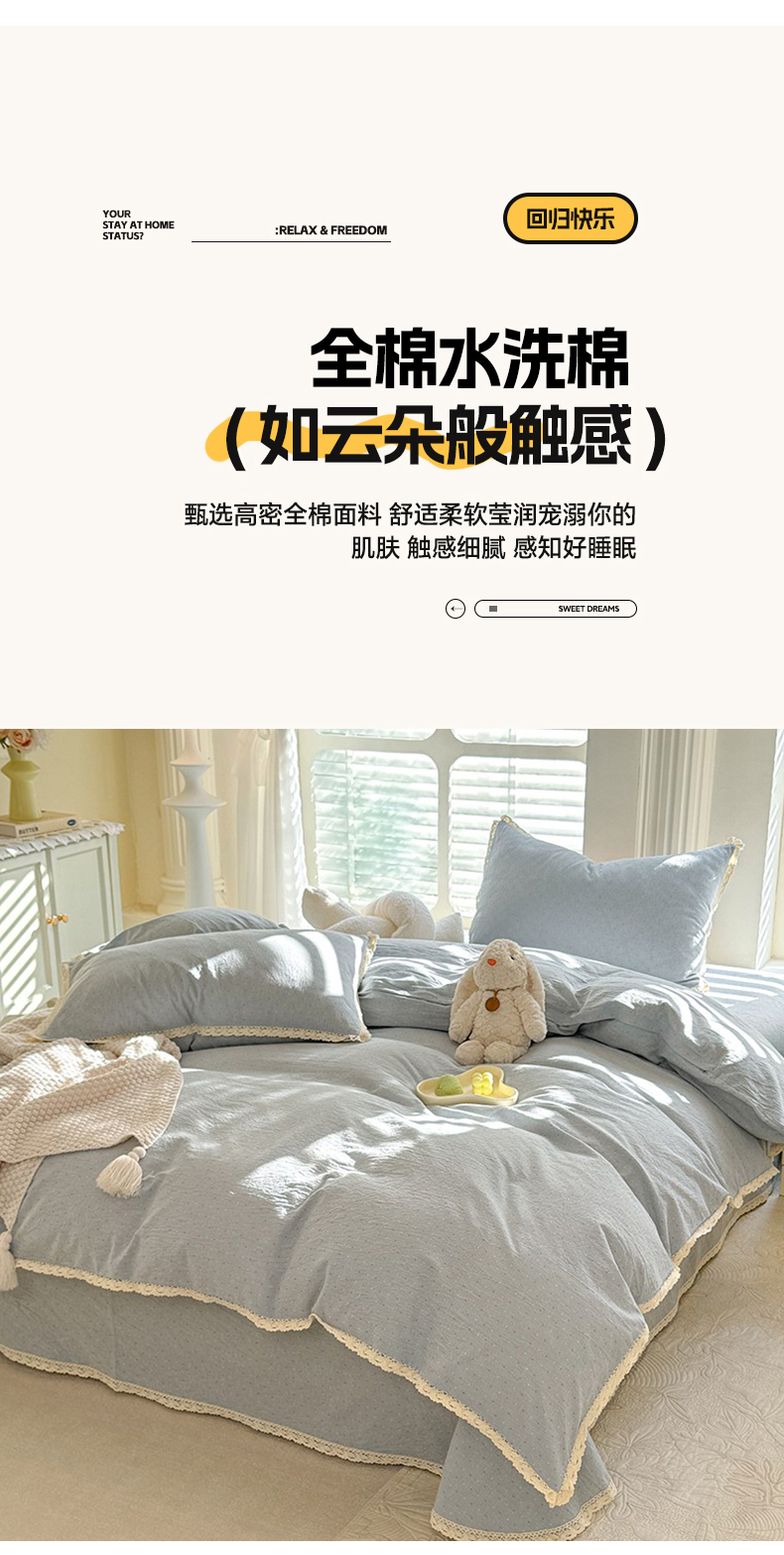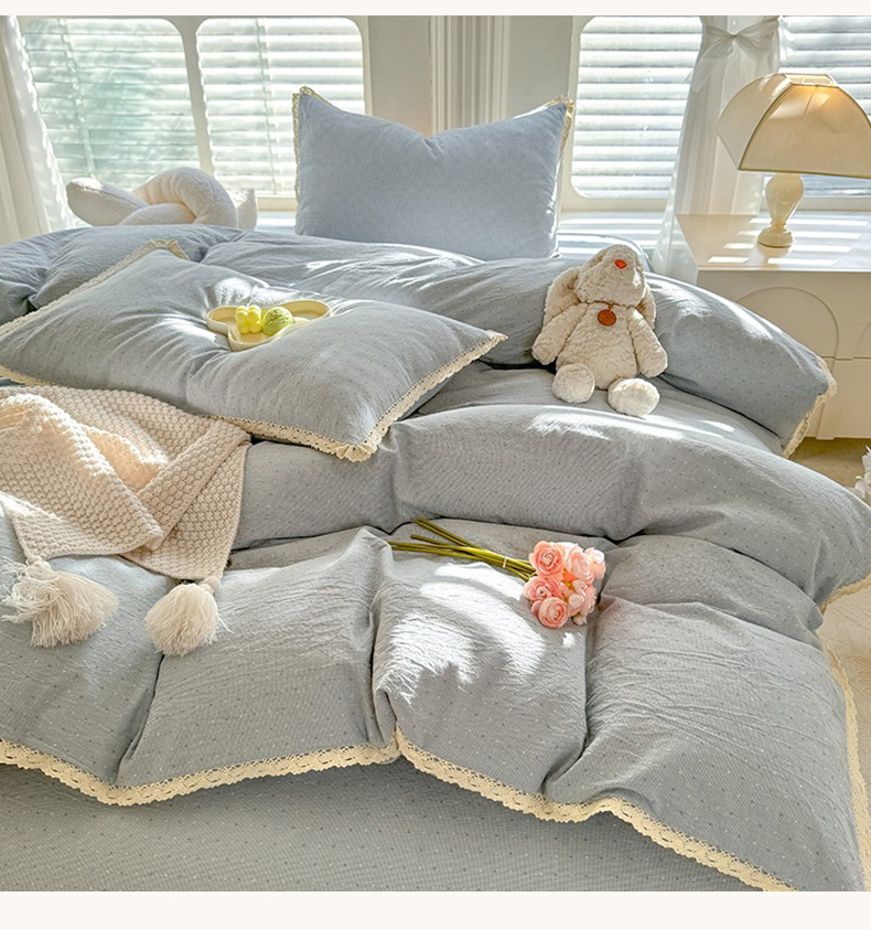 商品名称:棉小二 2025新款全棉色织提花水洗棉花边四件套-漫时光 漫时光-蓝