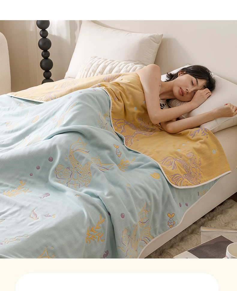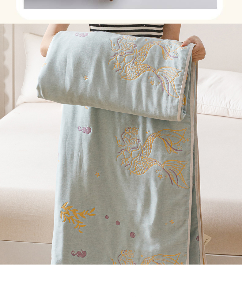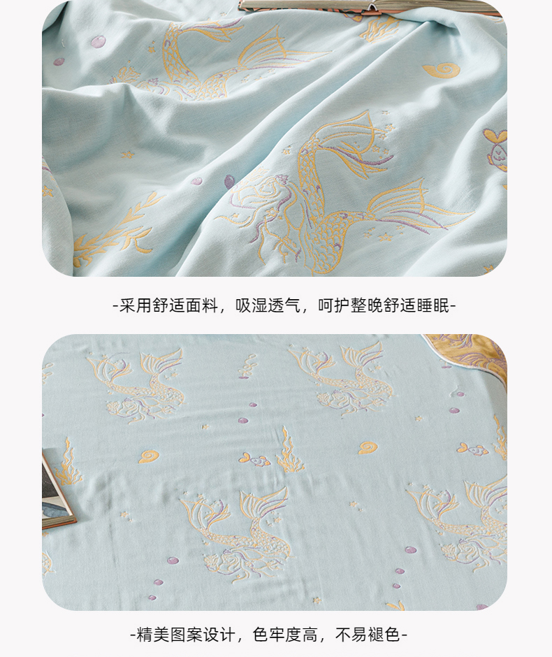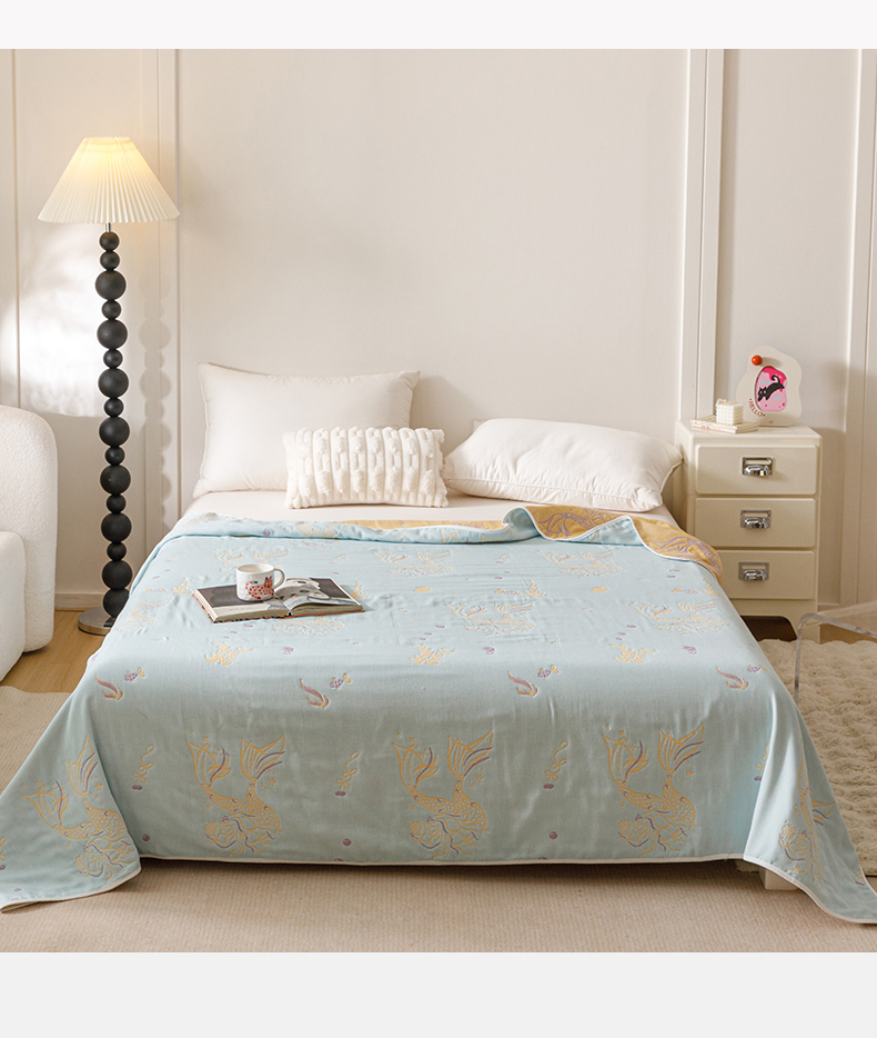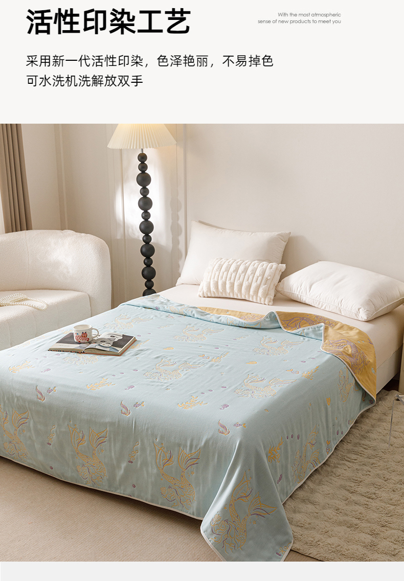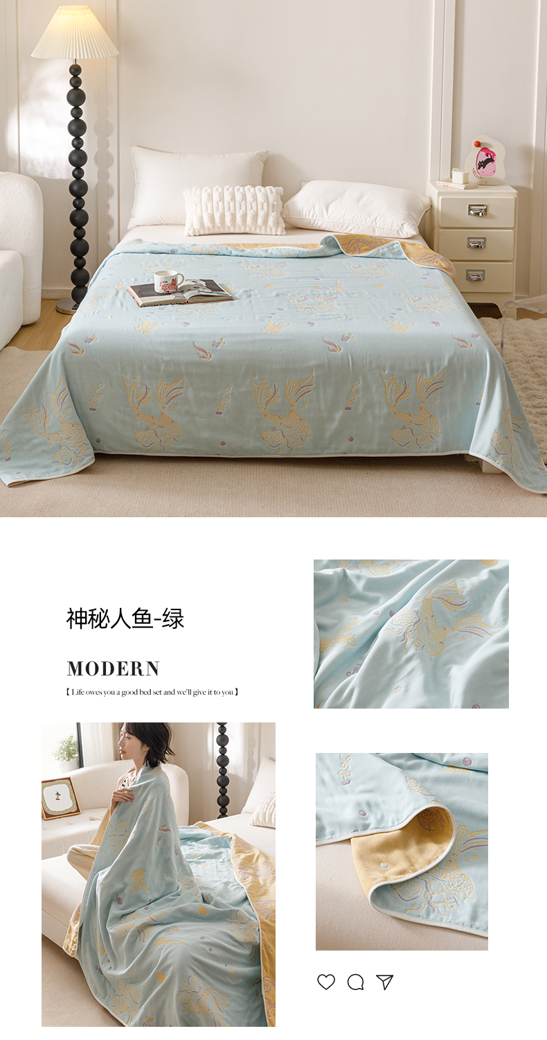 悦然毛巾被 2025新款全棉6层纱毛巾被 神秘人鱼绿