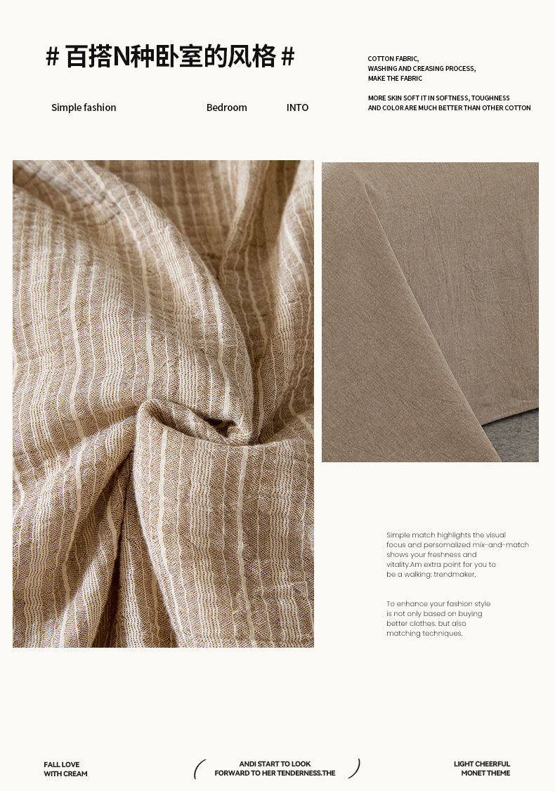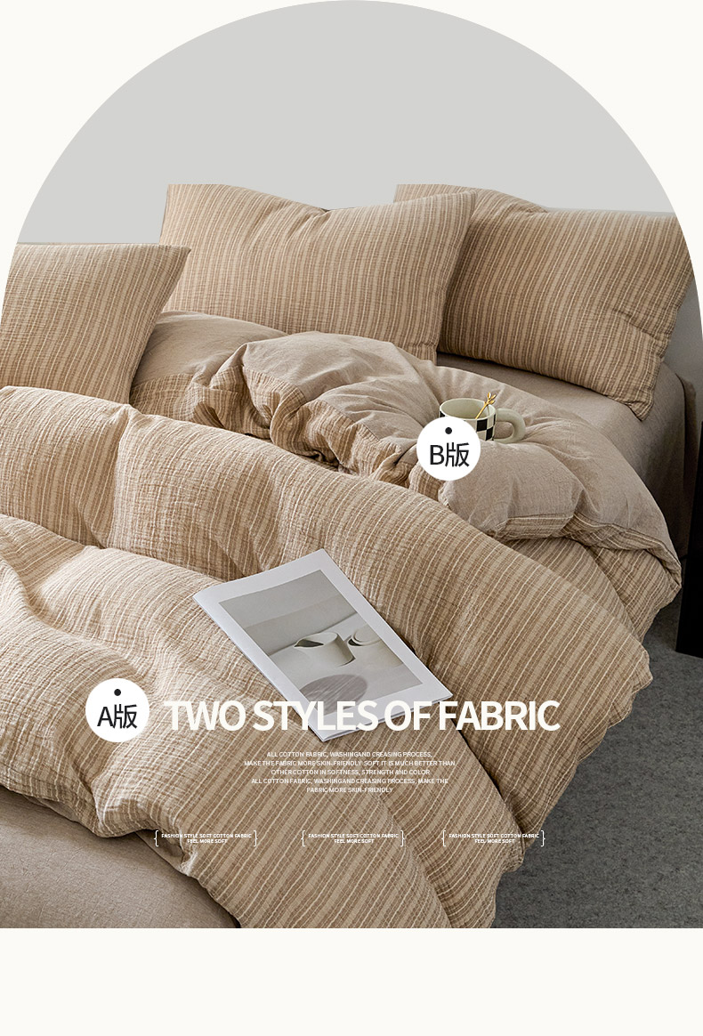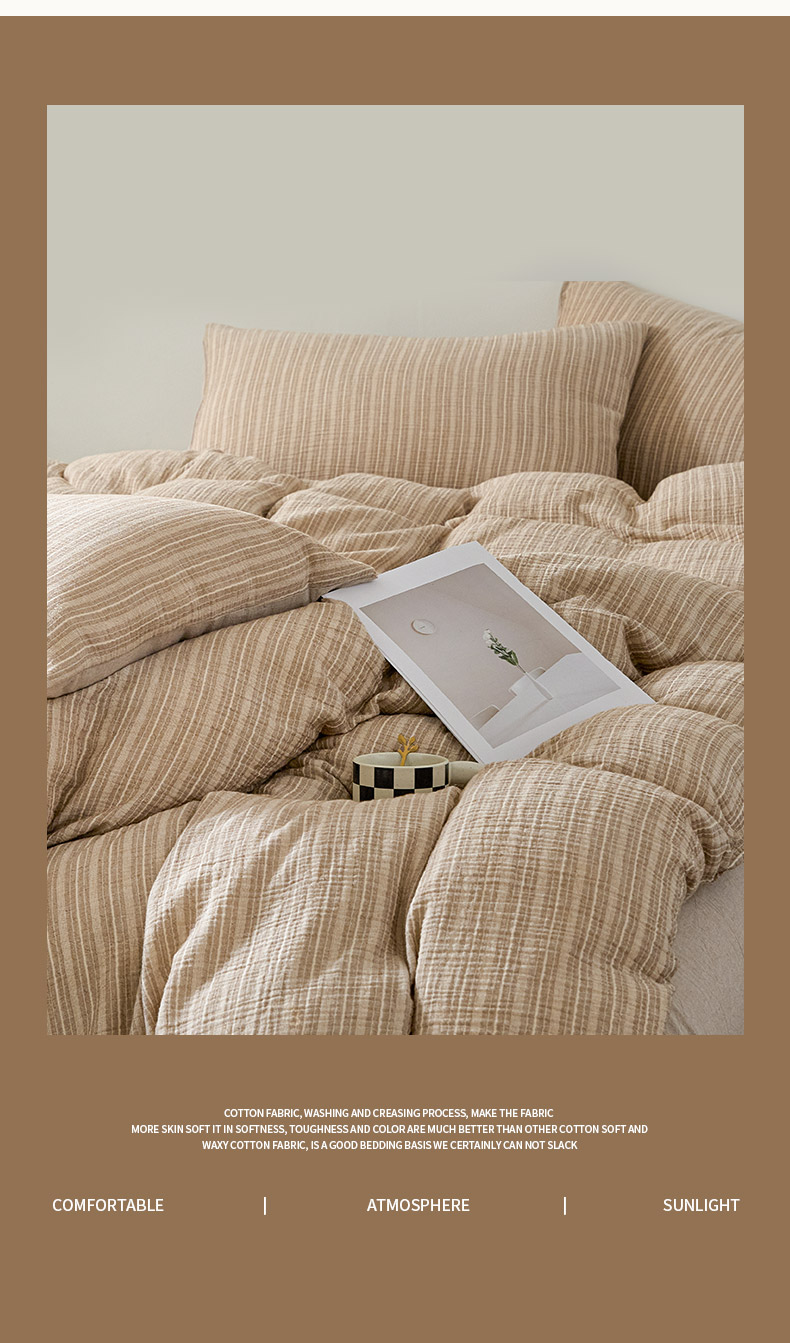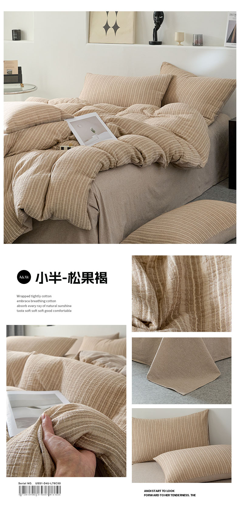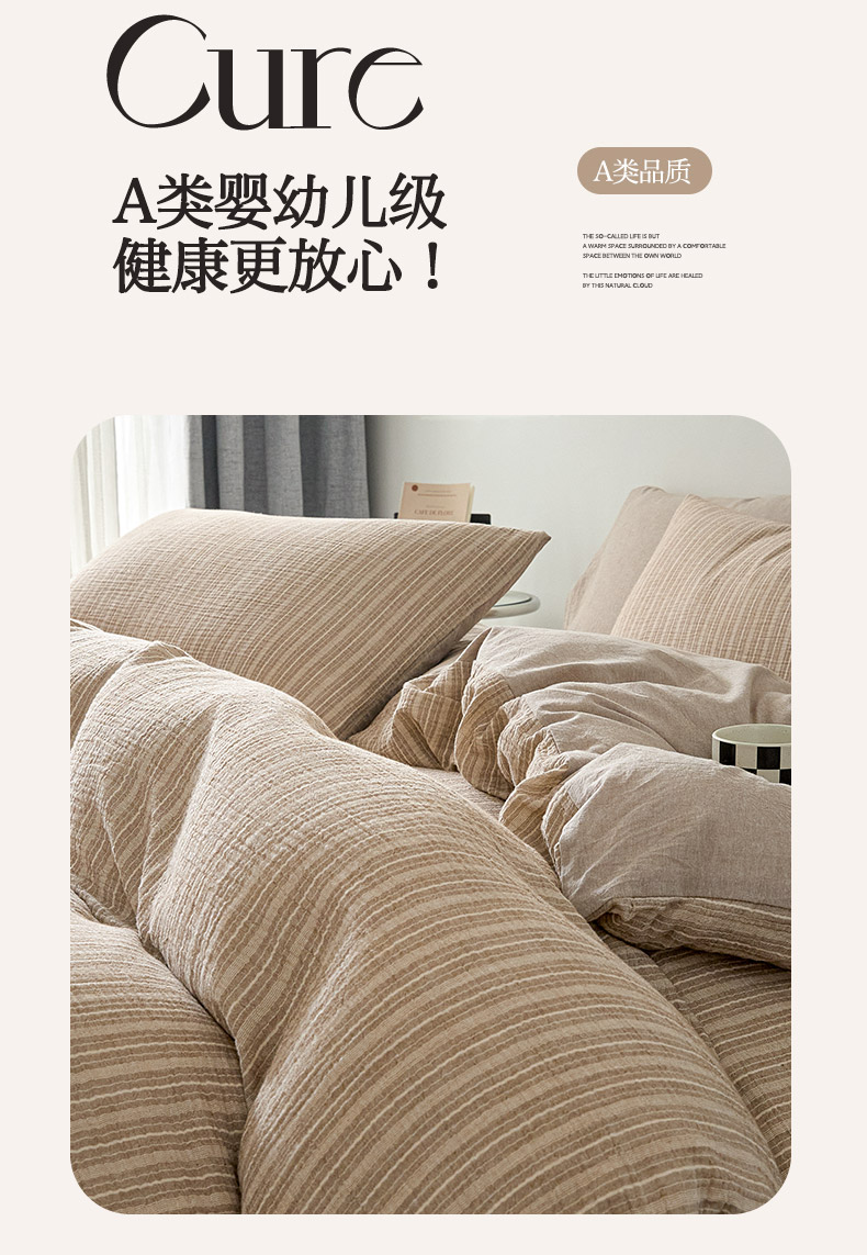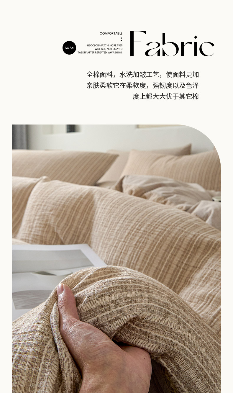 当前位置: 91家纺网 > 商品网购 > 床品套件 > 四件套 > 全棉普通四件套 > AB家纺 2025新款三层款皱皱纱条纹四件套 小半-松果褐