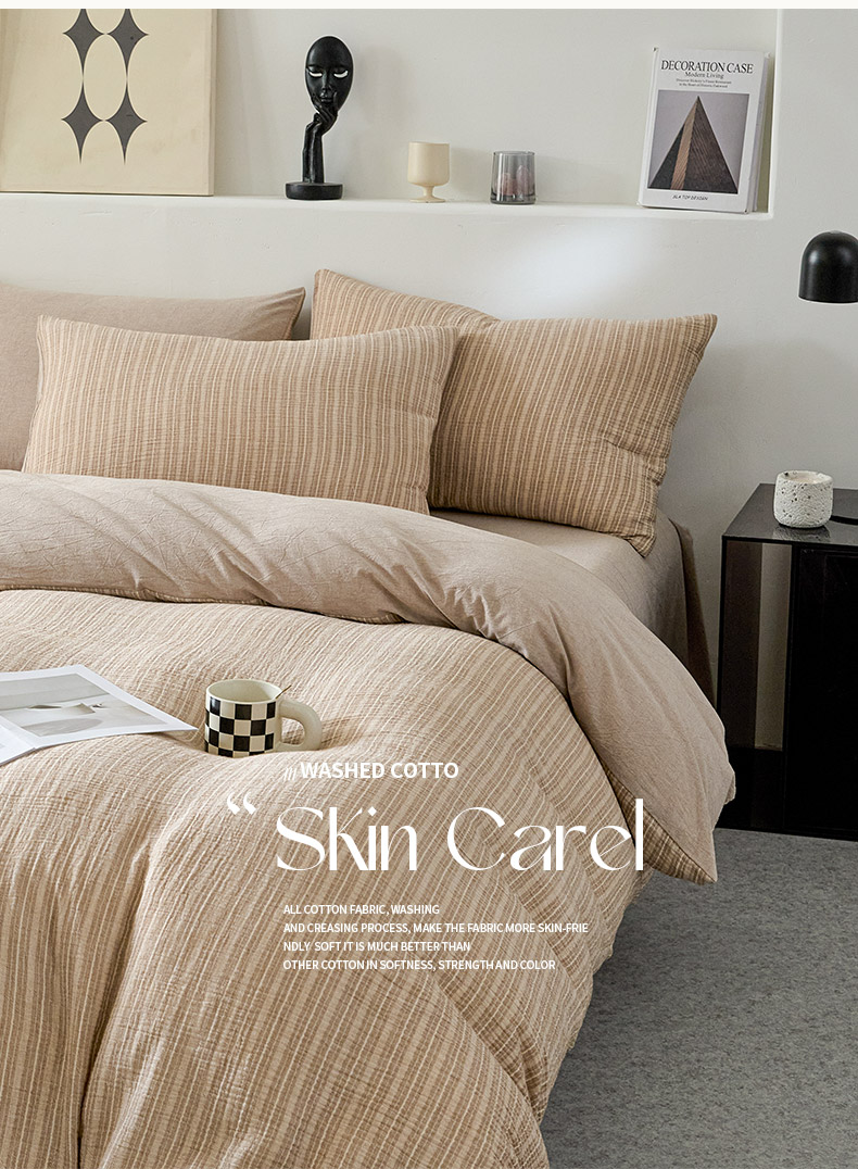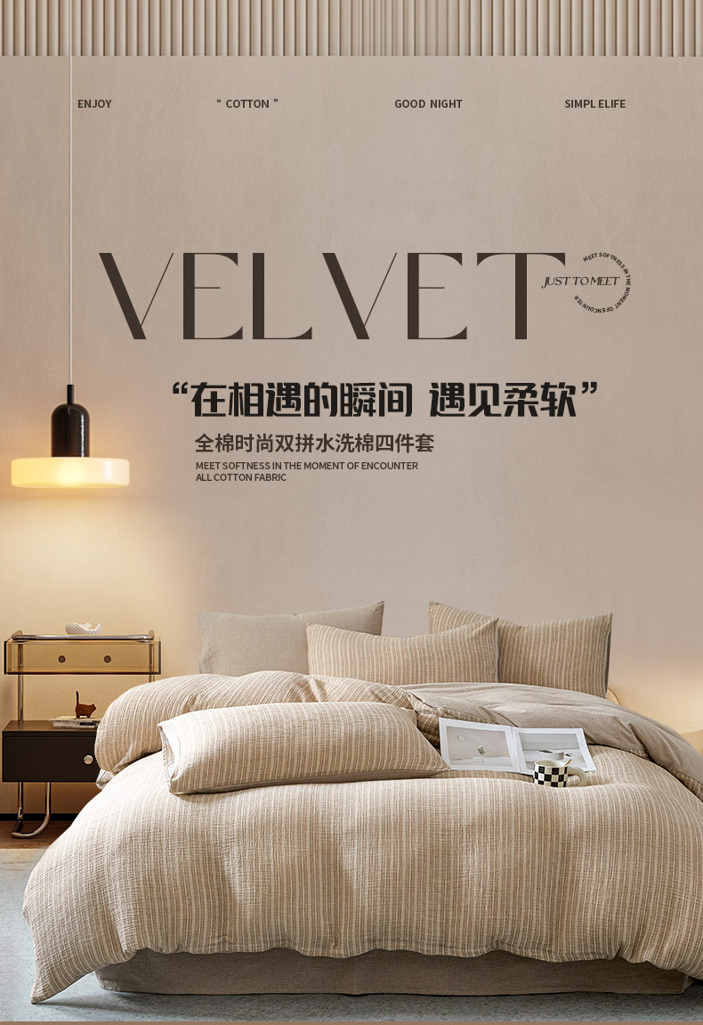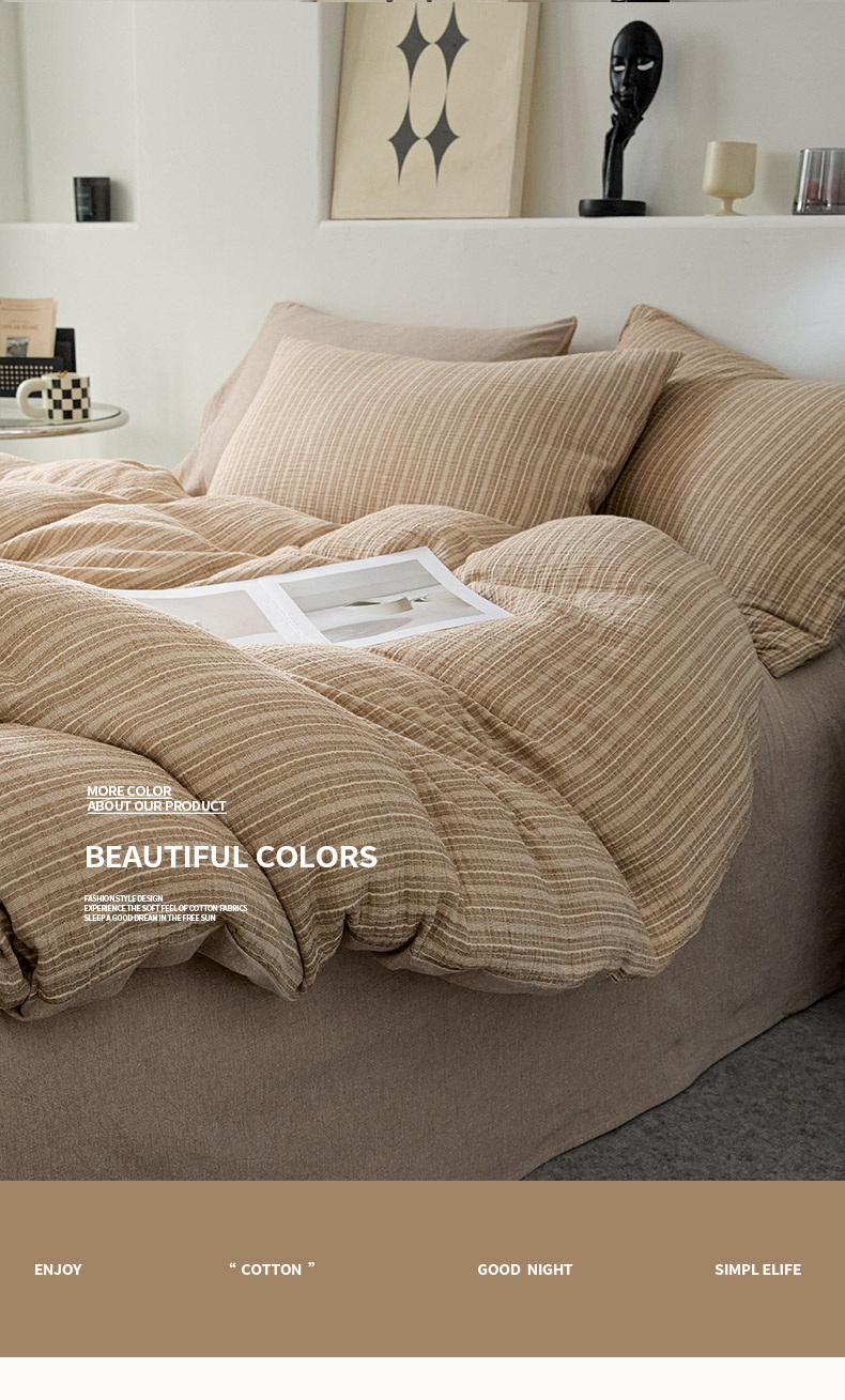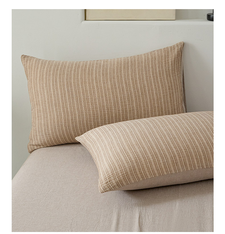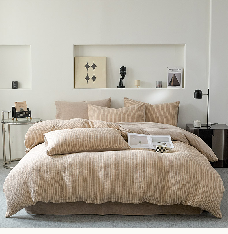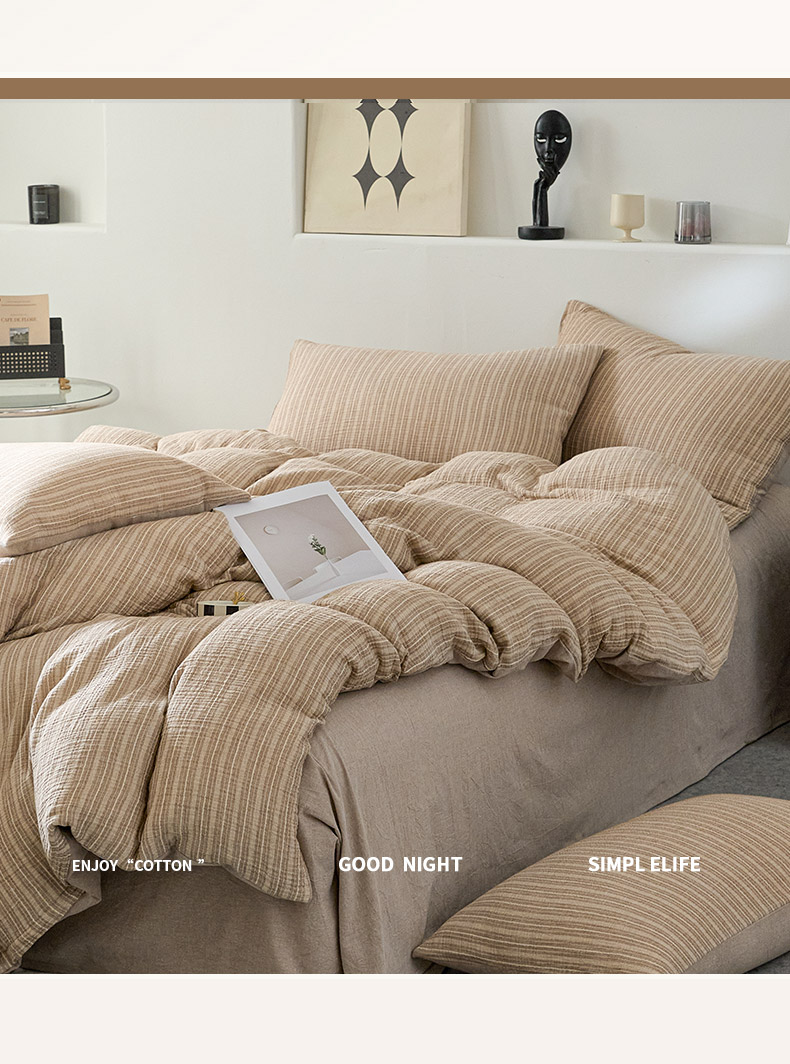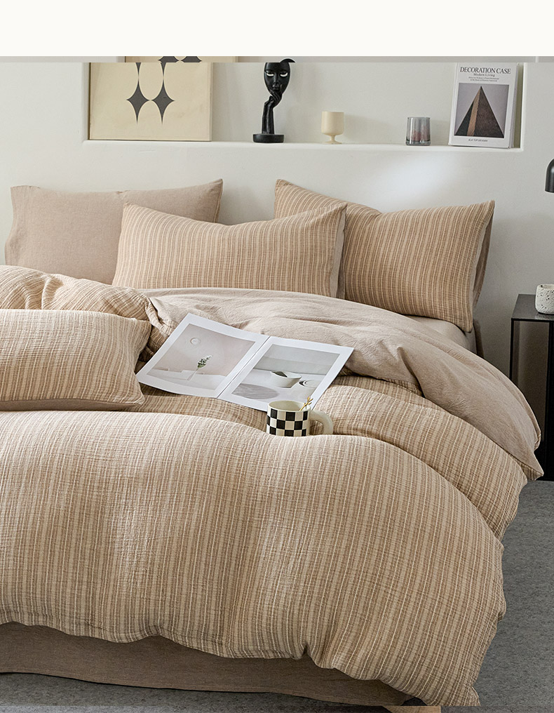 当前位置: 91家纺网 > 商品网购 > 床品套件 > 四件套 > 全棉普通四件套 > AB家纺 2025新款三层款皱皱纱条纹四件套 小半-松果褐