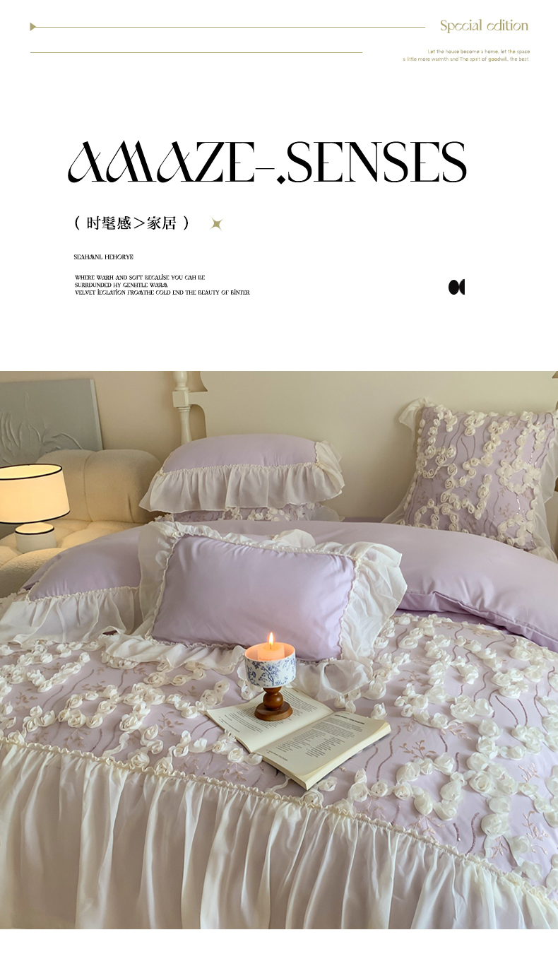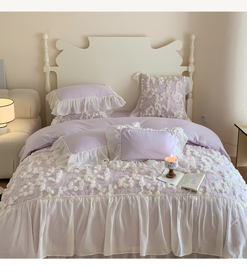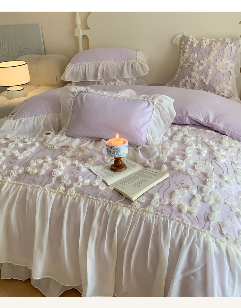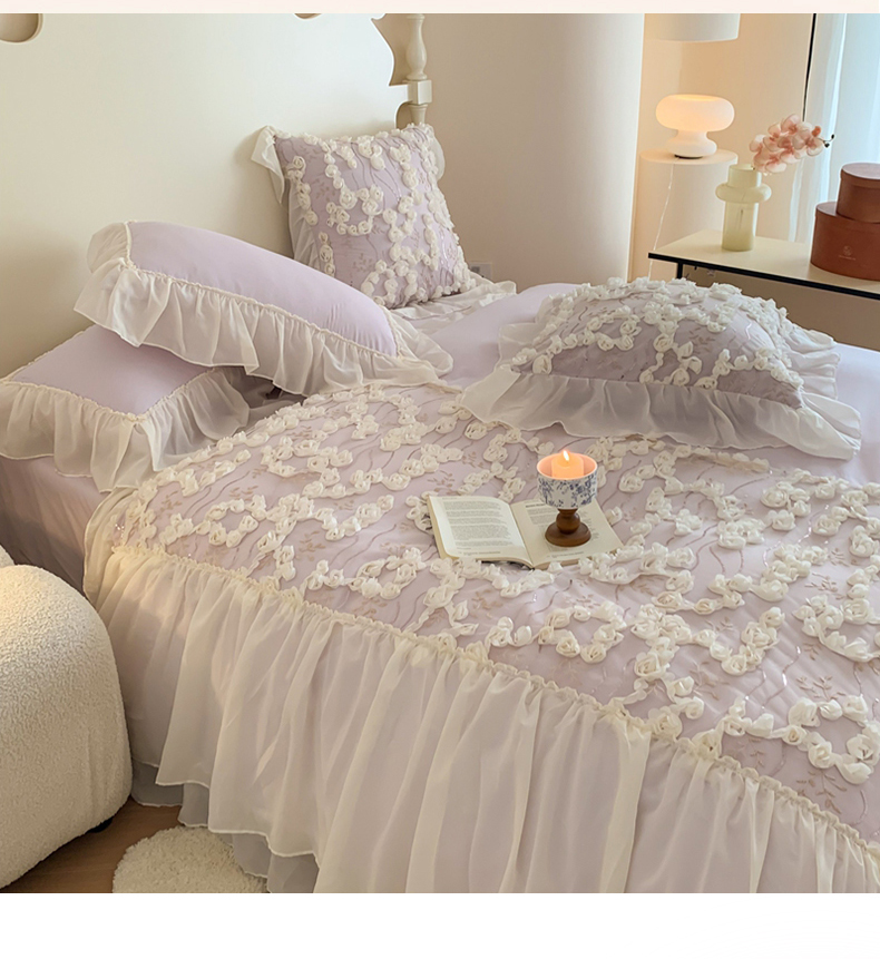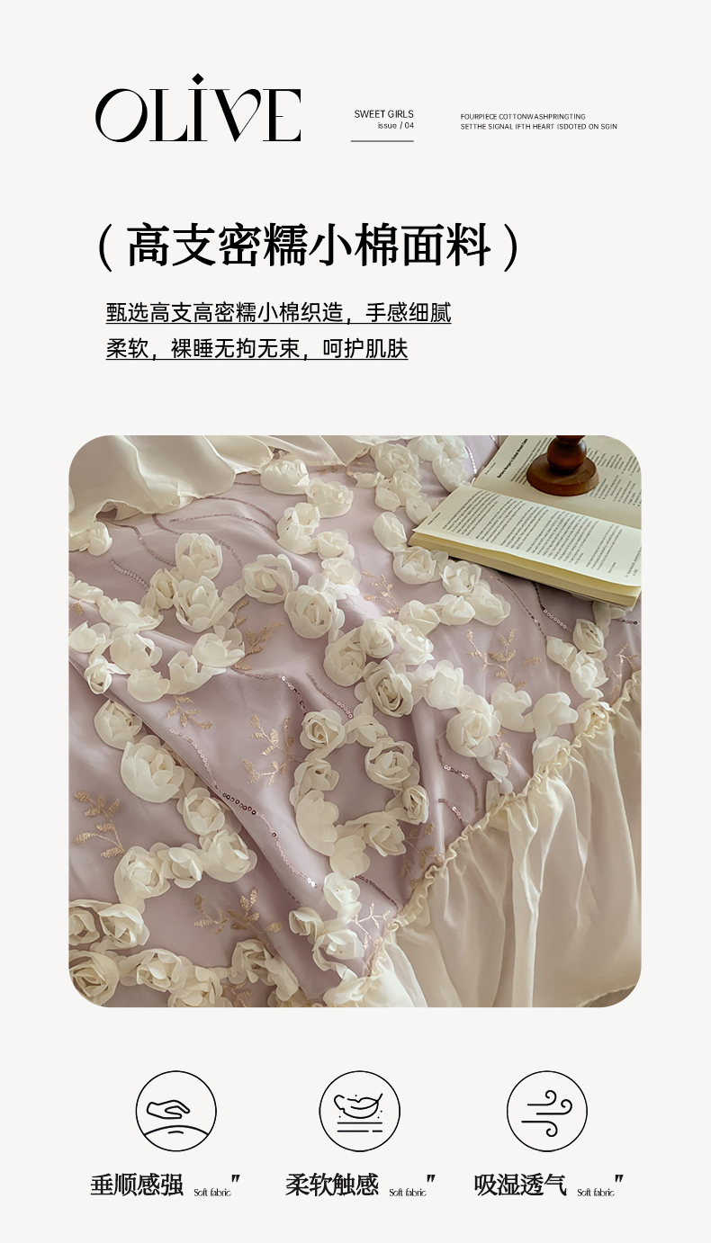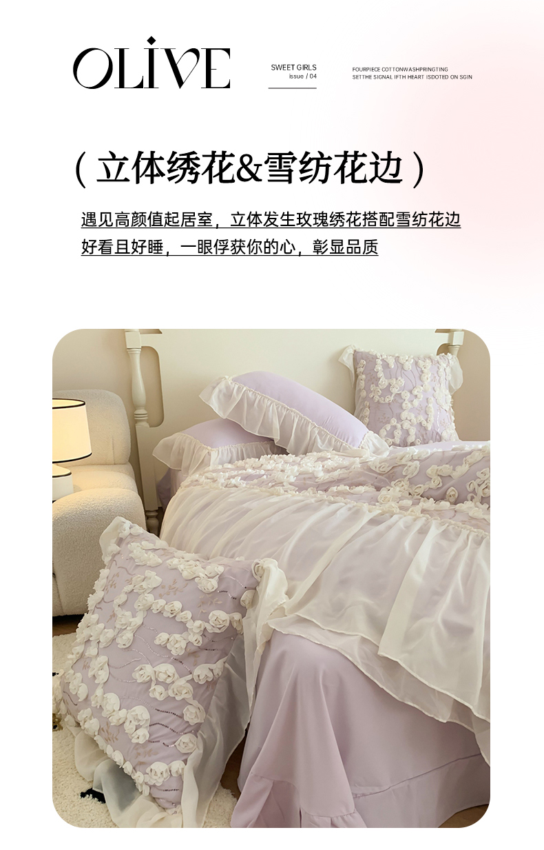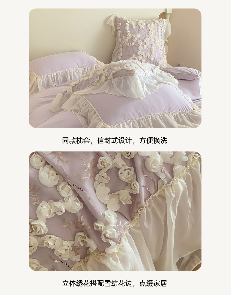 当前位置: 91家纺网 > 商品网购 > 床品套件 > 四件套 > 其它四件套 > 吾欢心2025新款 A类糯小棉立体绣花雪纺花边四件套(玫瑰故事系列) 玫瑰故事紫