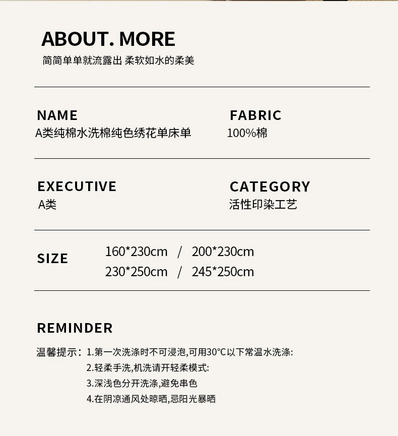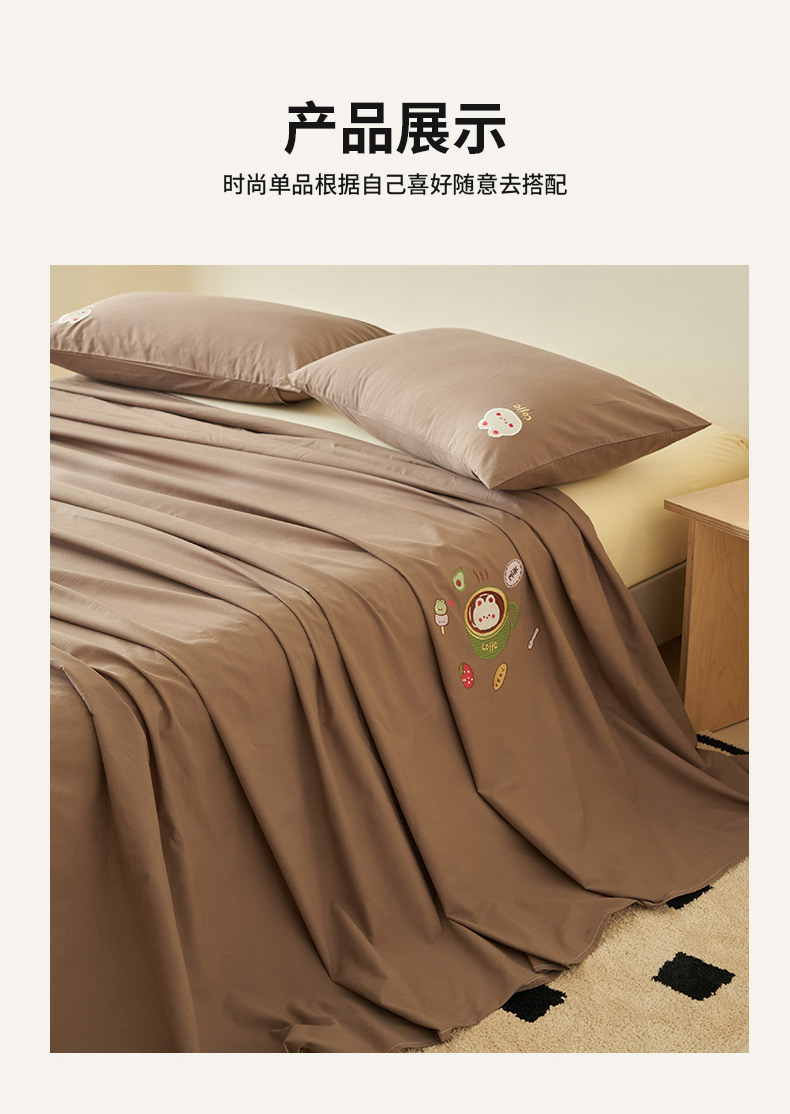 • 91家纺网 家纺一手货源 找家纺 寐绸家纺 2025新款纯棉水洗棉纯色绣花单床单 纯棉绣花床单-棕色