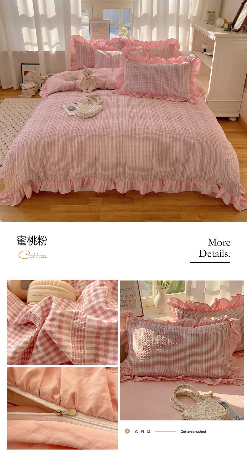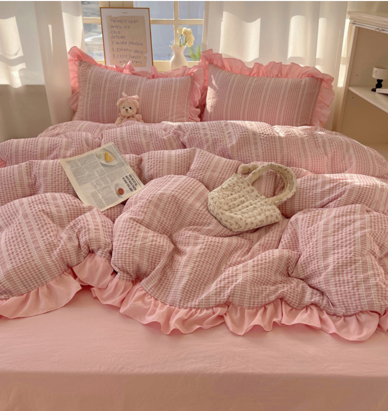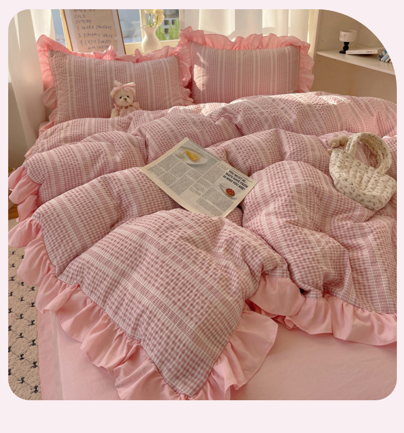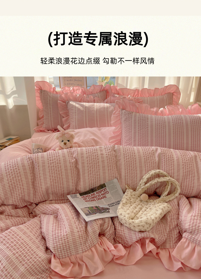 (总)十里居 2025新款泡泡纱提花韩版水洗棉公主格花边款四件套