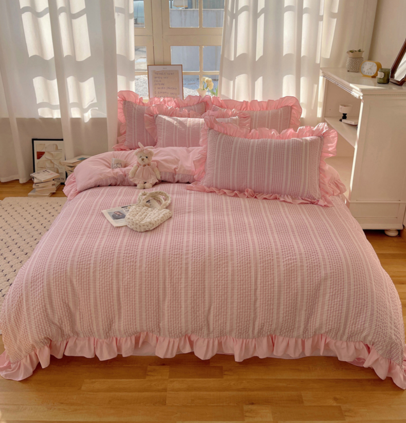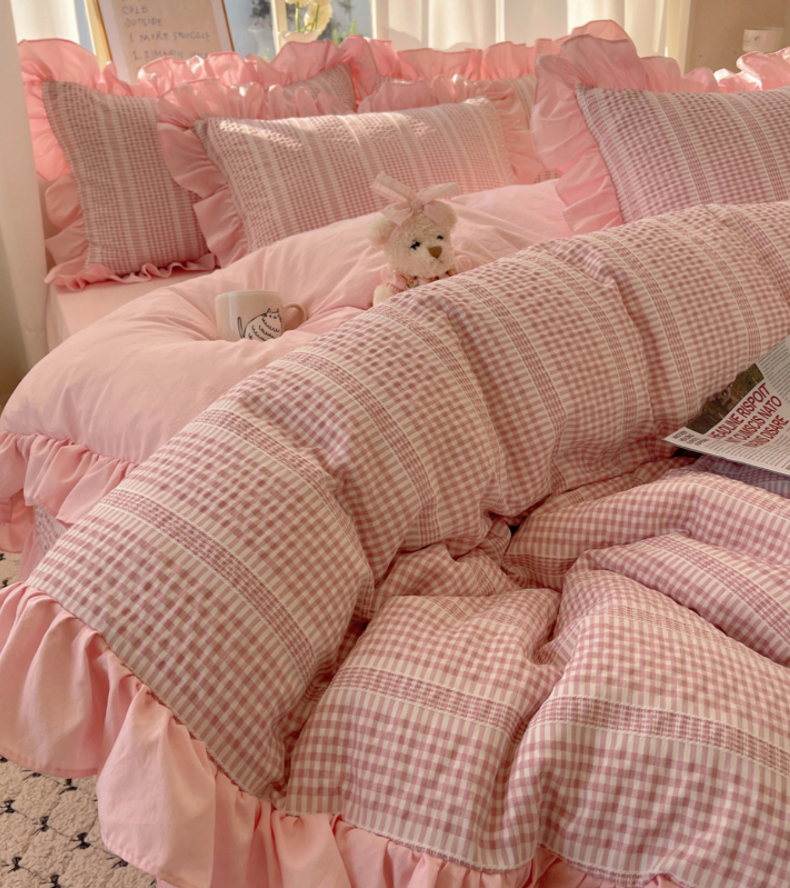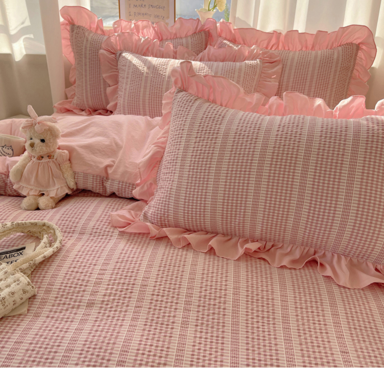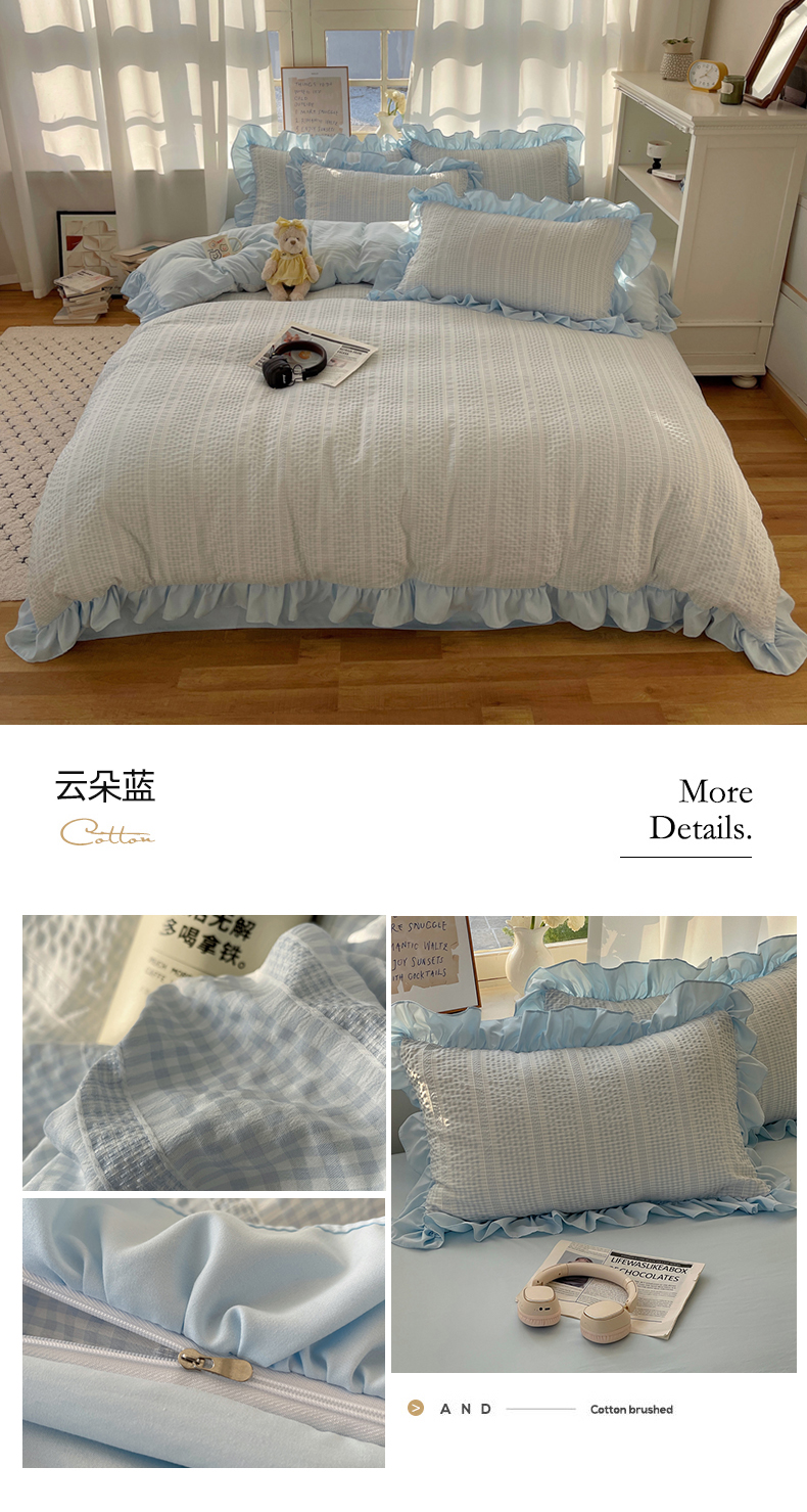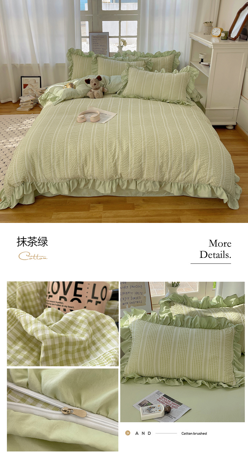 (总)十里居 2025新款泡泡纱提花韩版水洗棉公主格花边款四件套
