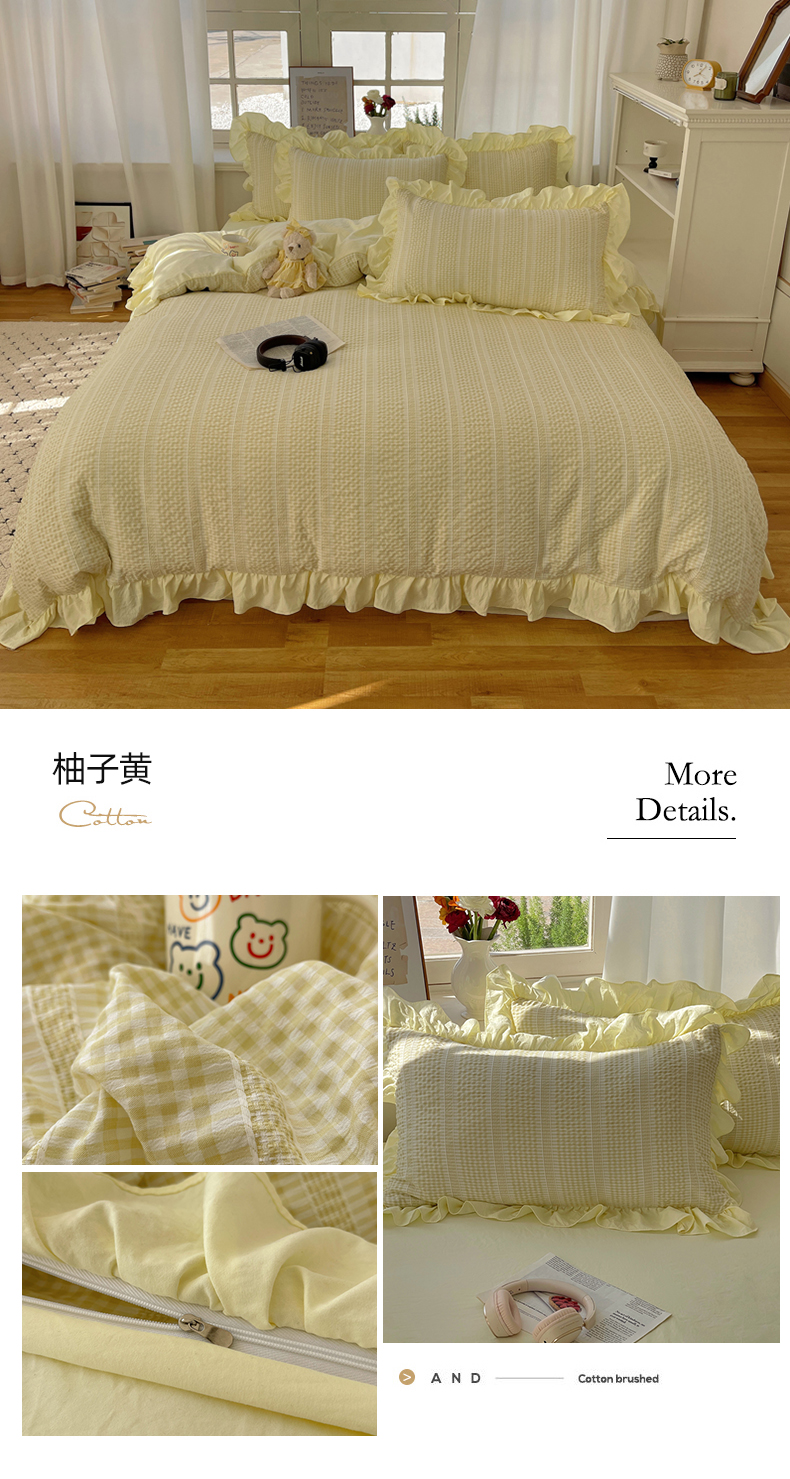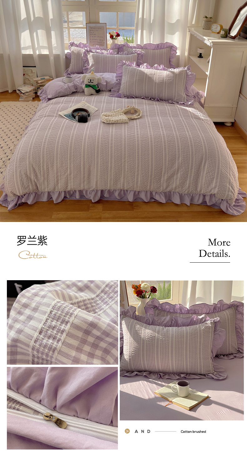 (总)十里居 2025新款泡泡纱提花韩版水洗棉公主格花边款四件套,罗兰紫,蜜桃粉,抹茶绿,柚子黄,月光灰,云朵蓝