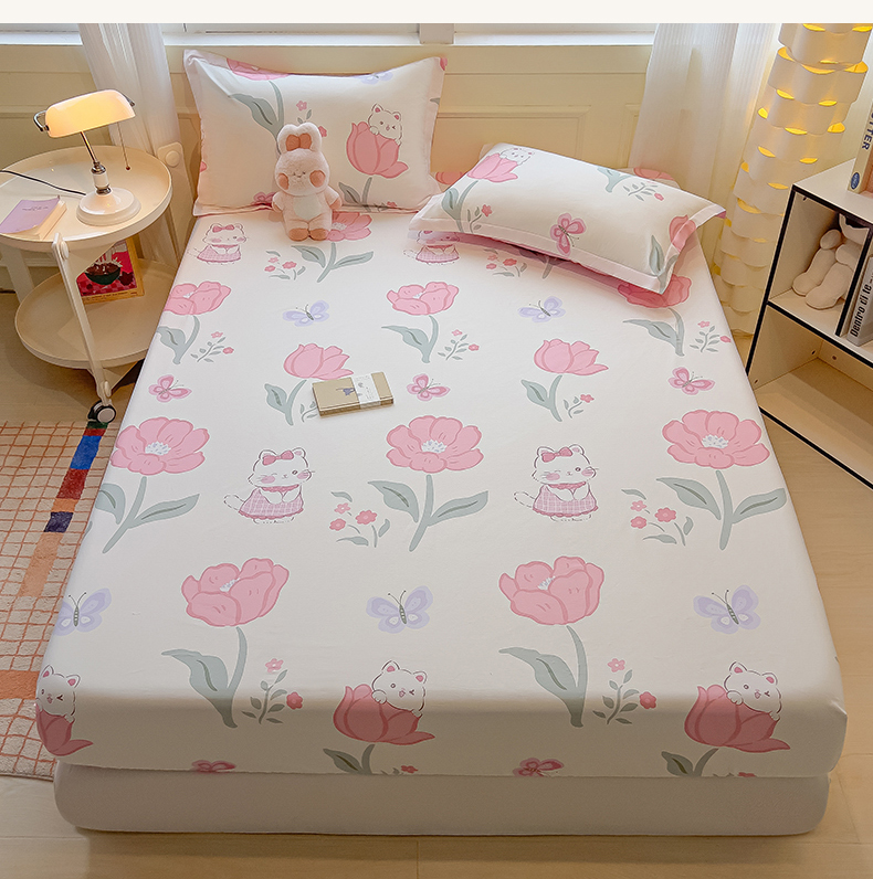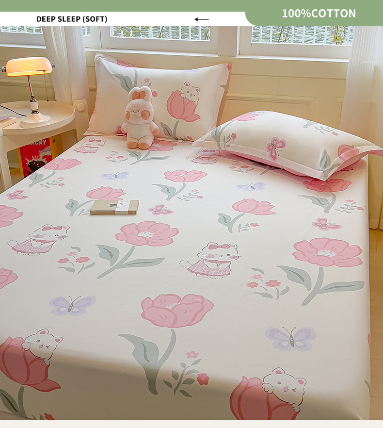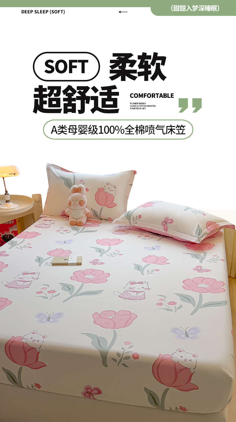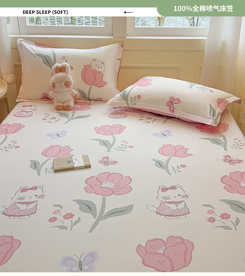 拾物记 2025新款A类无荧光全喷气全棉12868单床笠 花欣猫趣-粉