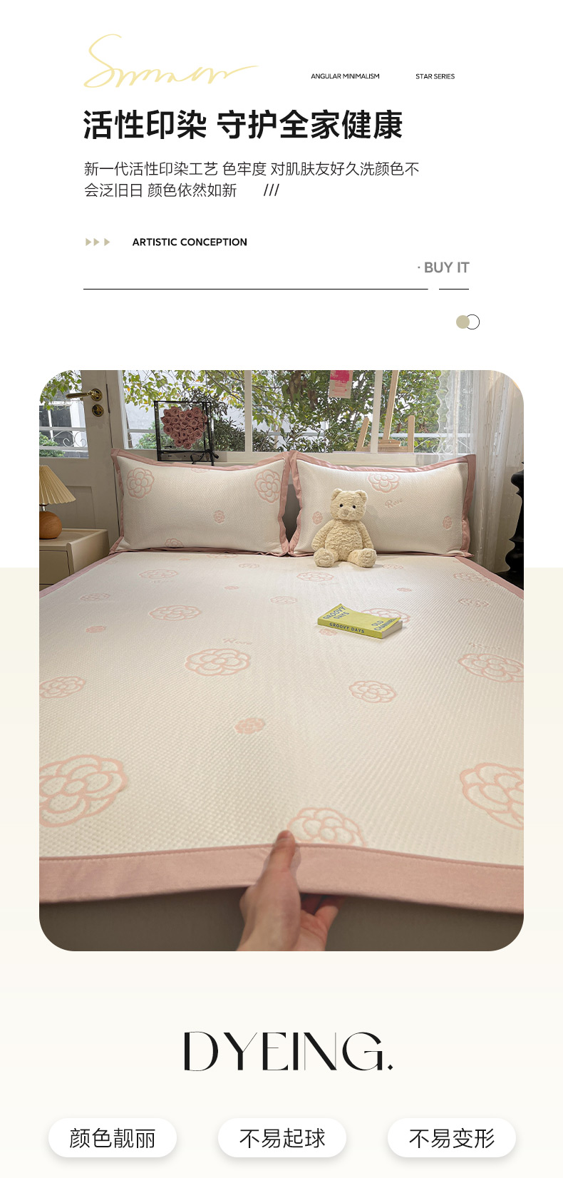 商品名称:雅居纺家纺 2025春夏新款A类加厚三明治底提花凉感席床席款 山茶花