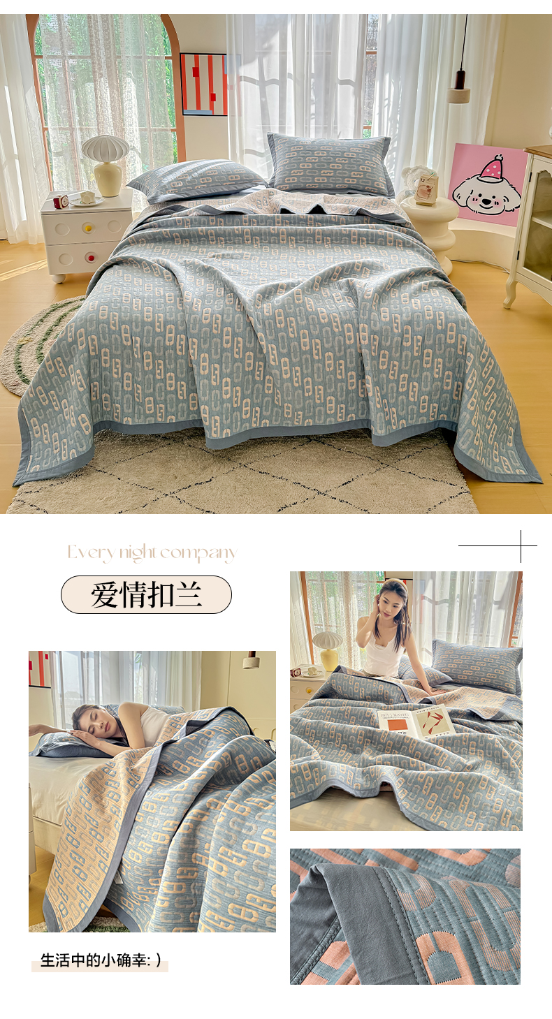 • 91家纺网 家纺一手货源 找家纺 棠薇家纺2025新款简约风多功能纱布盖毯纱布毯子毛巾被床盖沙发巾单毯枕巾枕套三件套 爱情扣兰