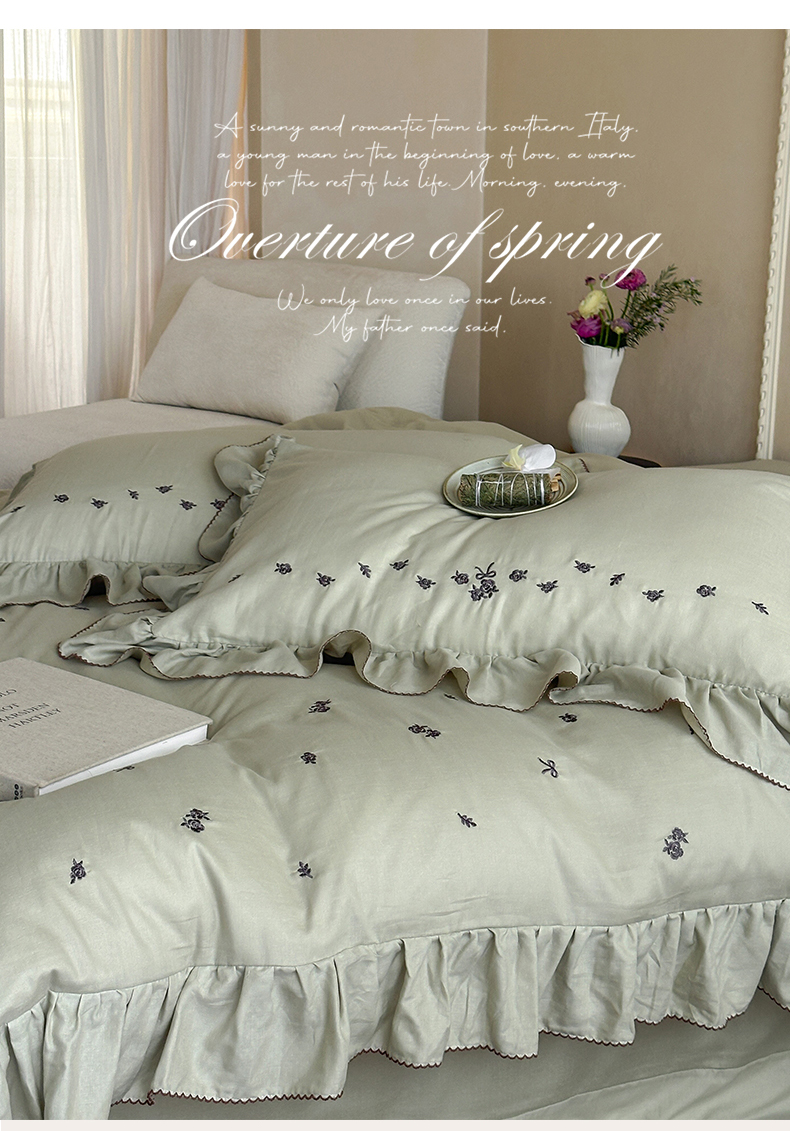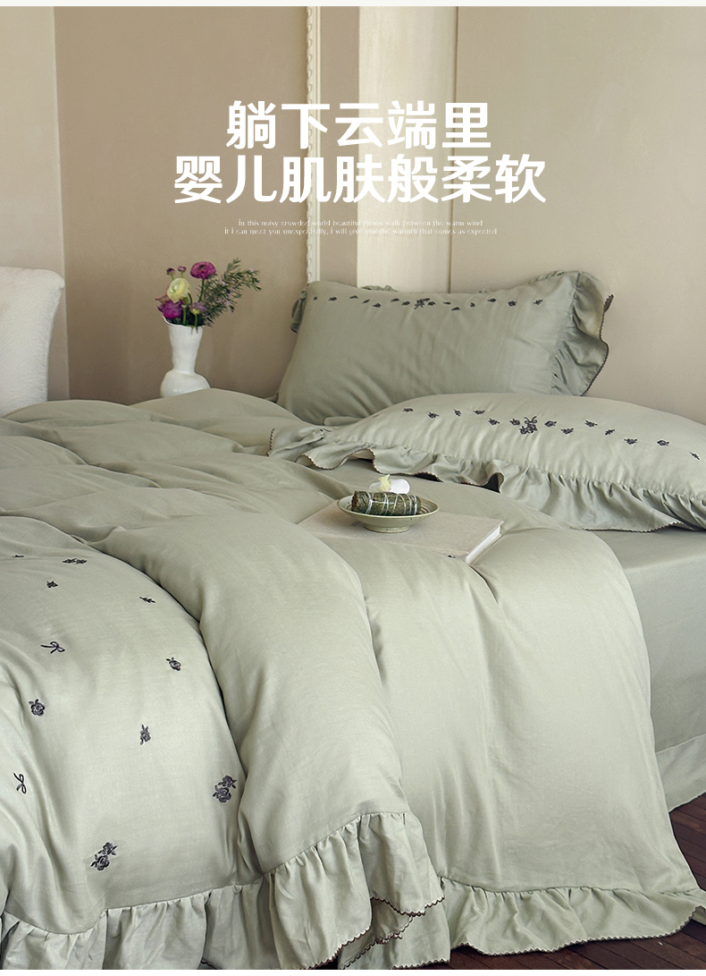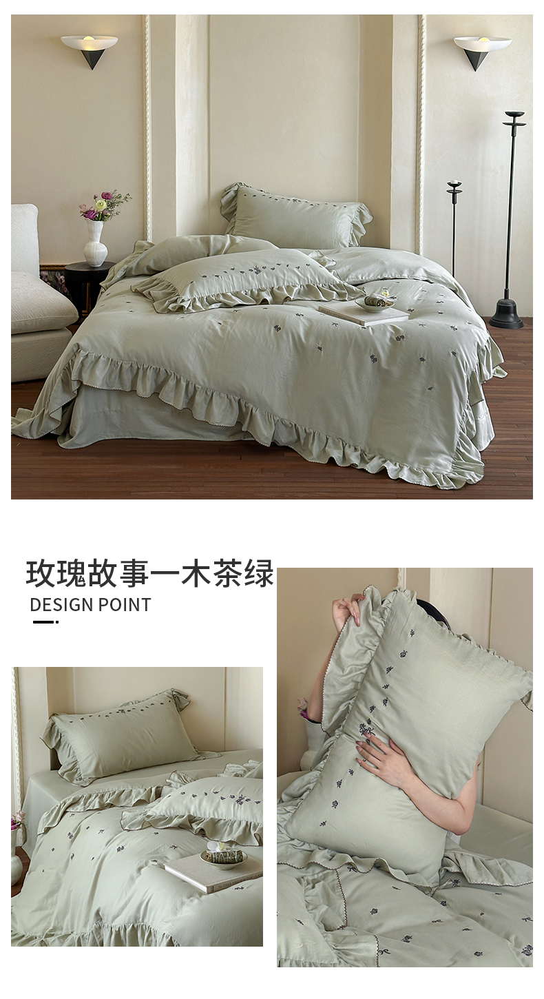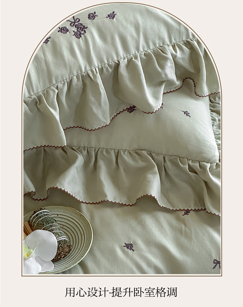 商品名称:名品优仓 2025新款纯棉水洗棉双层纱提花韩版花边四件套 玫瑰故事 玫瑰故事一木茶绿