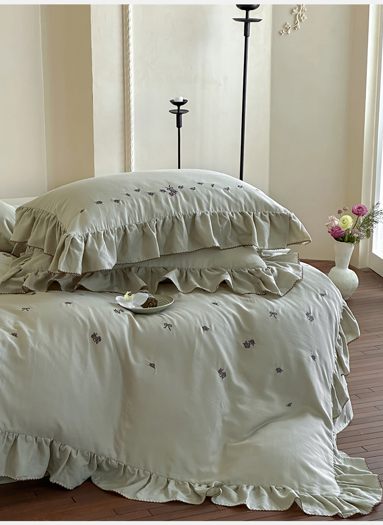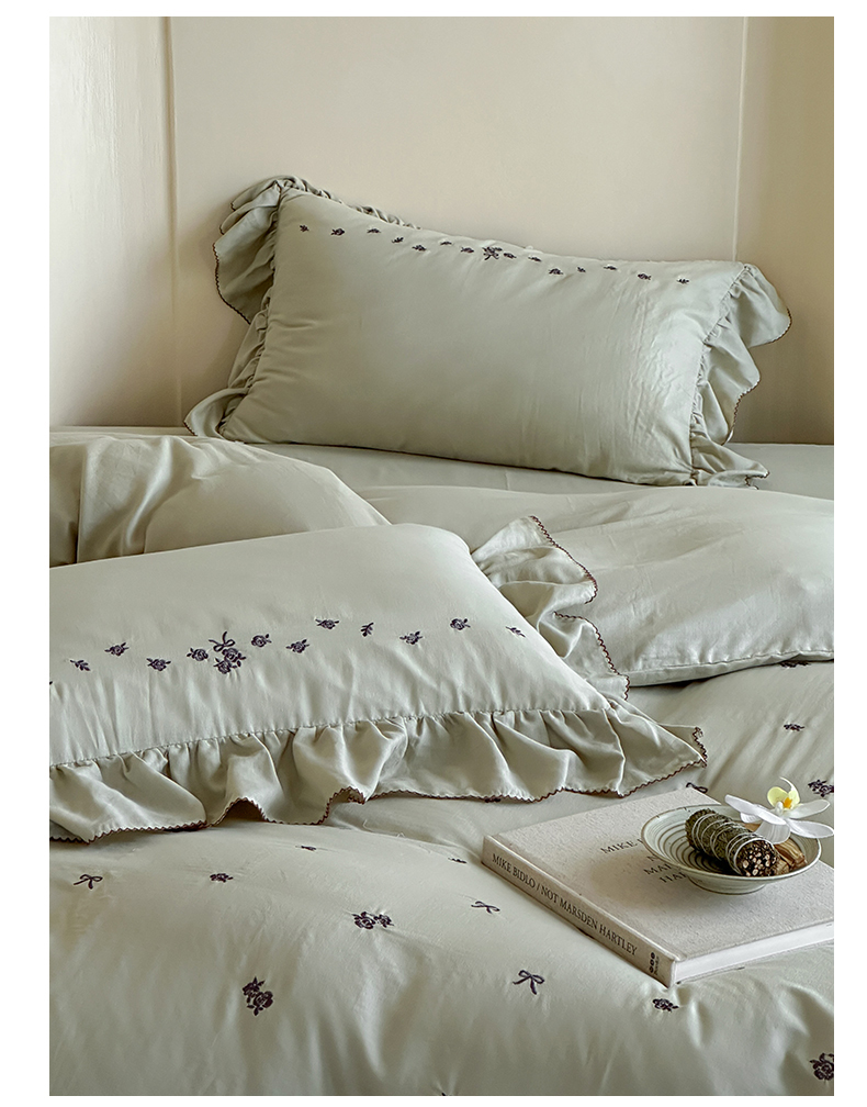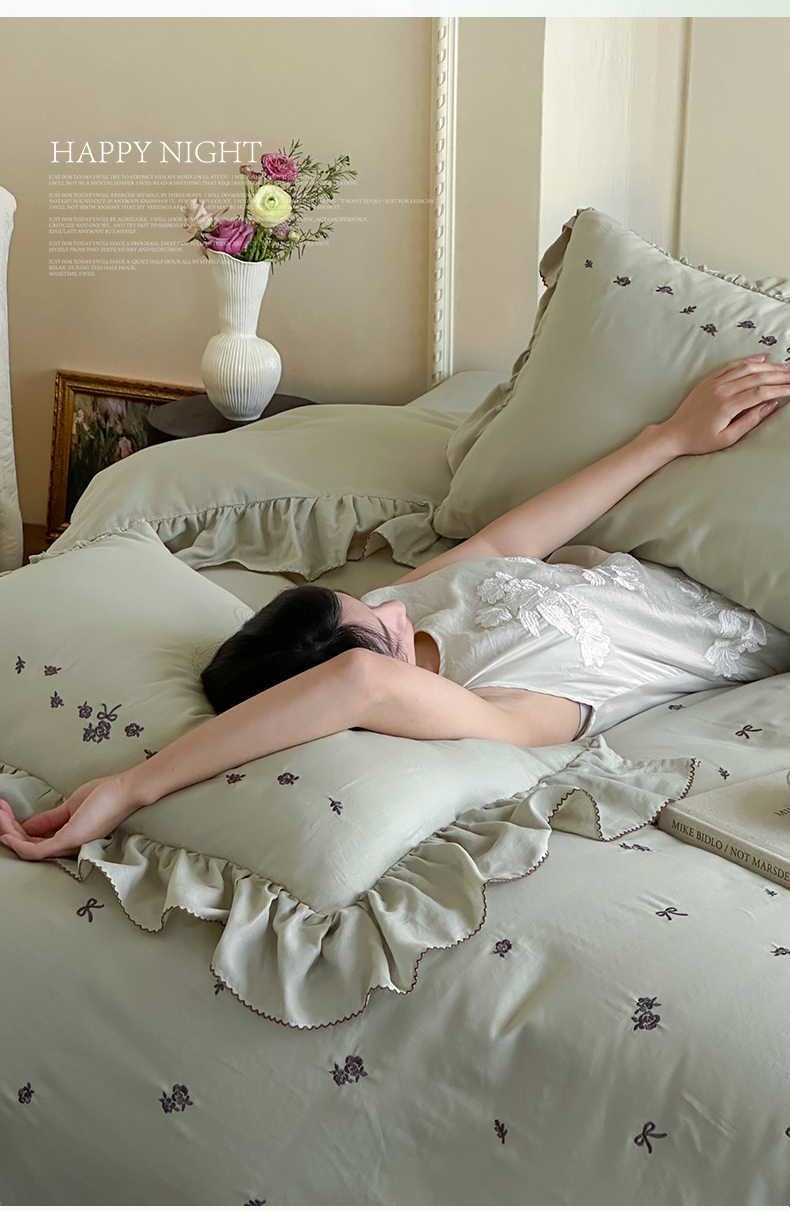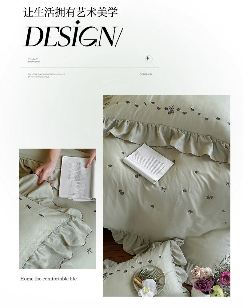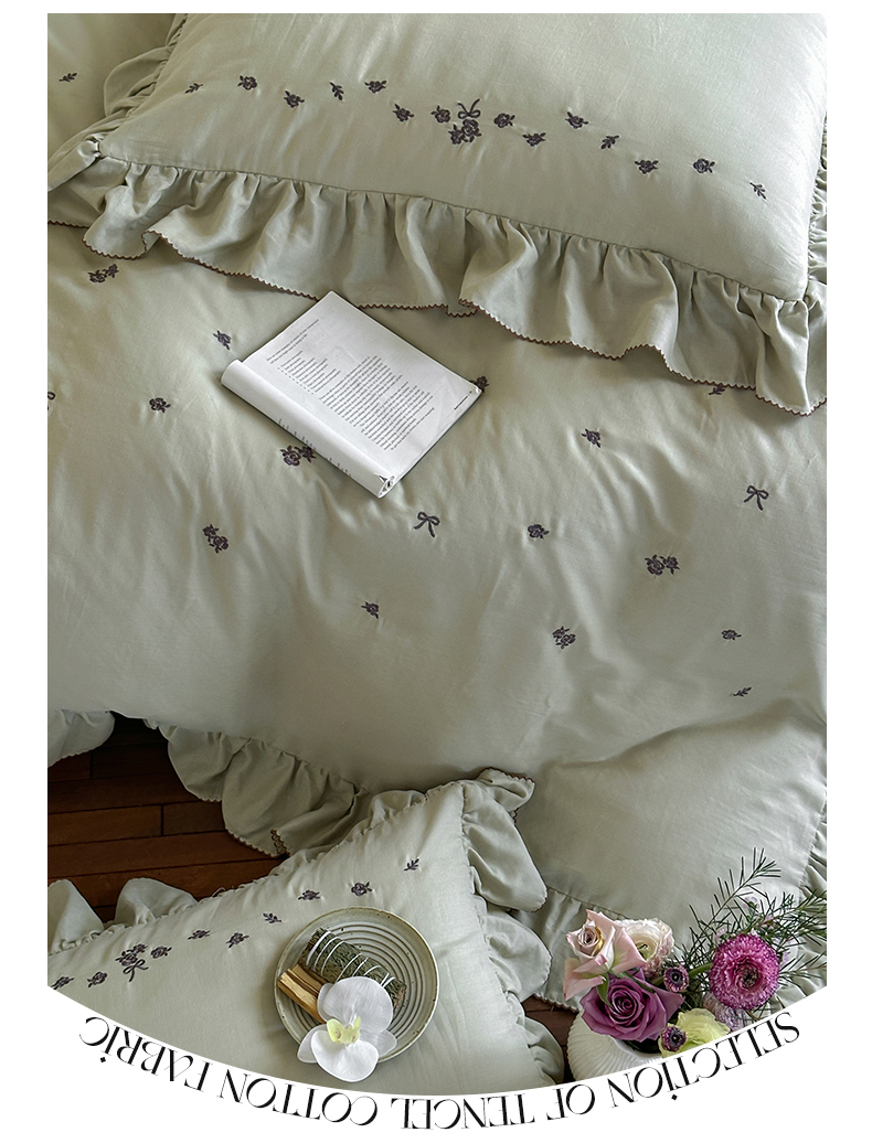 商品名称:名品优仓 2025新款纯棉水洗棉双层纱提花韩版花边四件套 玫瑰故事 玫瑰故事一木茶绿