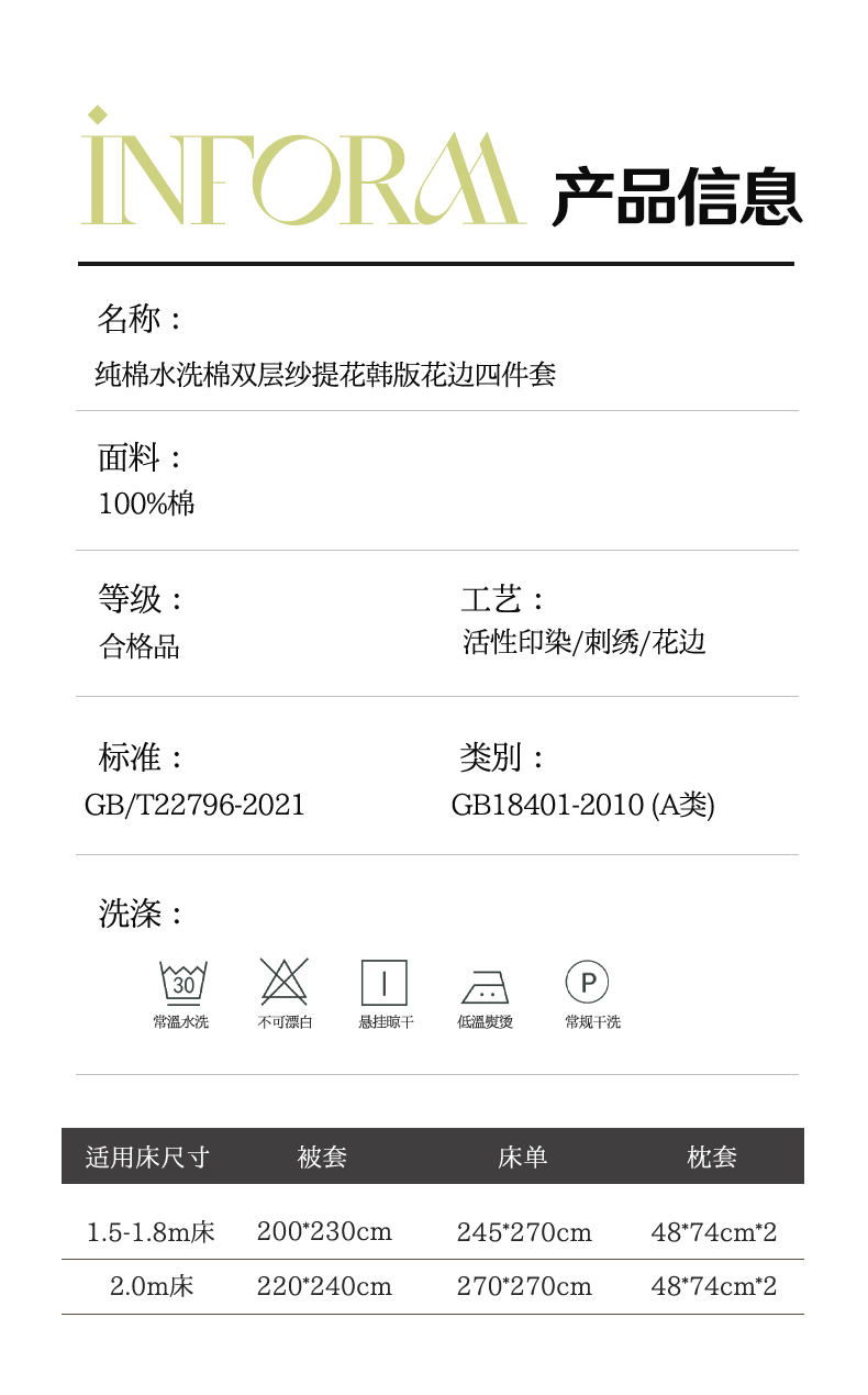 (总)名品优仓2023款水洗棉三层纱提花四件套-狡花系列,狡花白,狡花豆粉,狡花黄,狡花蓝色,狡花绿,狡花少女粉