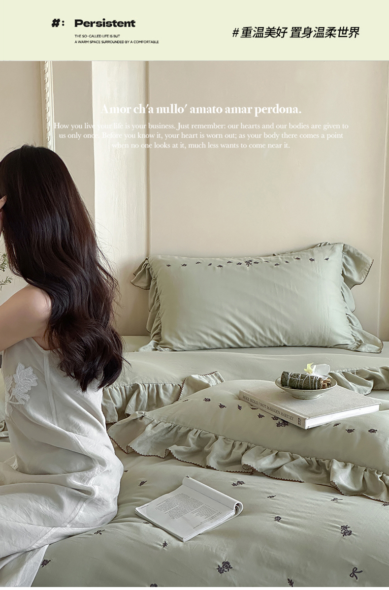 名品优仓 2025新款纯棉水洗棉双层纱提花韩版花边四件套 玫瑰故事 玫瑰故事一木茶绿