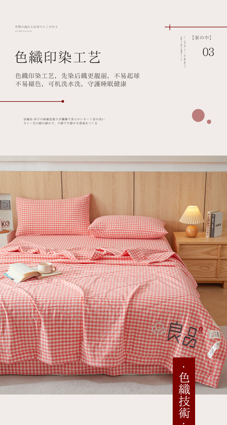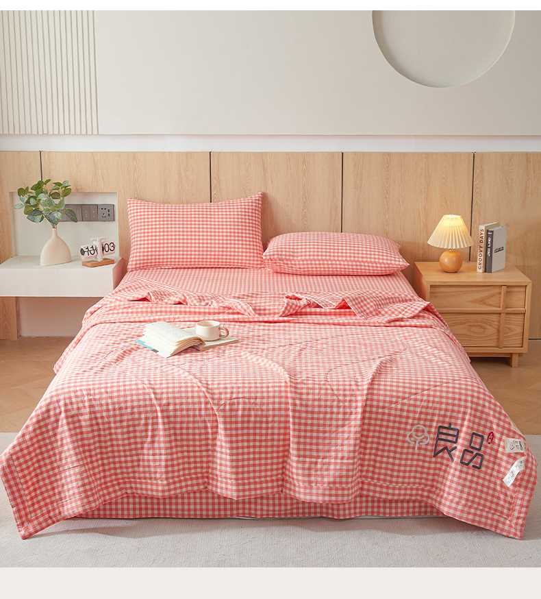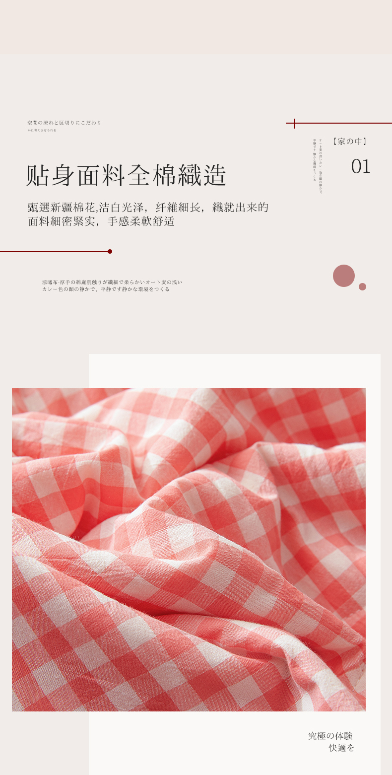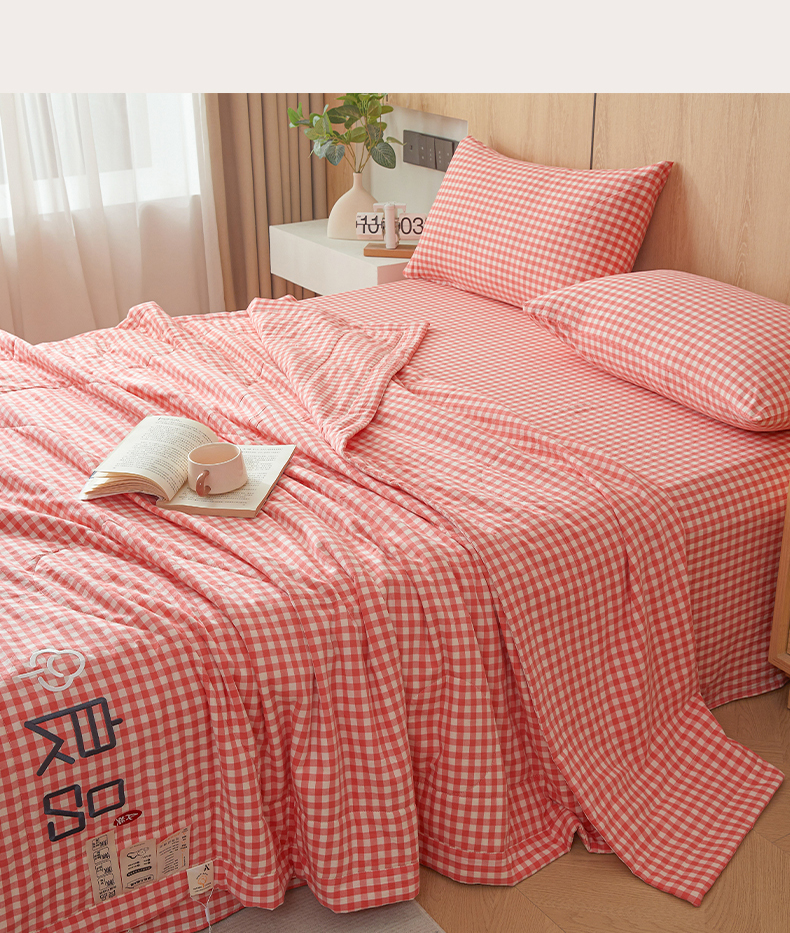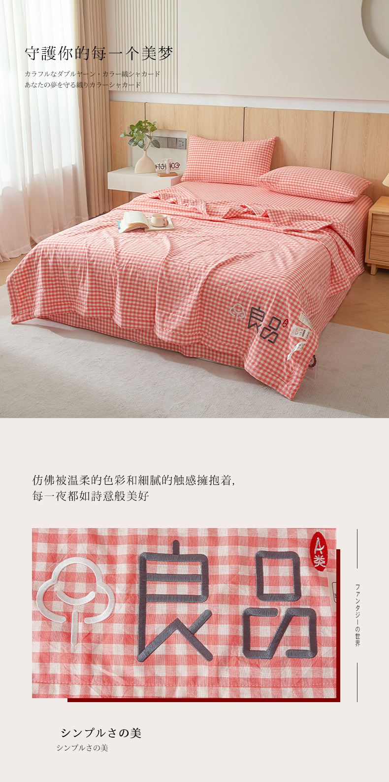 当前位置: 91家纺网 > 商品网购 > 床品套件 > 四件套 > 夏被四件套 > 悦织语 2025新款全棉水洗色织新疆棉100%棉花刺绣款无印风夏被四件套 粉小格