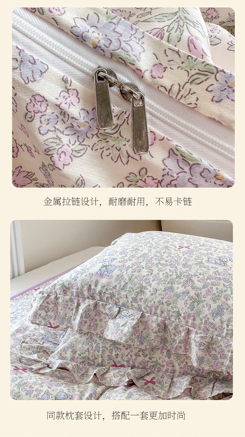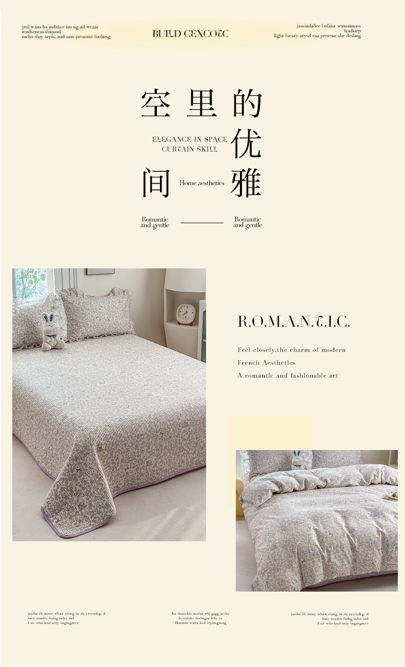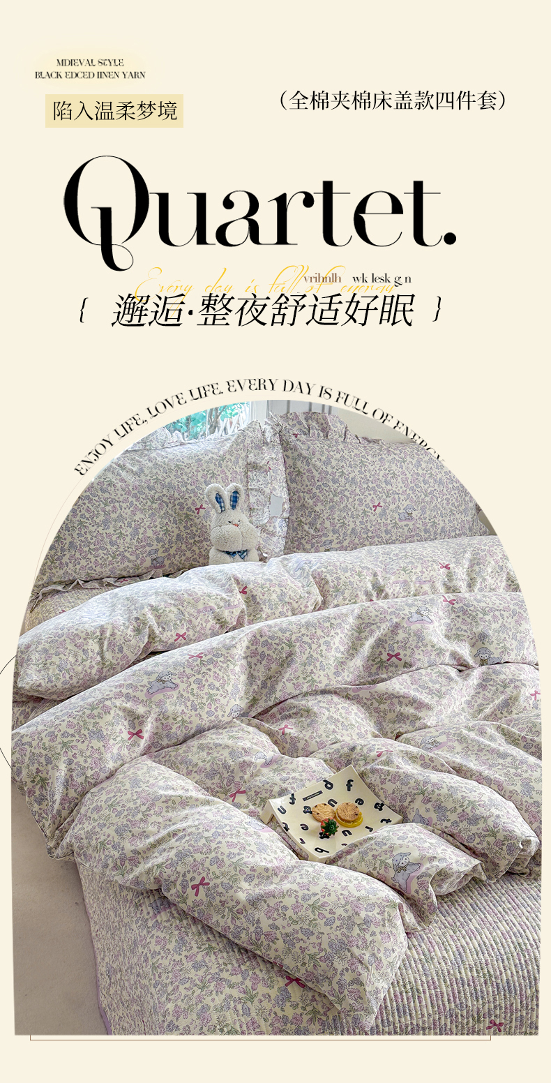 • 91家纺网 家纺一手货源 找家纺 嘉汀兰家居 2025新款13372单面全棉高温砂洗绗缝单床盖,床盖四件套(同款花边被套) 紫郁小羊
