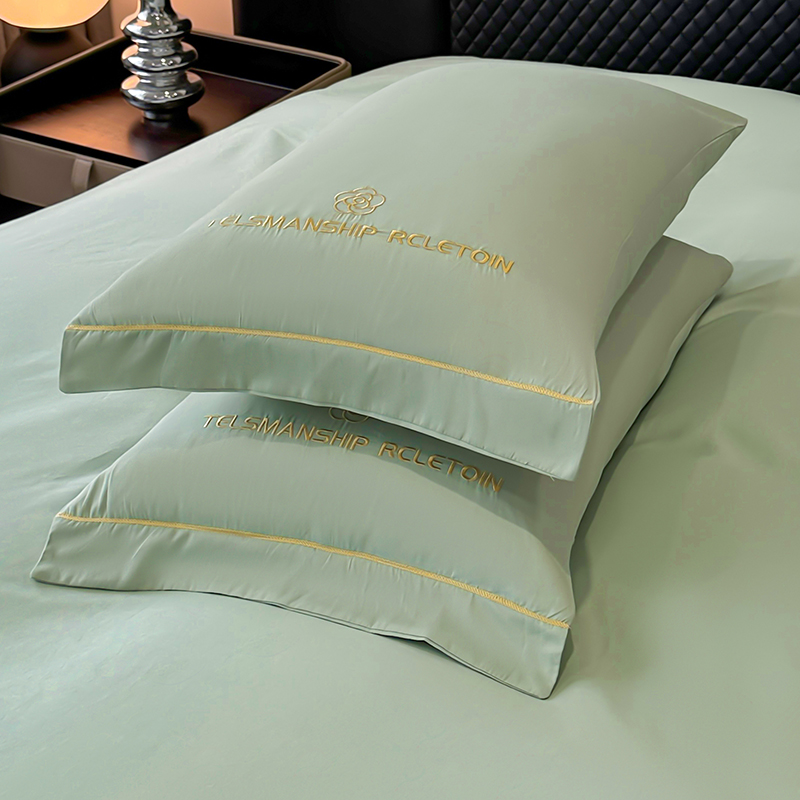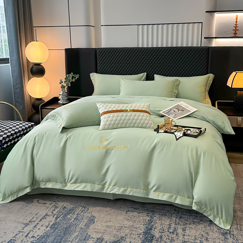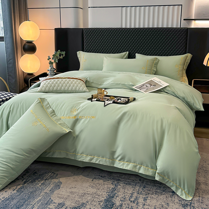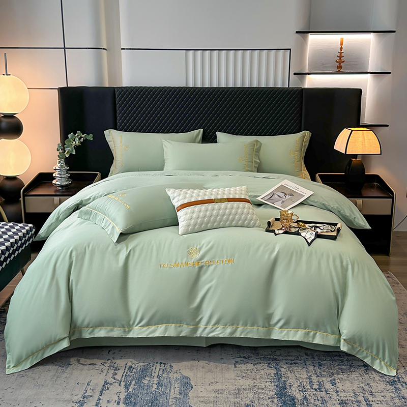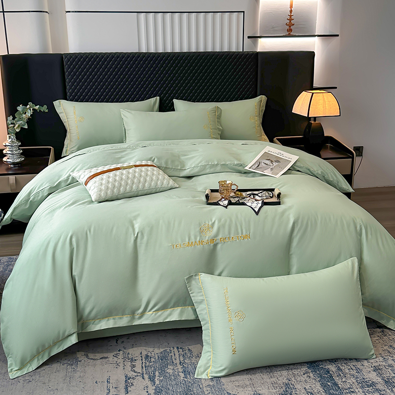 当前位置: 91家纺网 > 商品网购 > 床品套件 > 四件套 > 全棉普通四件套 > 宇彬家纺 2025直播新款13374全棉纯棉母婴级压线一字绣纯色刺绣四件套全棉纯棉贡缎新疆长绒字母款铂金系列 茶花-炫彩绿