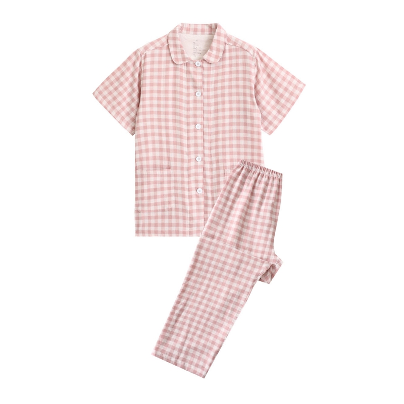 (总)伊嫚家居 2025新款日式无印风良品全棉双层纱睡衣女纯棉短袖短裤睡衣夏季纯棉短袖家居服,藏青波点男,藏青波点女,藏青小格男,藏青小格女,粉小格女,灰色波点男,灰色波点女,米色波点男,米色波点女,米色格男,米色格女,浅蓝小格男,浅蓝小格女