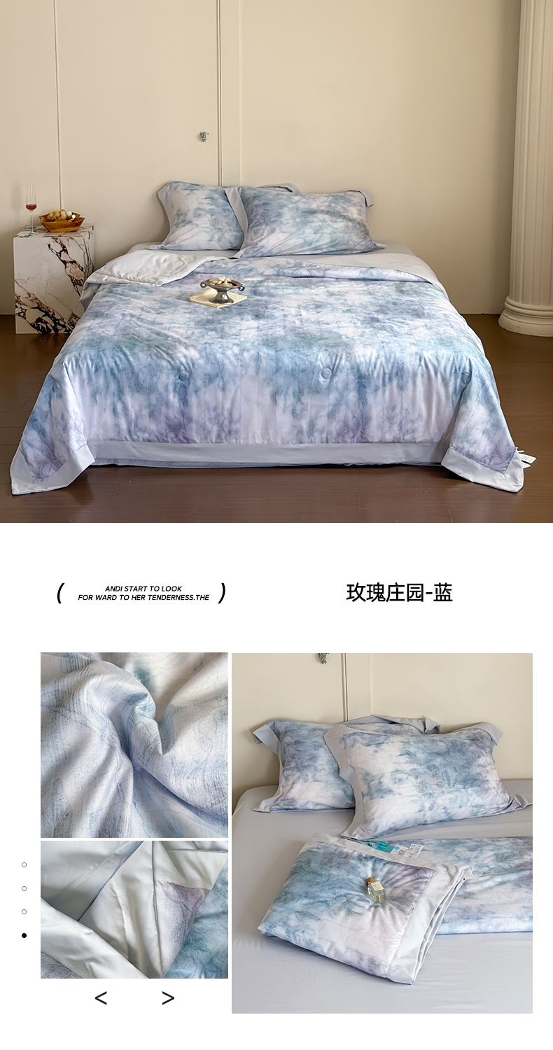 商品名称:亿莱鑫 2025新款7A抗菌超软柔肤棉轻奢床裙款夏凉被 空调被 被子夏被四件套-蝶恋花系列 玫瑰庄园-蓝
