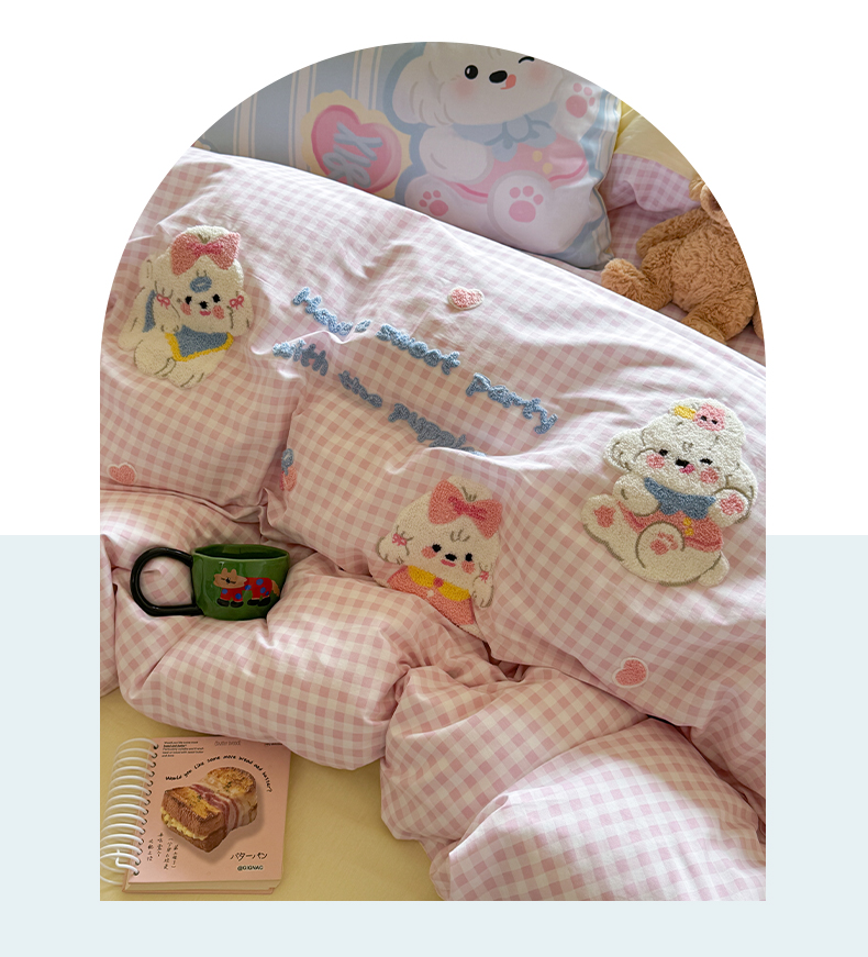 (总)美乐迪家纺 2026新款云感双层纱贴布绣四件套,睡货小狗,兔头小猫