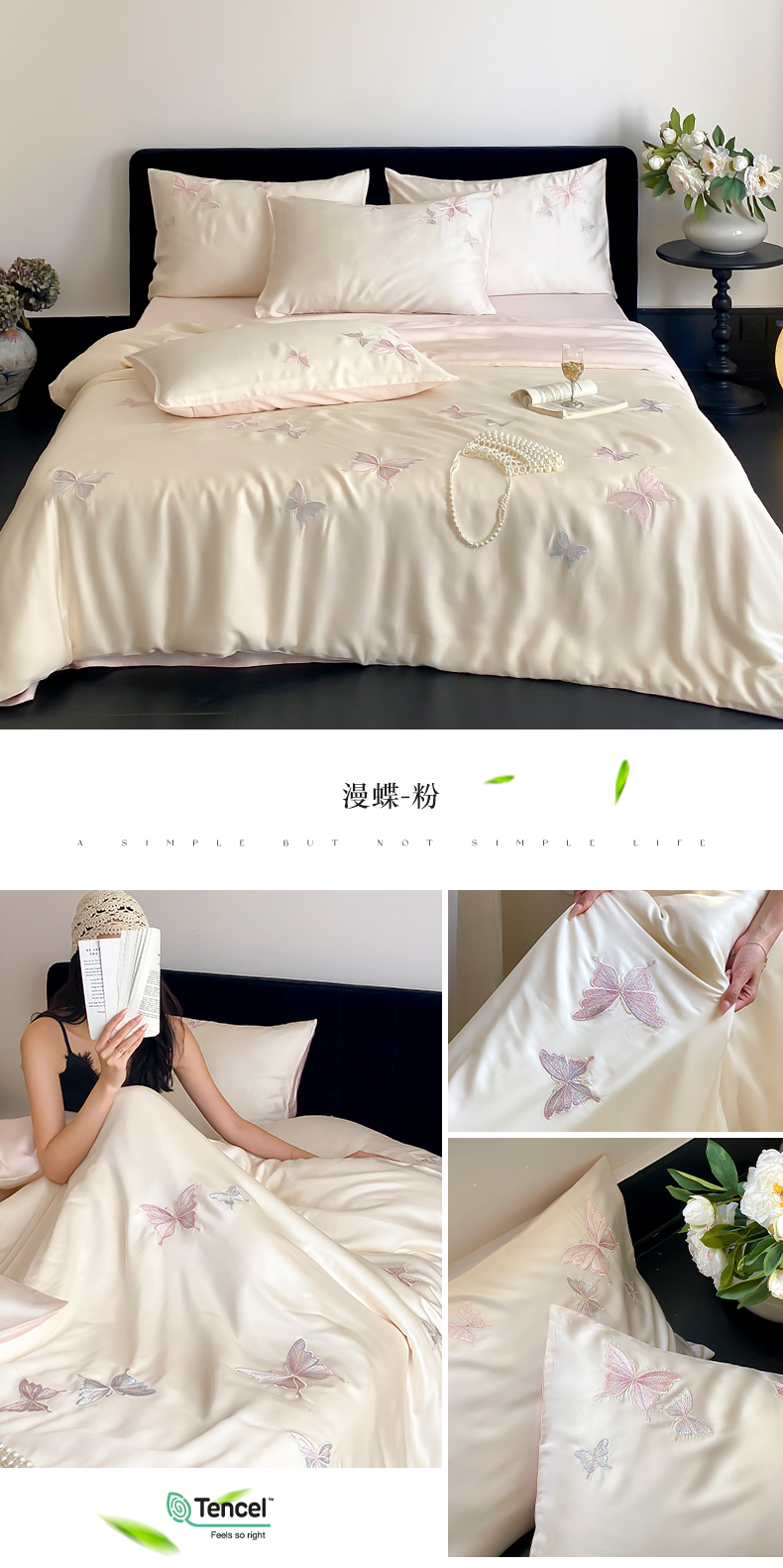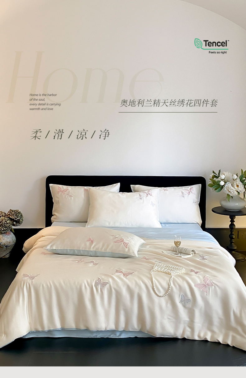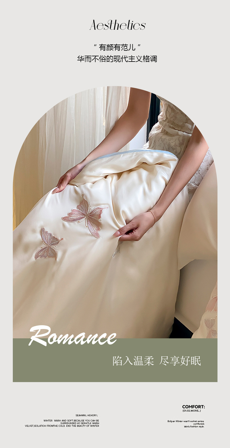 (总)云栖家居 2025秋冬新款50支纯色双拼加厚全棉磨毛被套刺绣100S纯棉四件套-小蝴蝶系列,粉灰,粉紫,蓝灰,米玉,月光黄