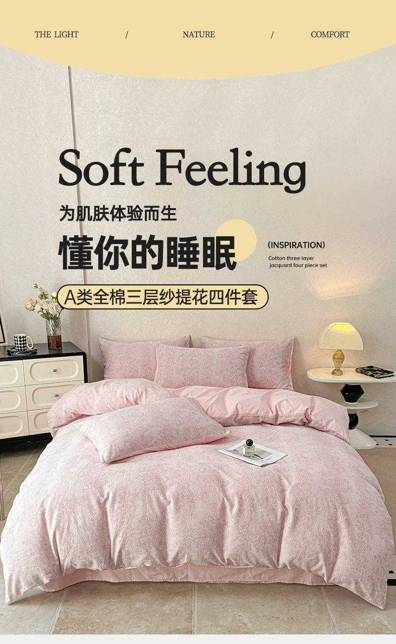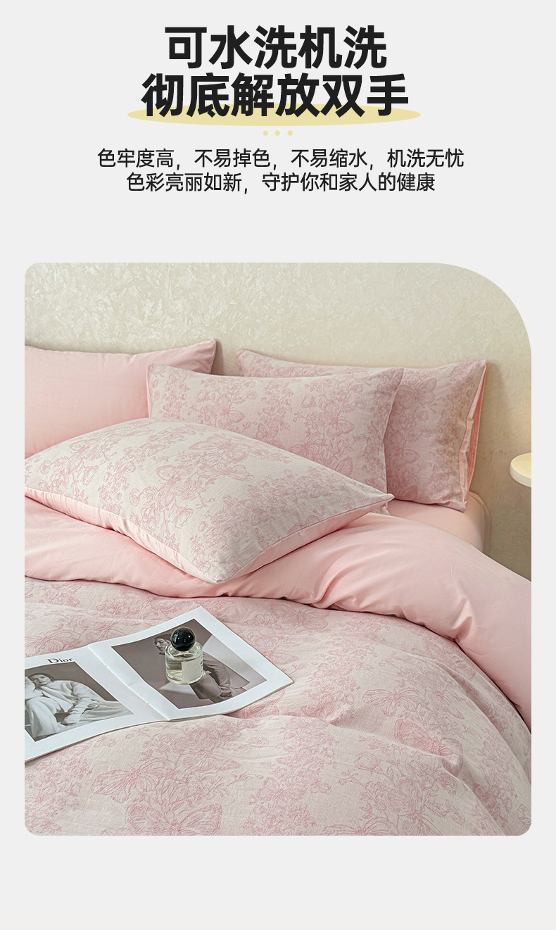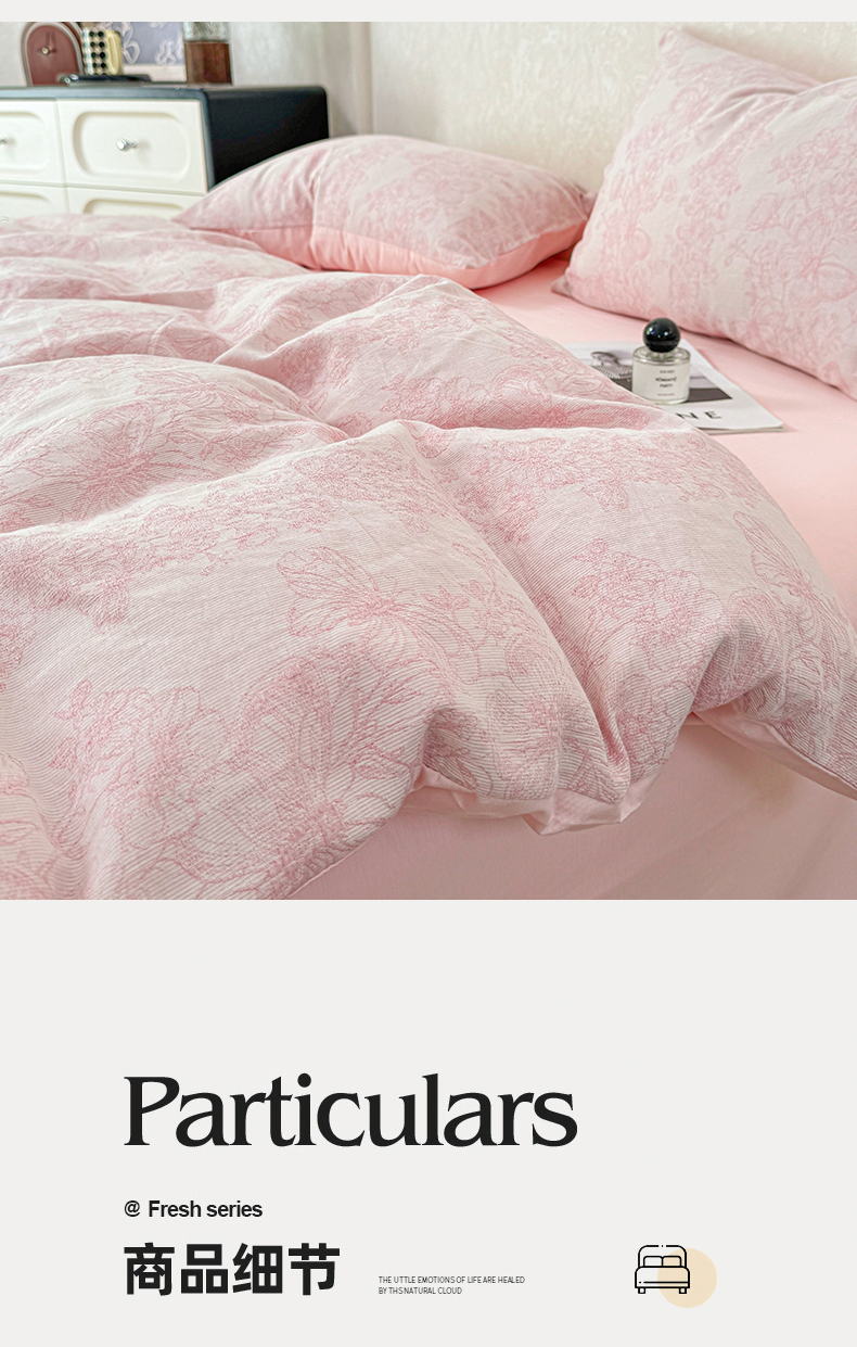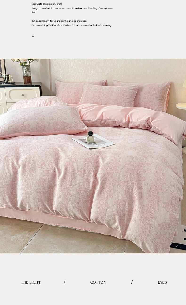 当前位置: 91家纺网 > 商品网购 > 床品套件 > 四件套 > 色织四件套 > 灰鲸2025新款A类全棉三层纱色织提花系列四件套 蝶飞-粉