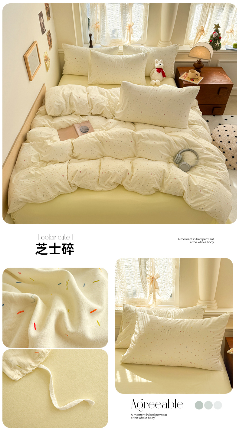 当前位置: 91家纺网 > 商品网购 > 床品套件 > 四件套 > 水洗棉四件套 > 晚爱家纺(原晚安家居) 2025新款超柔水洗棉四件套卡通小清新学生宿舍三件套 芝士碎