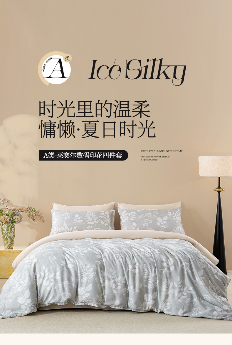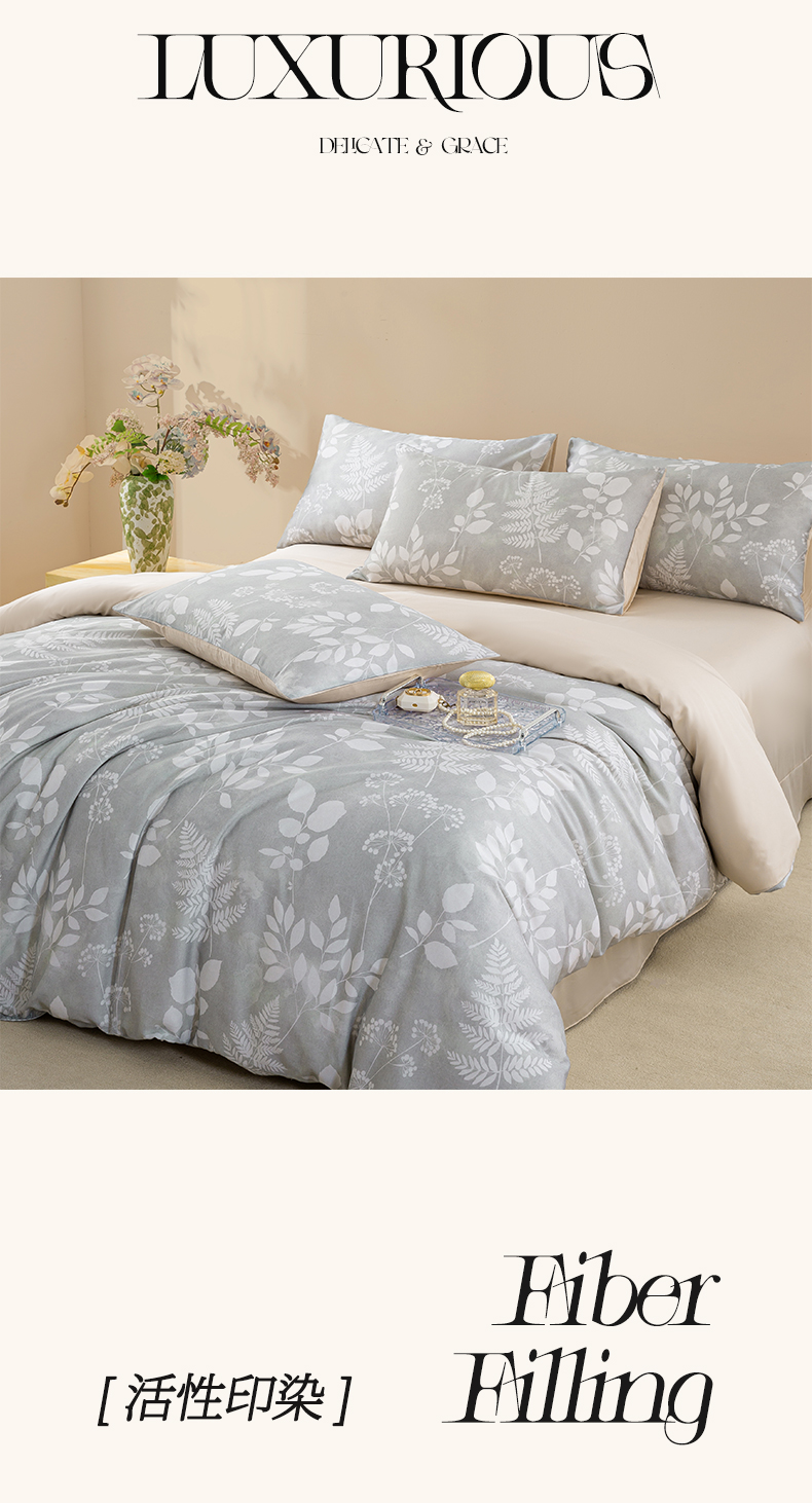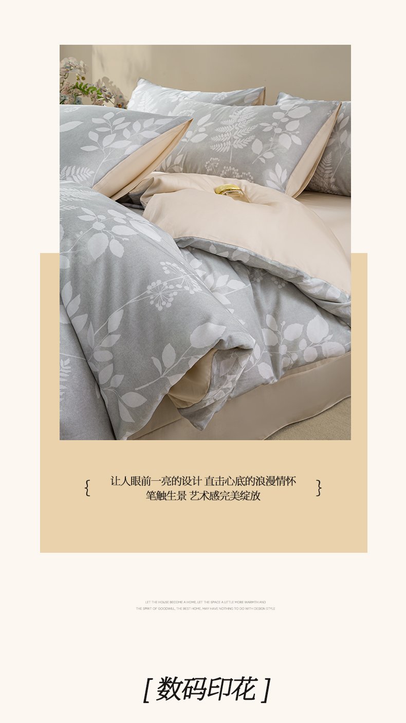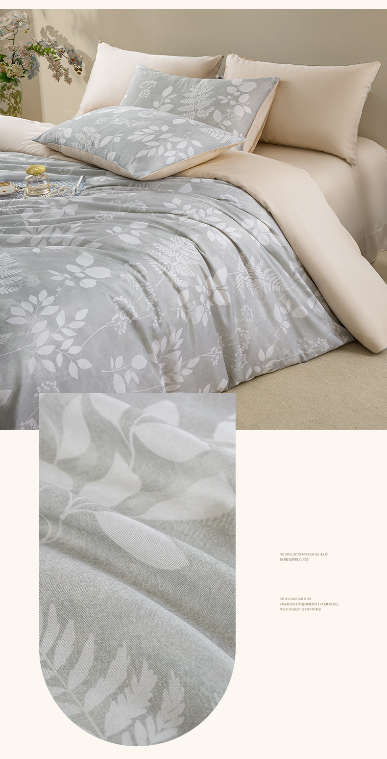 商品名称:麦田家纺 2025新款50S莱赛尔天丝印花四件套 叶影-灰