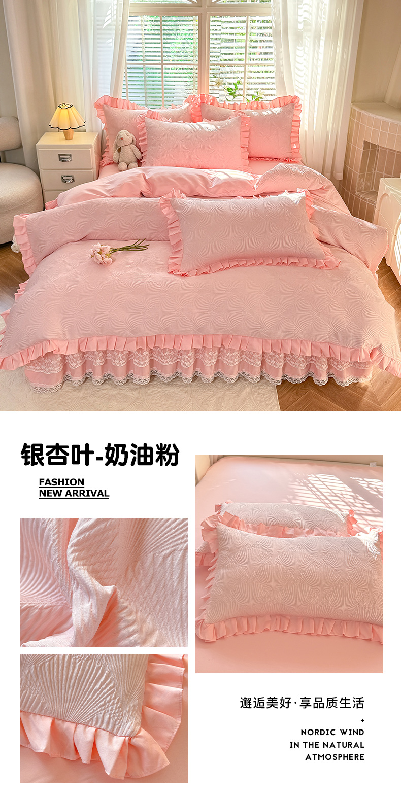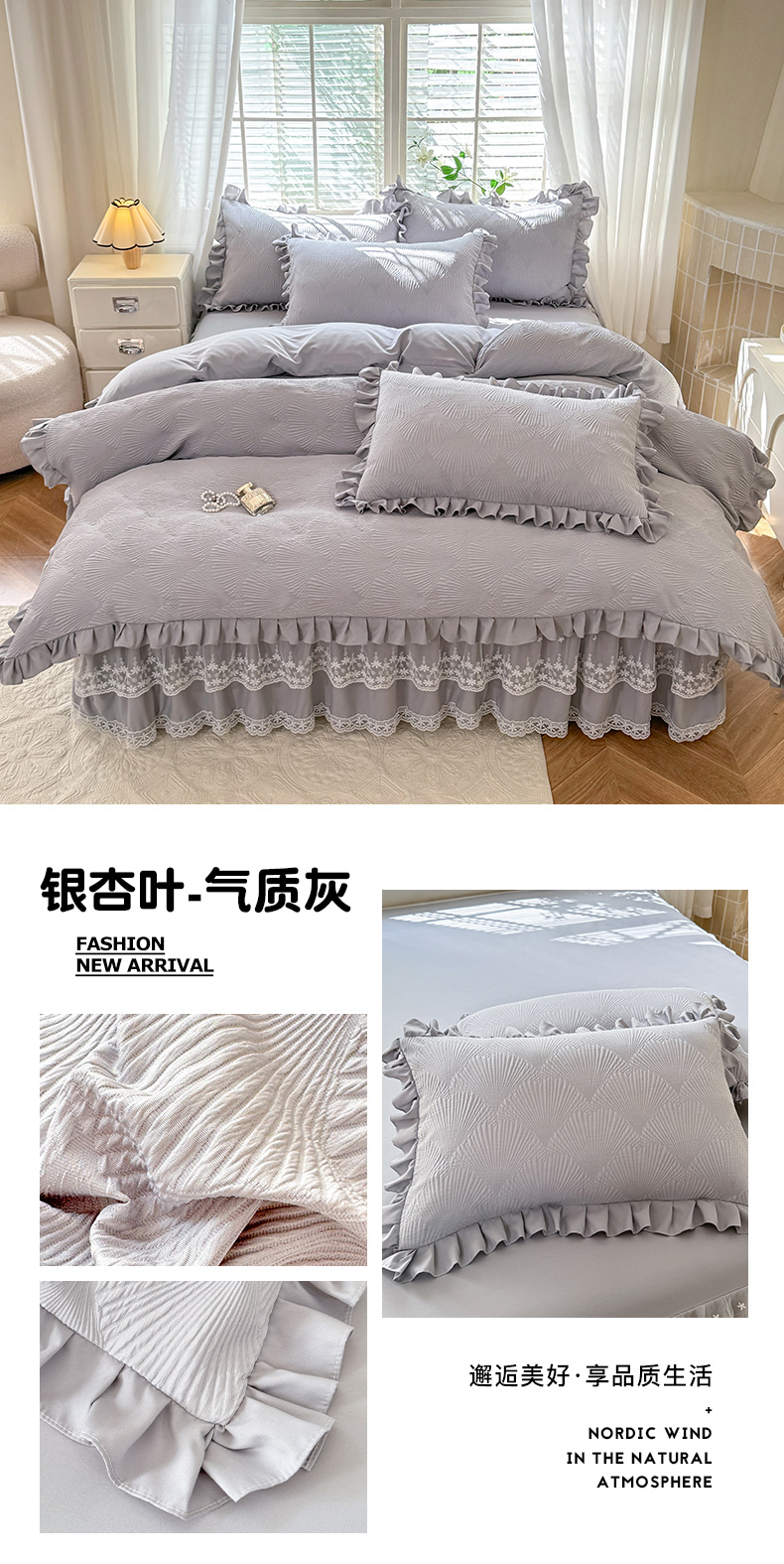 商品名称:唐人居 2025新款泡泡纱提花花边床裙四件套-银杏叶 银杏叶-奶白绿