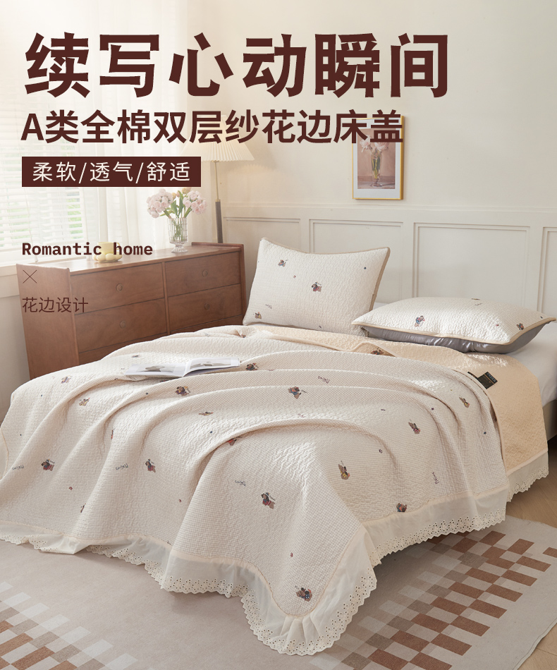 • 91家纺网 家纺一手货源 找家纺 拾小柒 2025年新款全棉双层纱床盖花边法式中古奶油风防滑床盖三件套 山野小咖