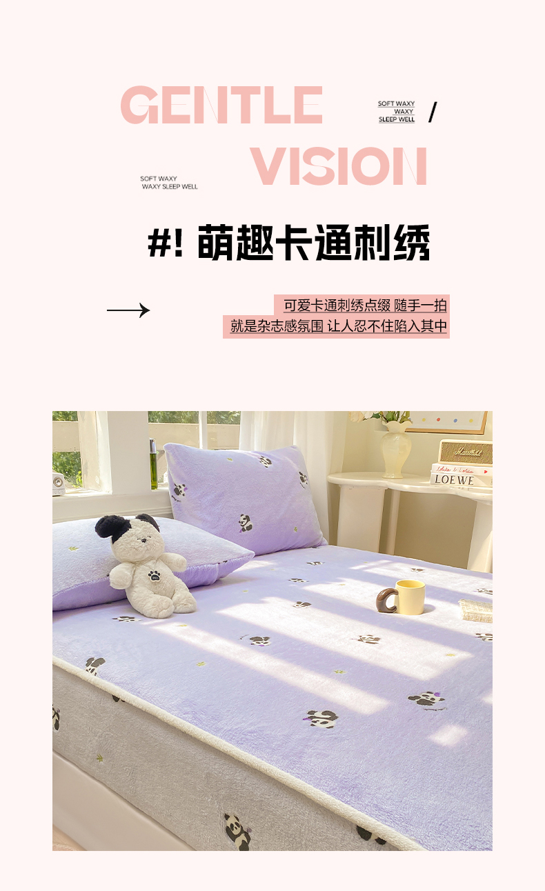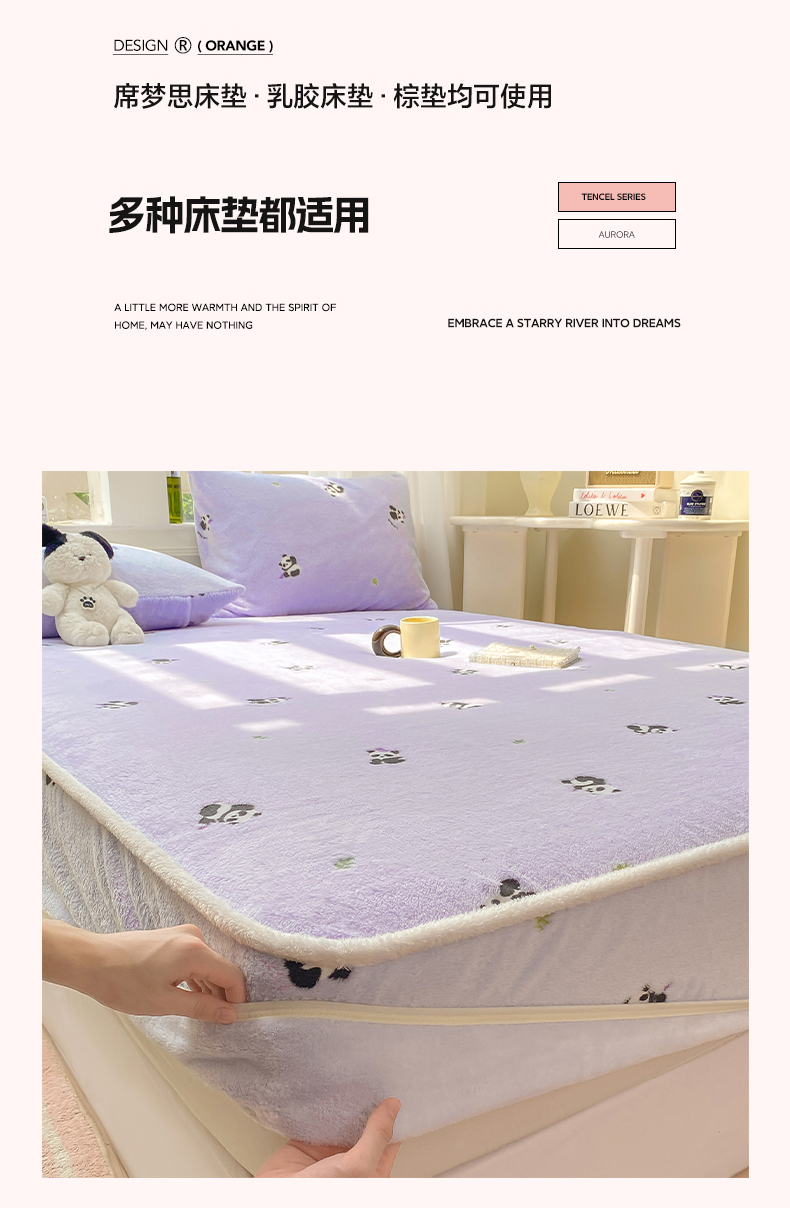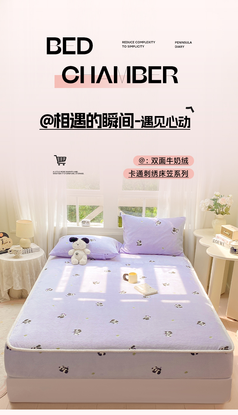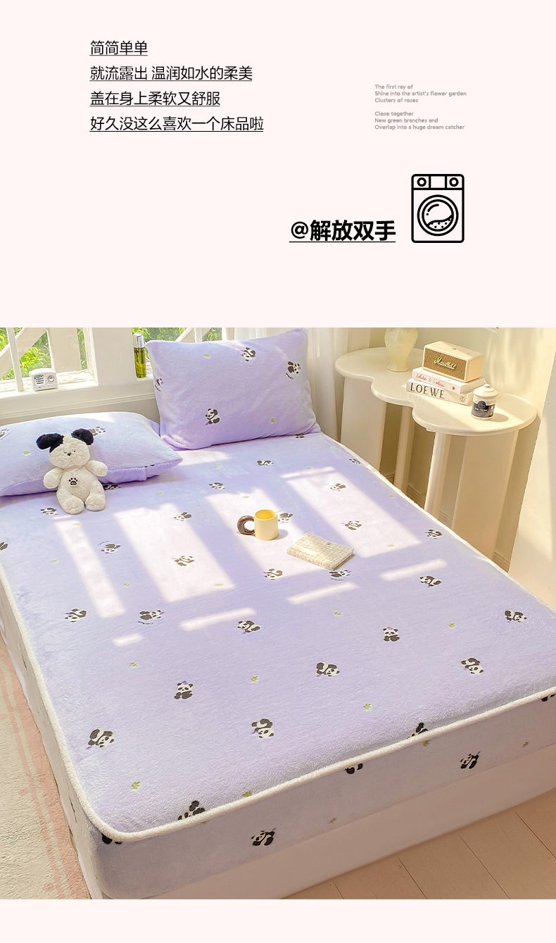 • 91家纺网 家纺一手货源 找家纺 眠势力 2025新款250g双面绒床笠单件三件套刺绣款高克重牛奶绒床垫保护套 熊猫紫【双面绒刺绣款】