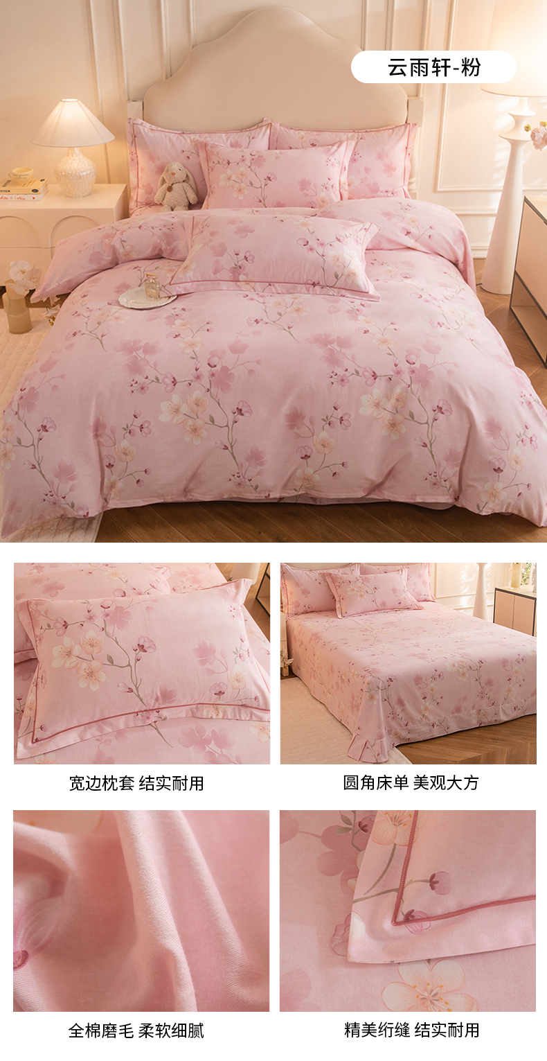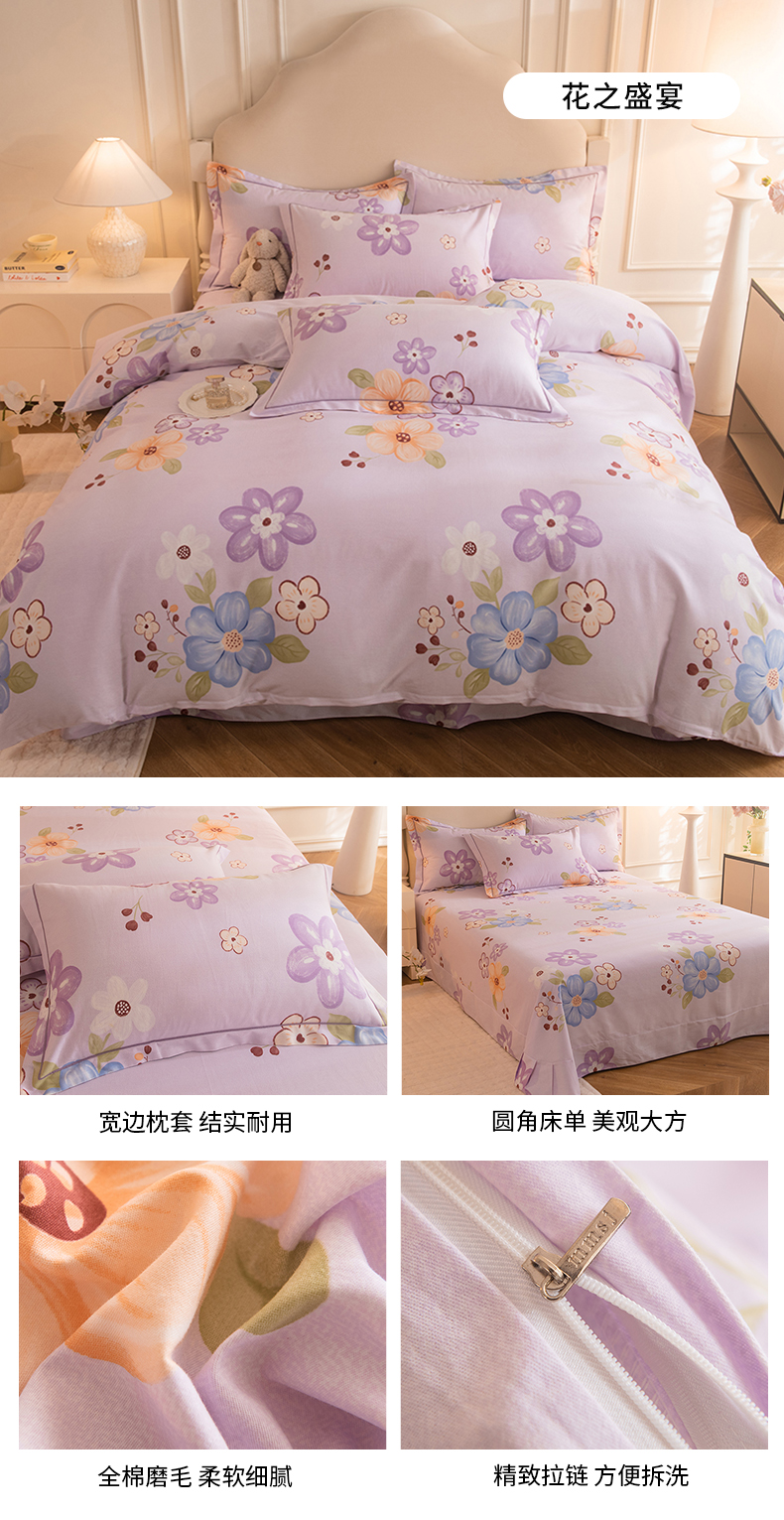 (总)磨毛世家家纺 2026新款铂金磨毛纯棉加厚全棉磨毛四件套,波点-粉,波点-灰,城南往事-紫,风信紫,哥伦比亚-蓝,花团锦簇-灰,华丽之都-桔,静初-灰,玫瑰之心-灰,上林春色-蓝,香雪海-粉,香雪海-蓝,永恒之羽-灰,永恒之羽-蓝
