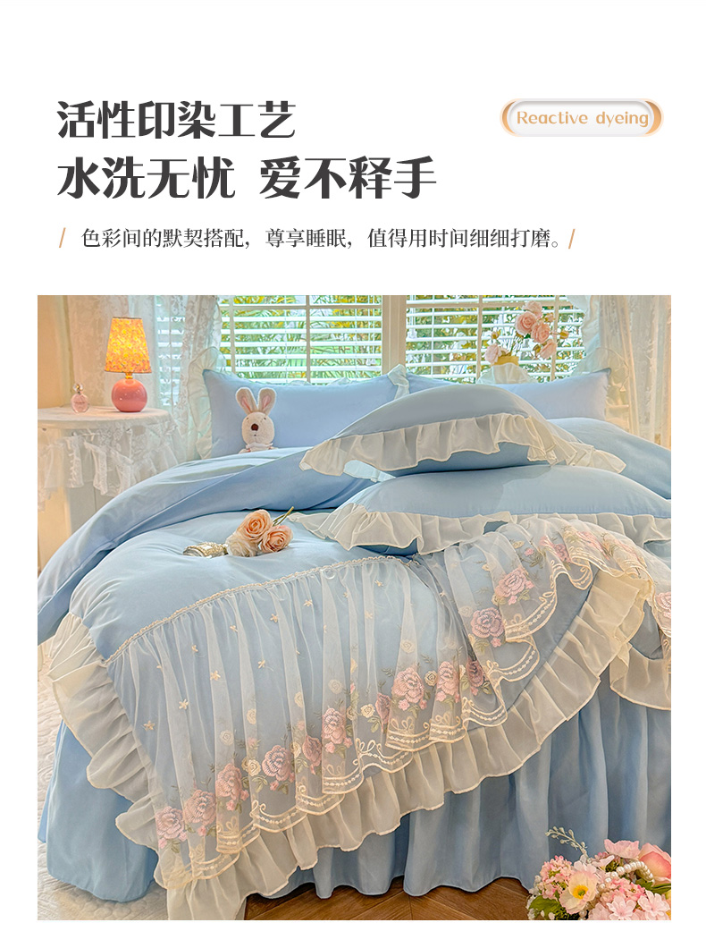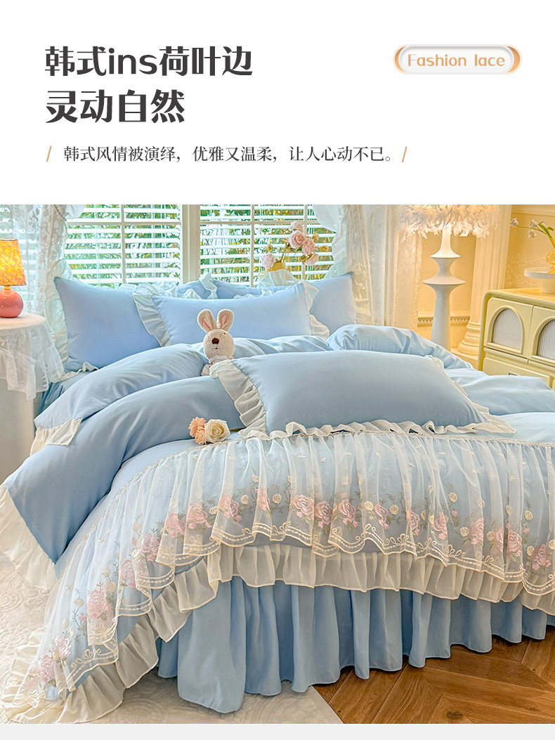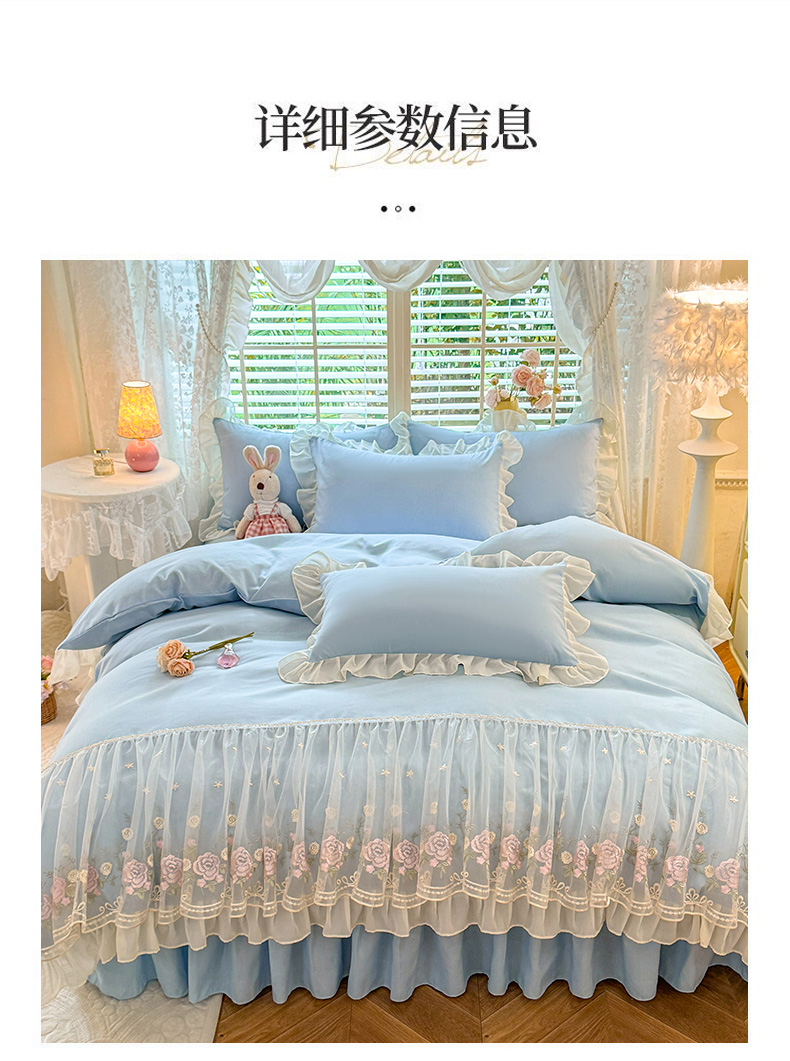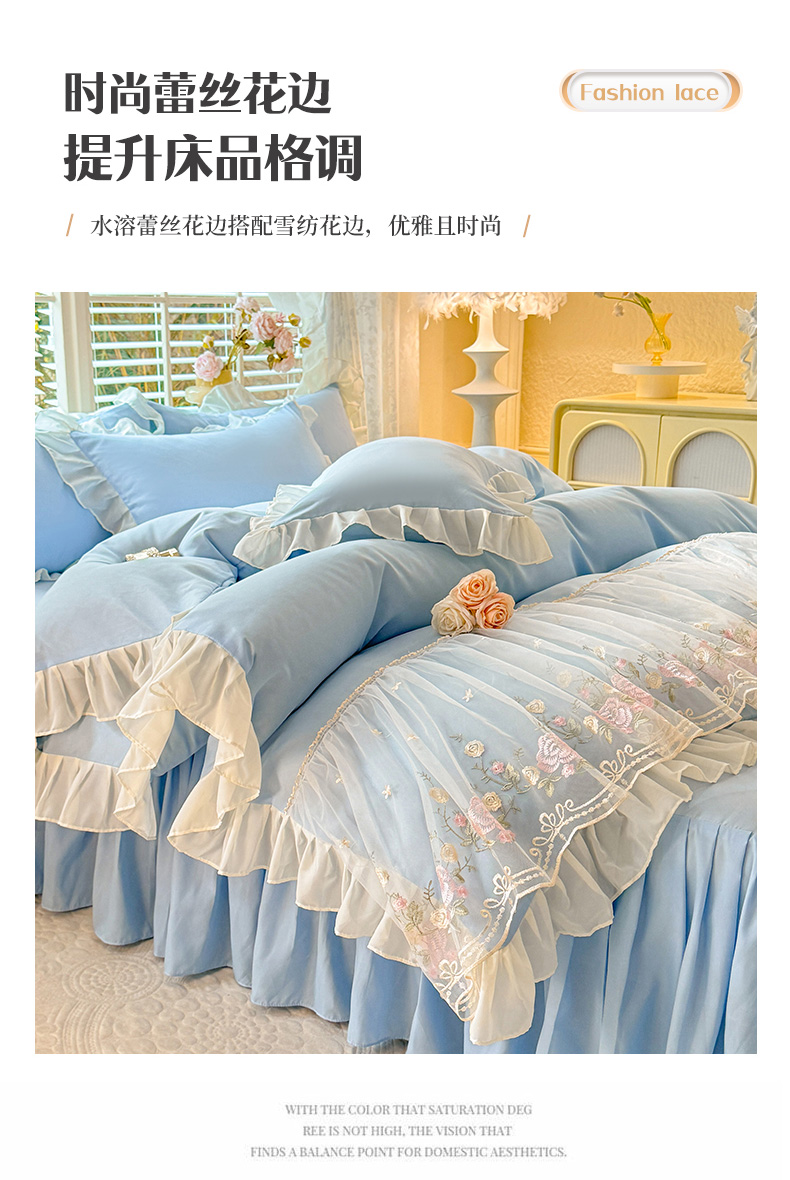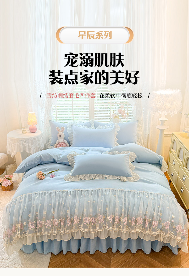 当前位置: 91家纺网 > 商品网购 > 床品套件 > 四件套 > 其它四件套 > 后庭寝室 2025新款韩版蕾丝床裙款四件套-星辰系列 星辰-浅蓝