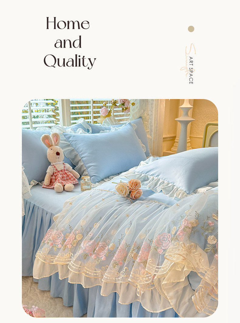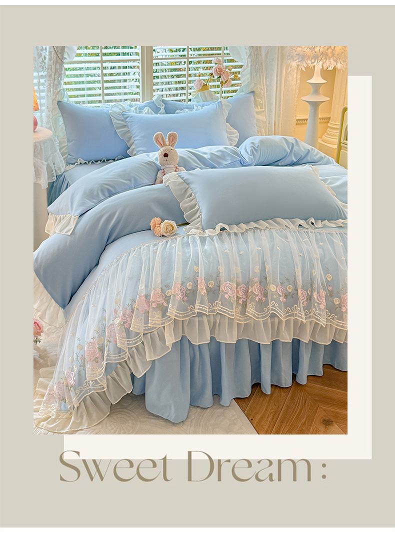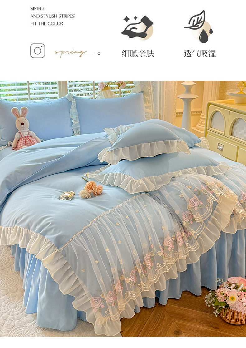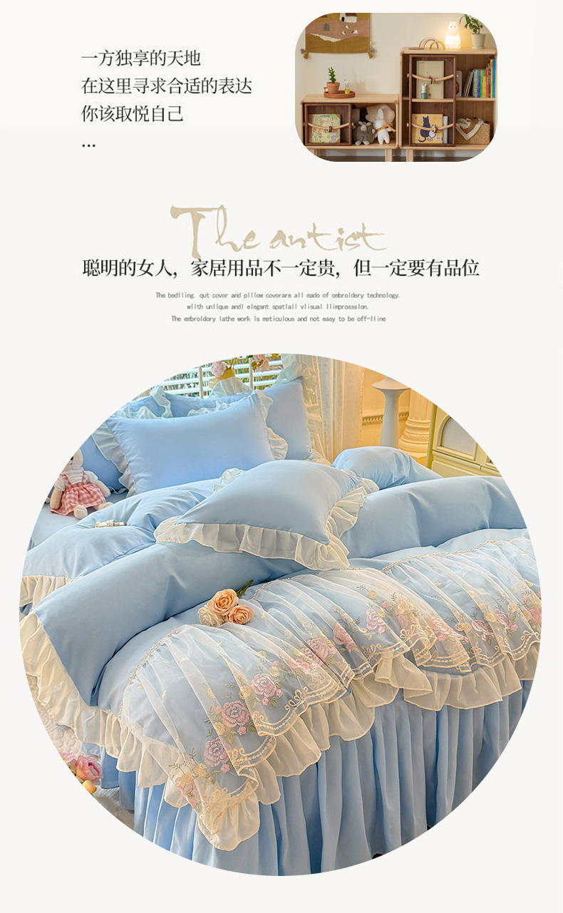 当前位置: 91家纺网 > 商品网购 > 床品套件 > 四件套 > 其它四件套 > 后庭寝室 2025新款韩版蕾丝床裙款四件套-星辰系列 星辰-浅蓝