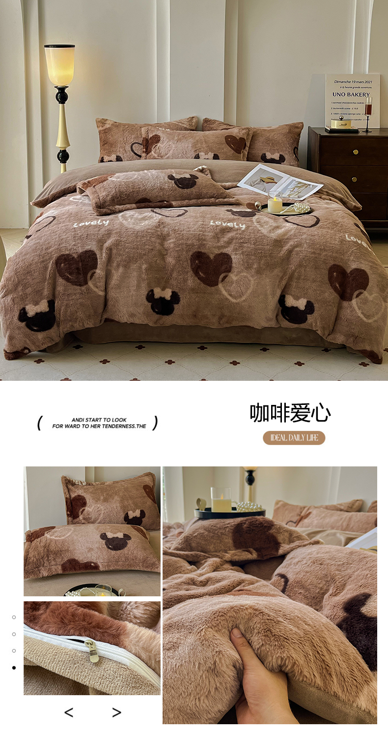 商品名称:梦纤绒 2025新款亲肤舒适兔毛印花牛奶绒保暖四件套一美拉德系 咖啡爱心
