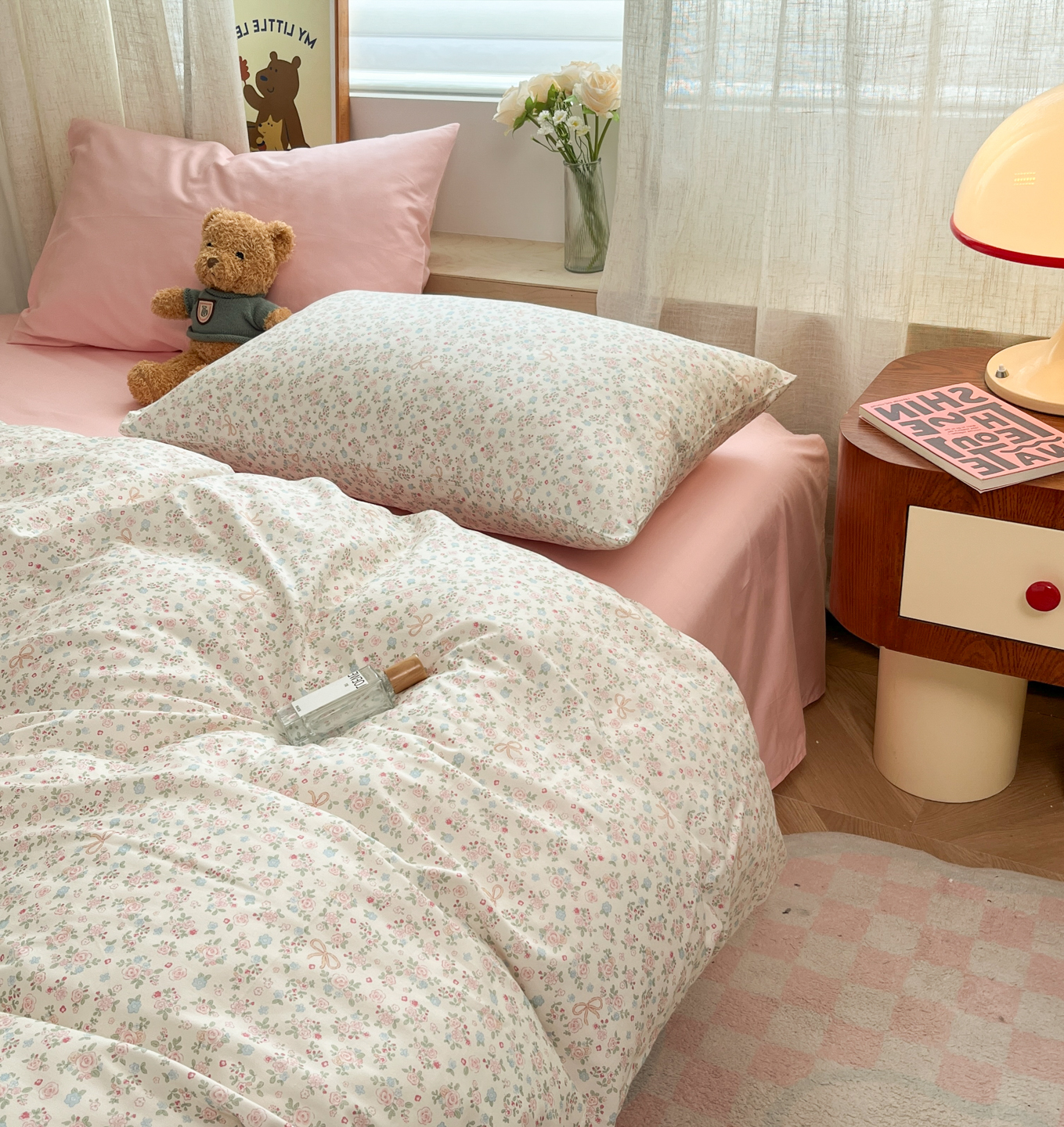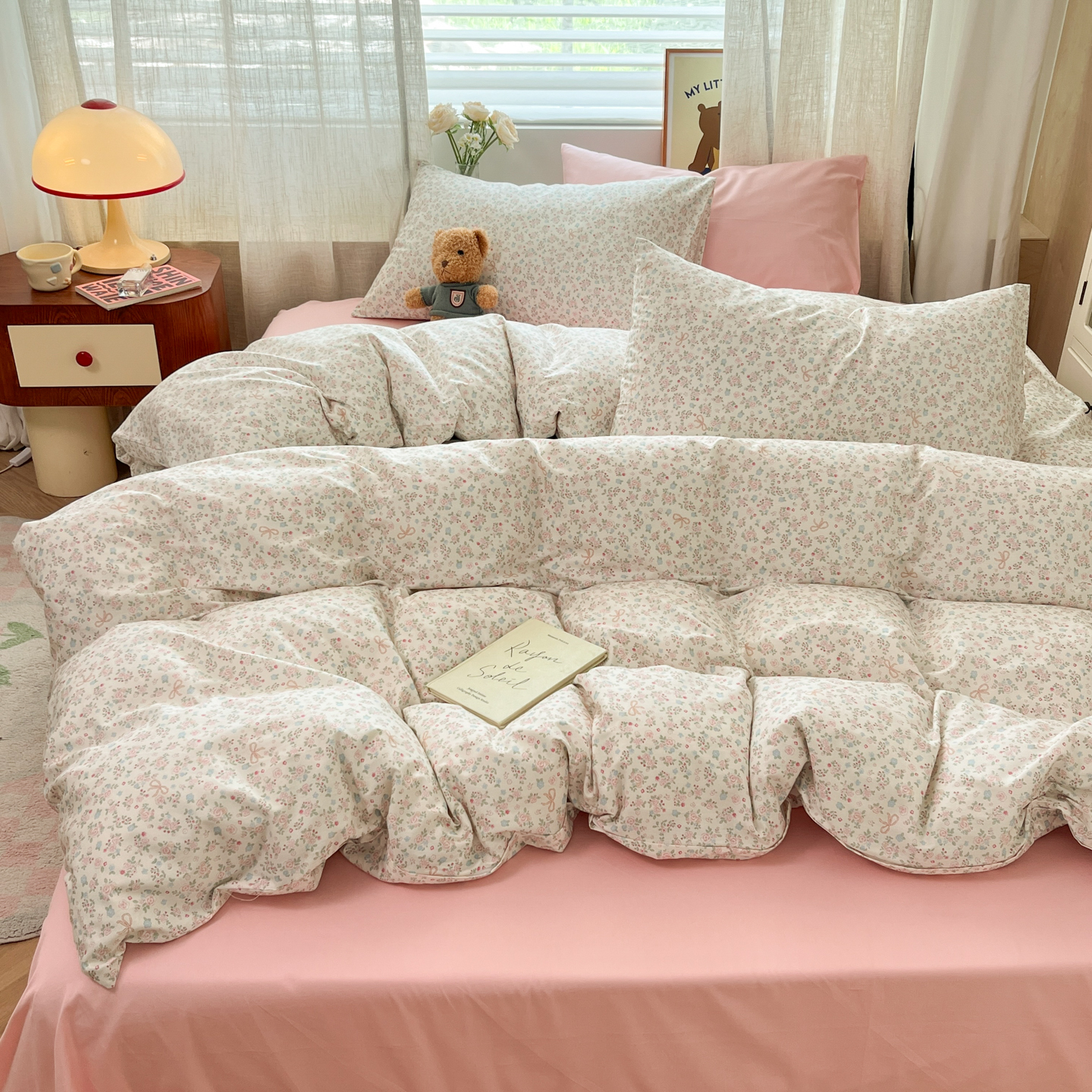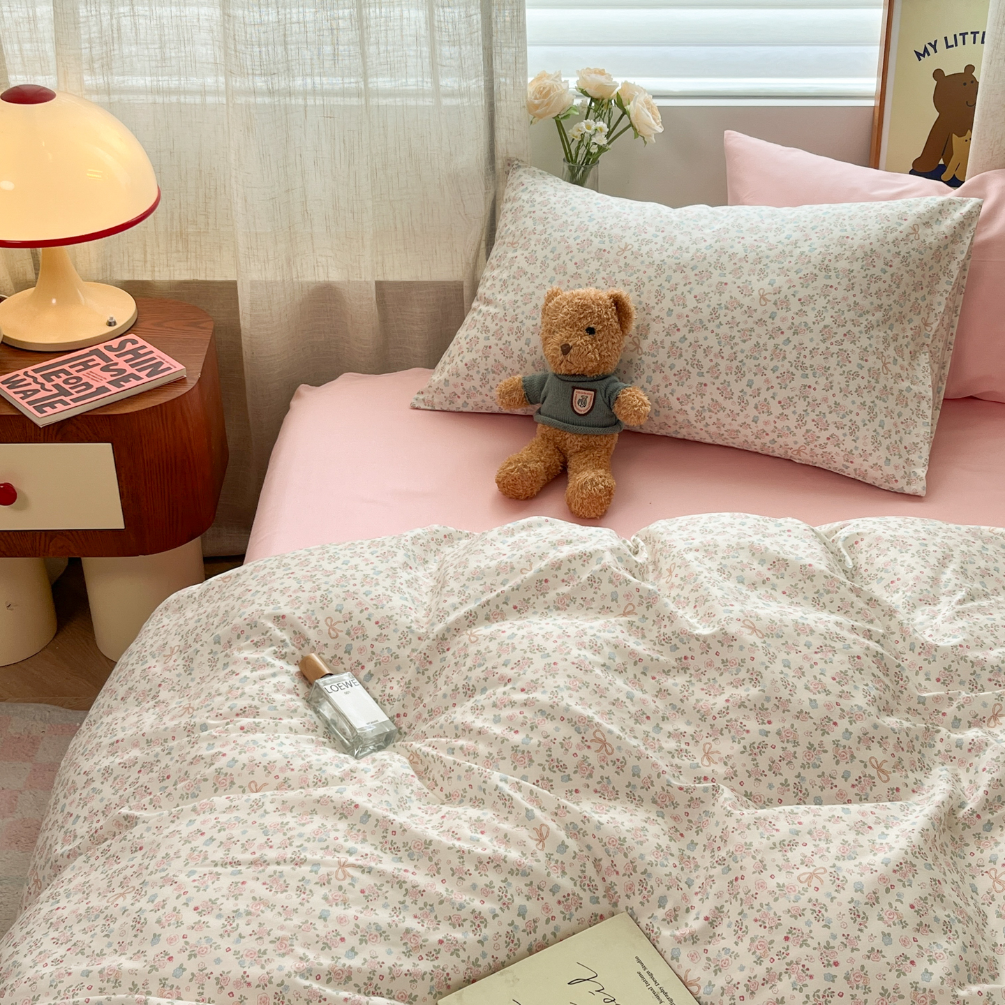 花海 2025年第一批小清新碎花全棉纯棉四件套40支13372ins博主风学生宿舍印花AA版纯色床单 山茶物语粉,山茶物语粉