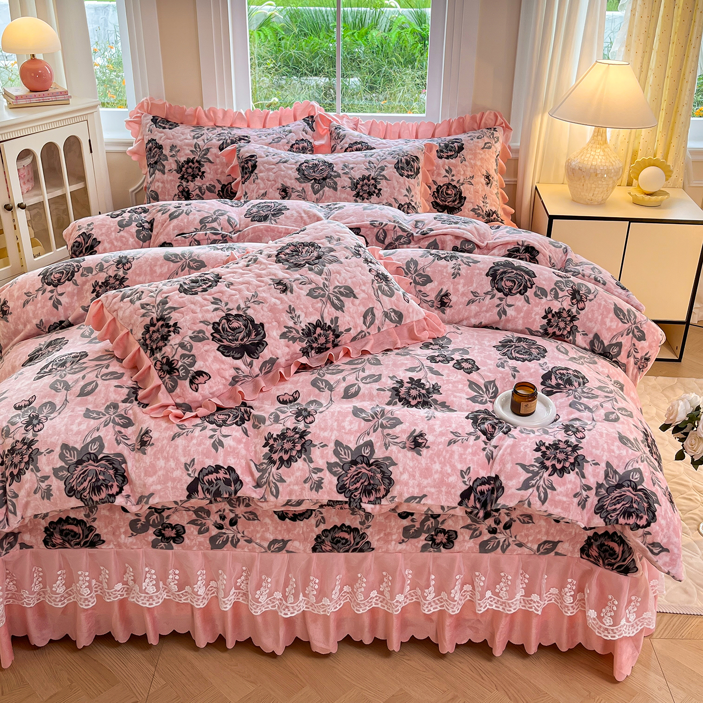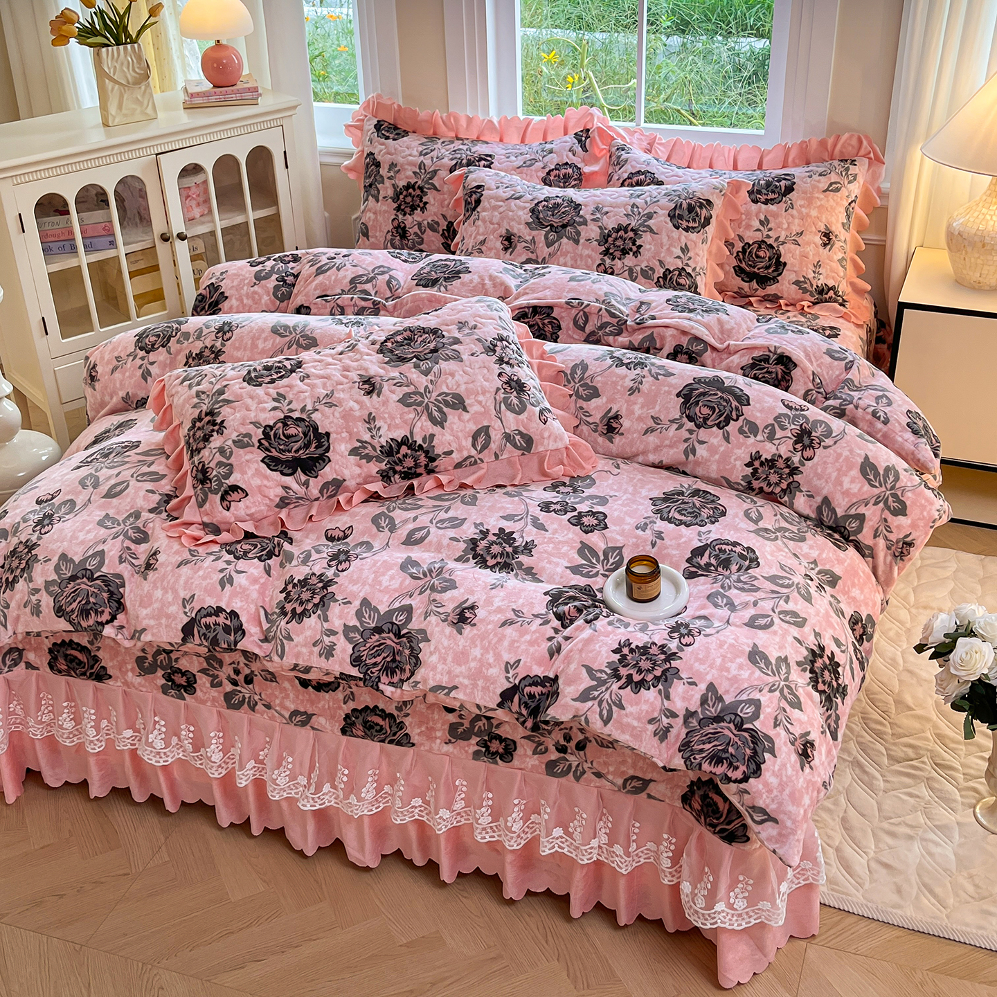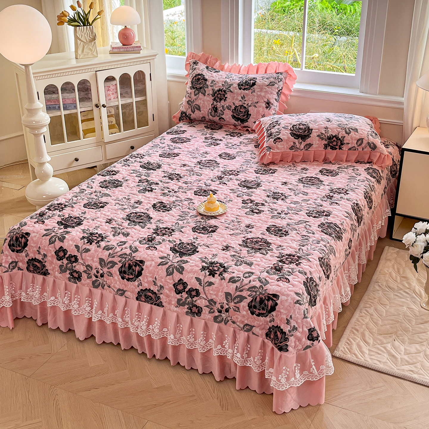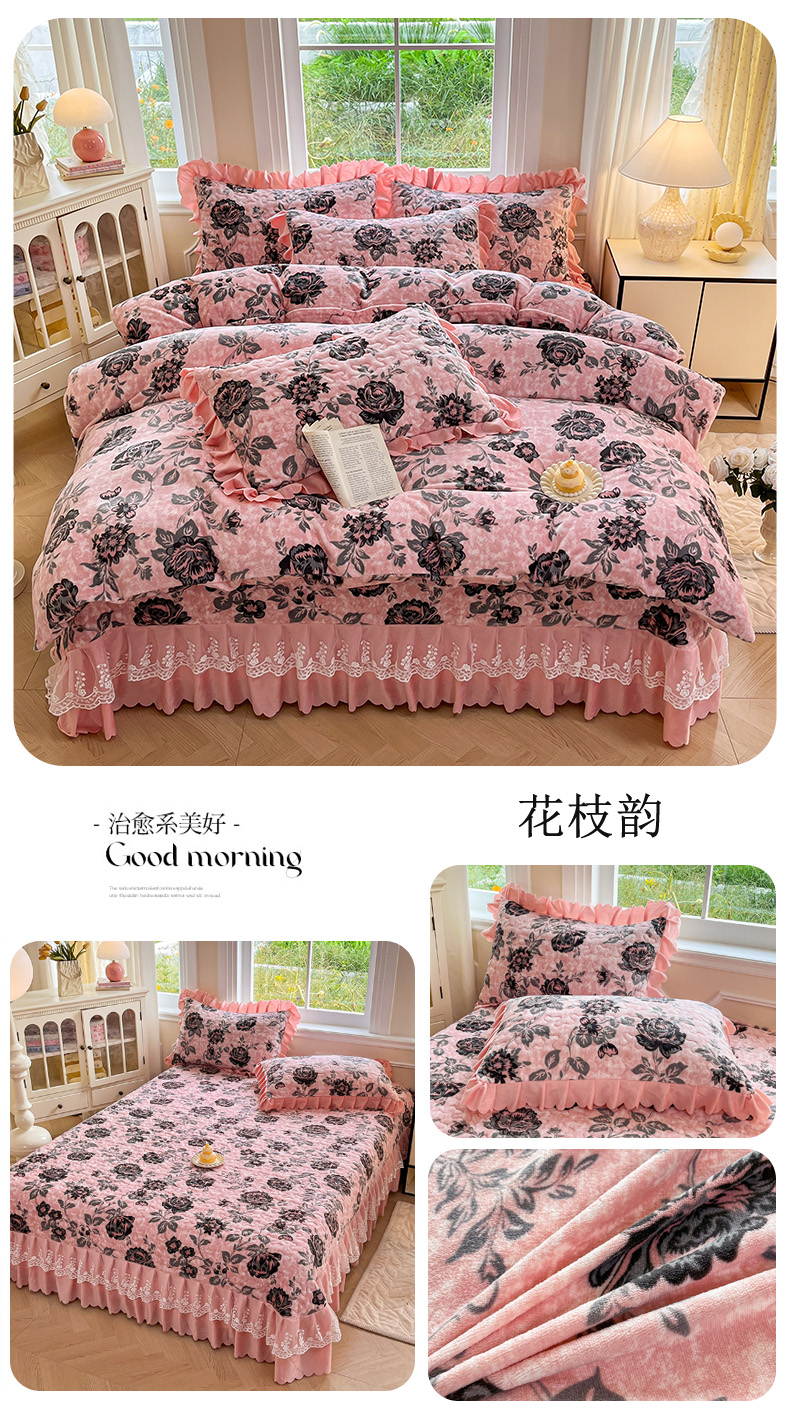 当前位置: 91家纺网 > 商品网购 > 床品套件 > 四件套 > 牛奶绒四件套 > 提花大世界 2025新款爆款高克重牛奶绒印花夹棉蕾丝花边床盖床三件四件套 花枝韵