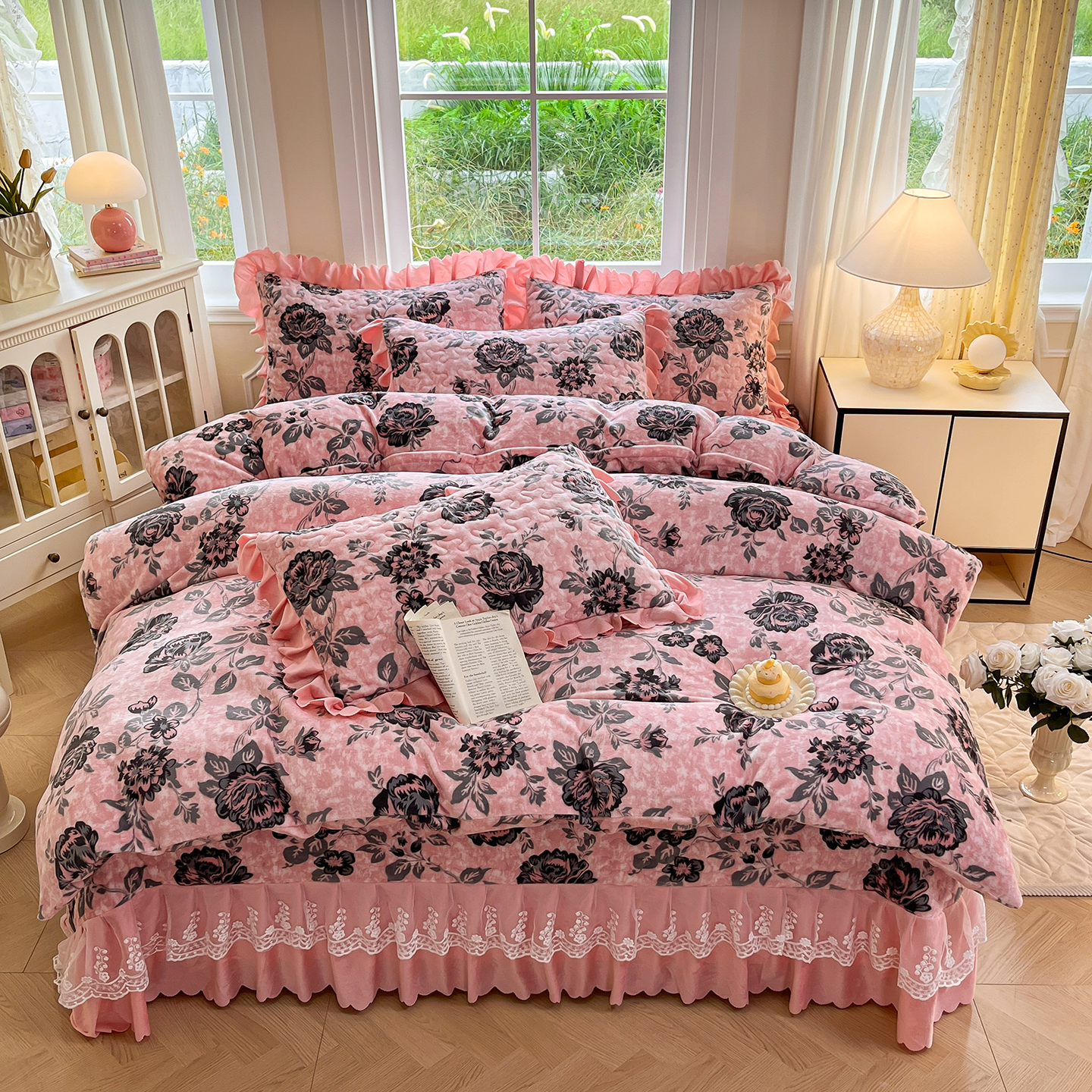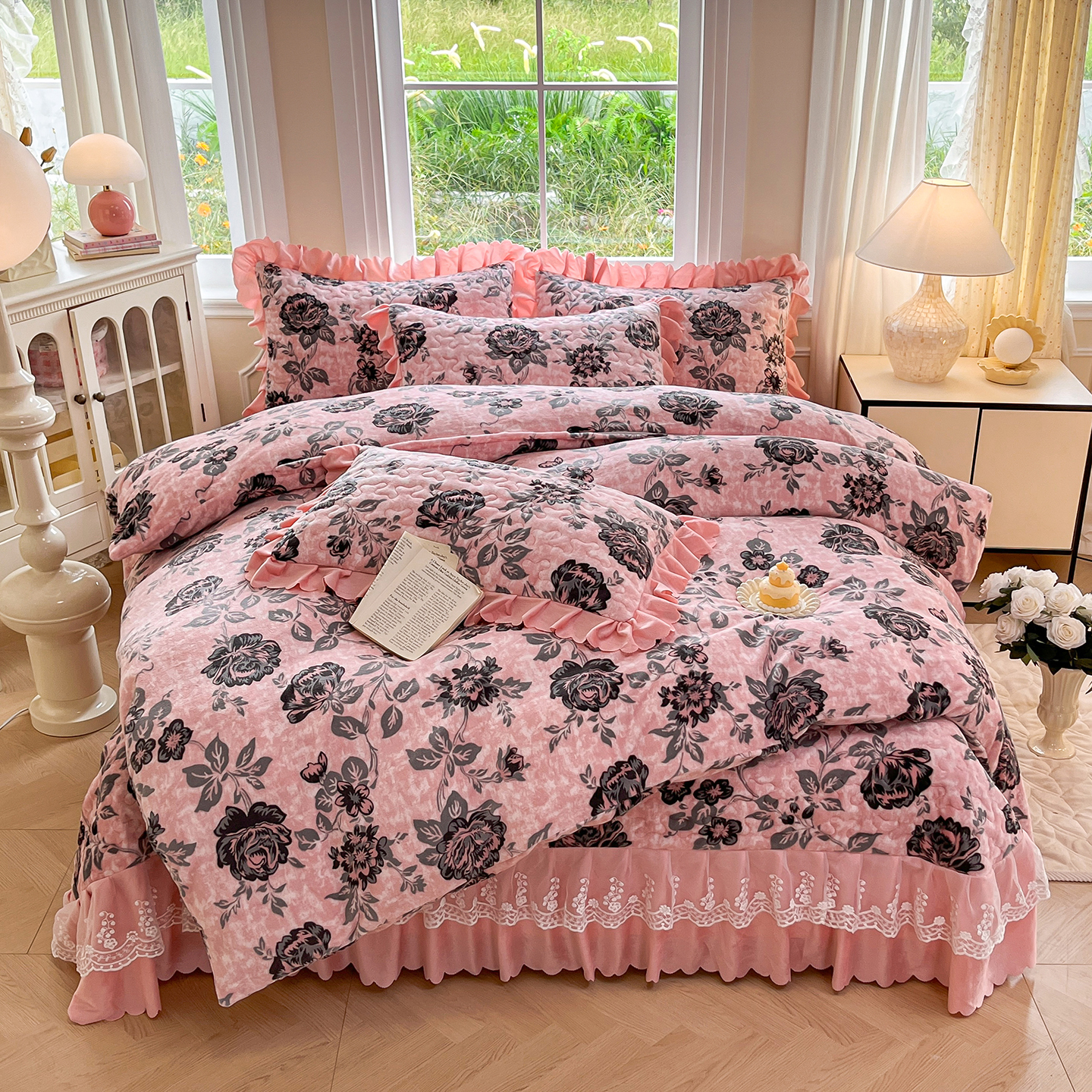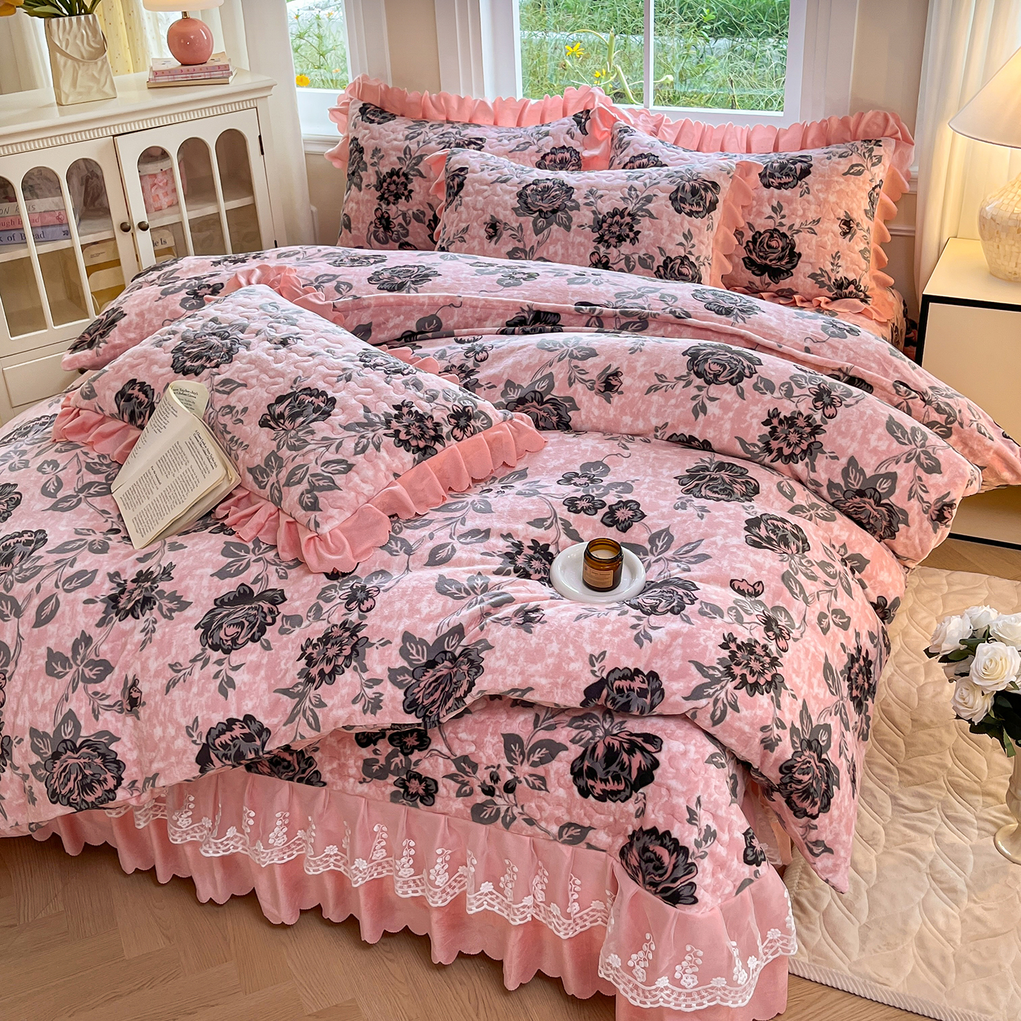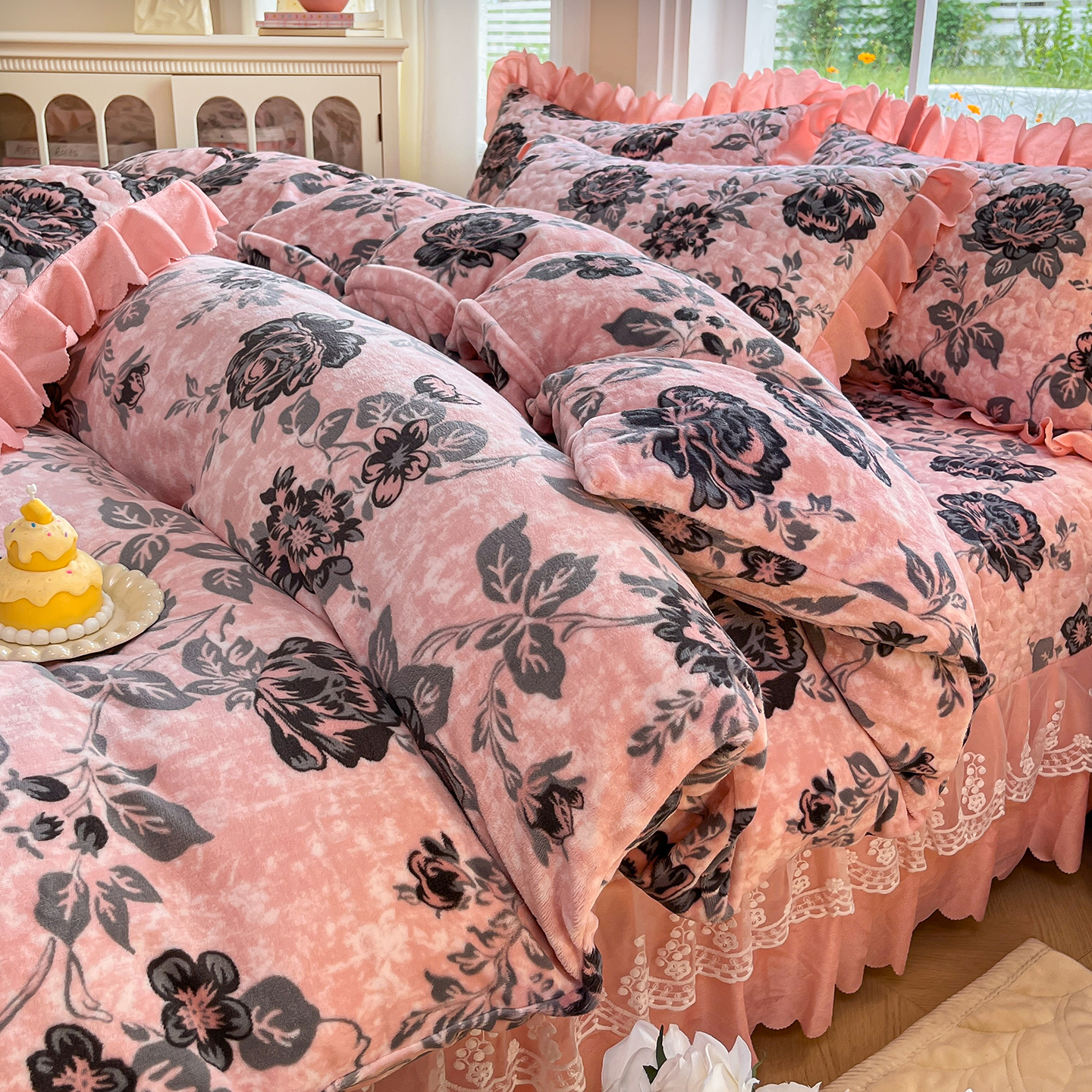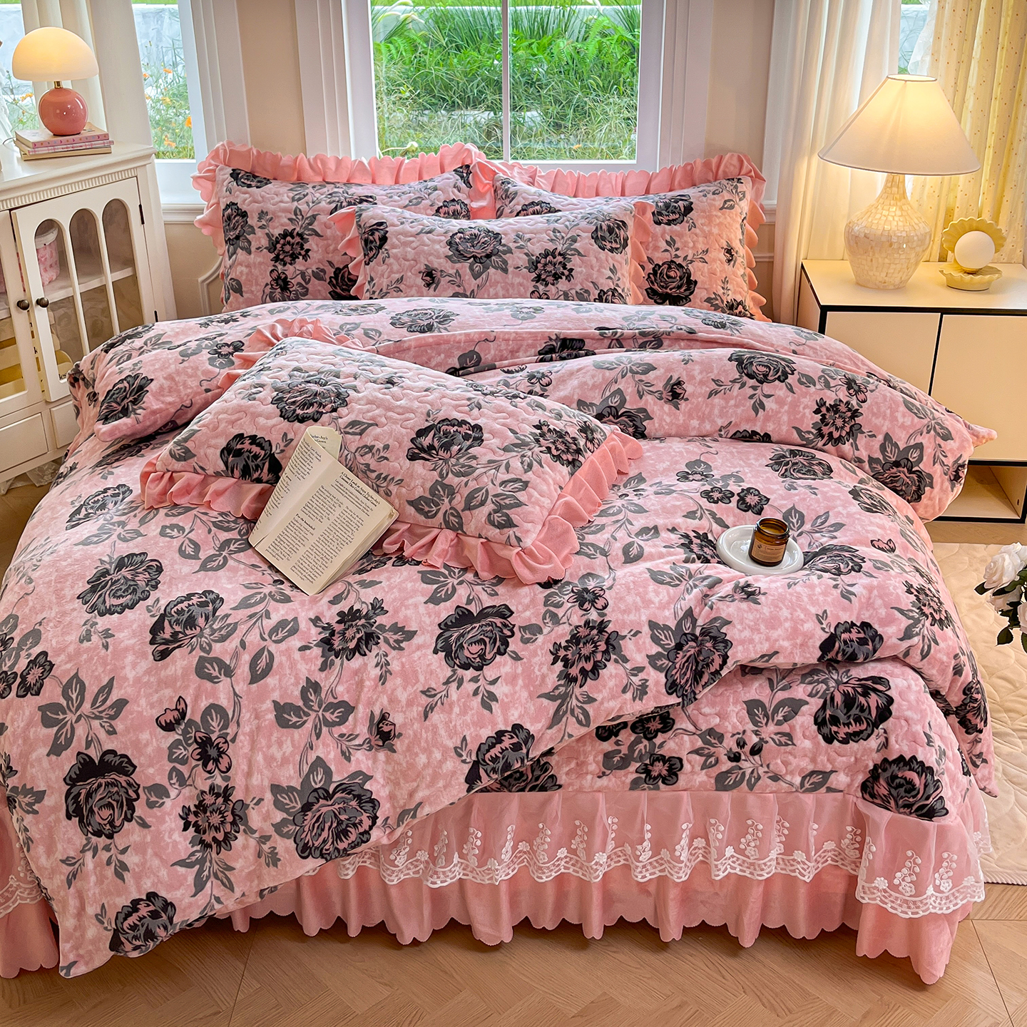 当前位置: 91家纺网 > 商品网购 > 床品套件 > 四件套 > 牛奶绒四件套 > 提花大世界 2025新款爆款高克重牛奶绒印花夹棉蕾丝花边床盖床三件四件套 花枝韵