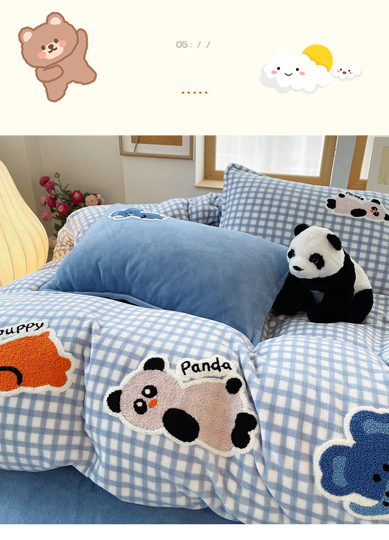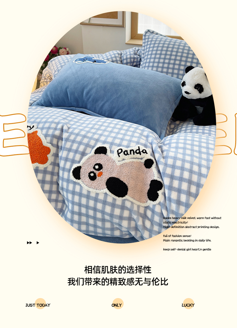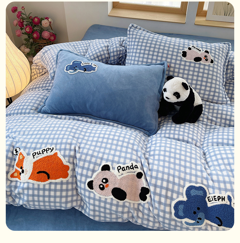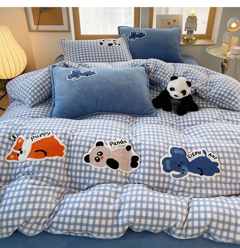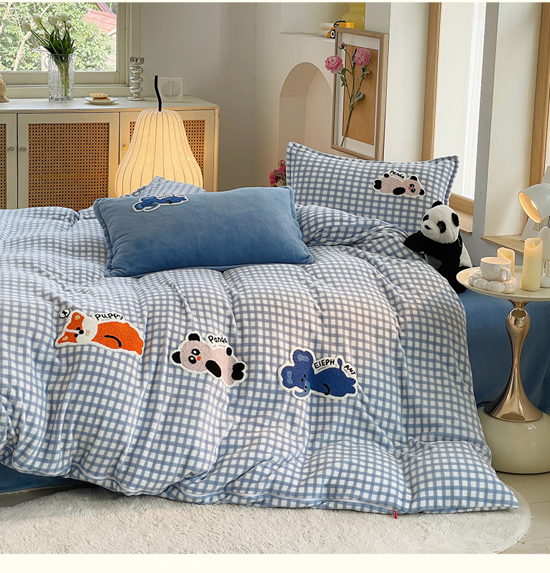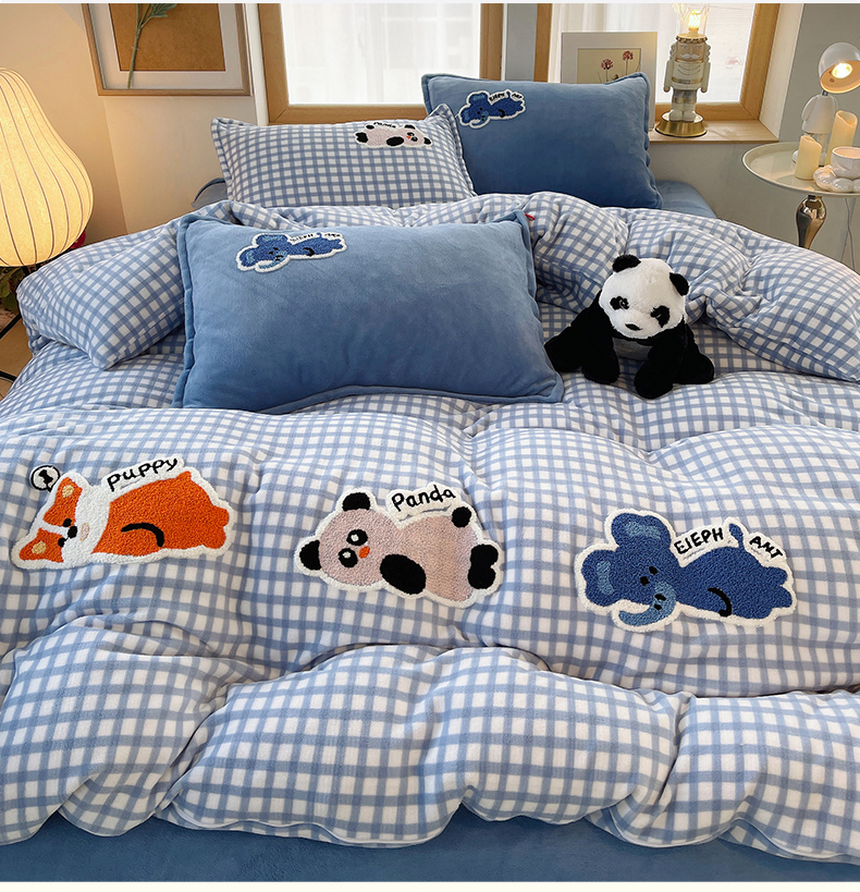 炫拼家纺 2025新款高克重牛奶绒格子卡通毛巾绣加厚四件套-糖宝系列 糖宝-星球萌宠