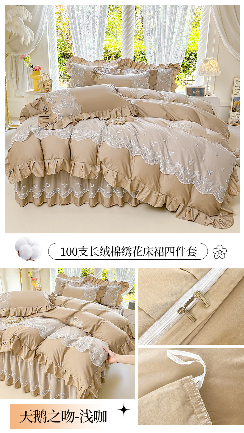 当前位置: 91家纺网 > 商品网购 > 床品套件 > 四件套 > 其它四件套 > 宜凡家纺 2025新款长绒棉绣花夹棉床裙四件套--天鹅之吻系列 天鹅之吻-蔚蓝