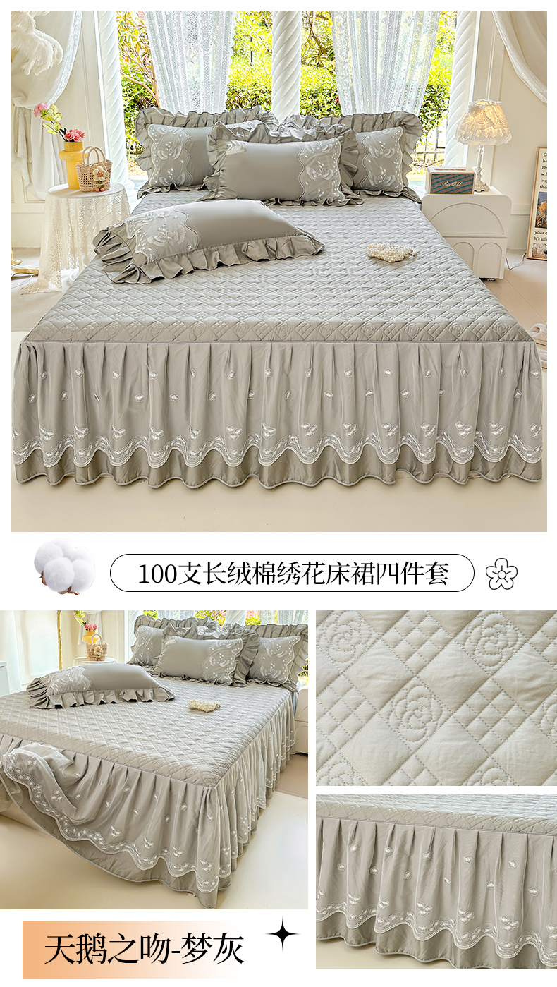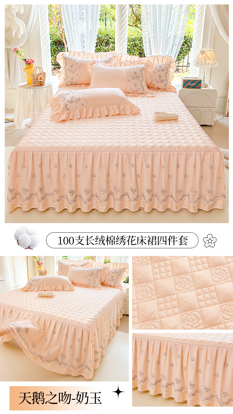 当前位置: 91家纺网 > 商品网购 > 床品套件 > 三件套 > 宜凡家纺 2025新款长绒棉绣花夹棉床裙三件套--天鹅之吻系列 天鹅之吻-香芋紫