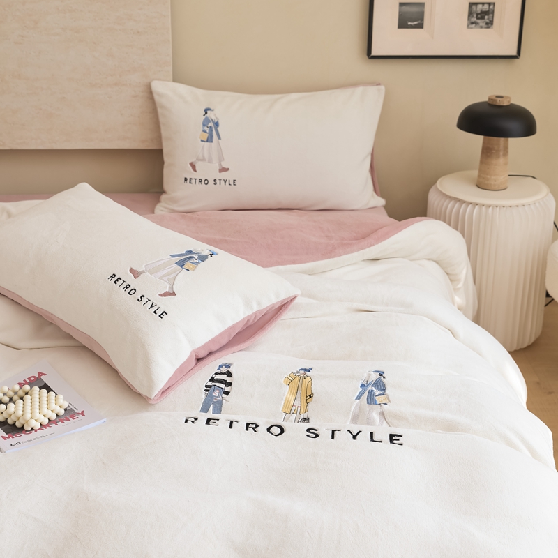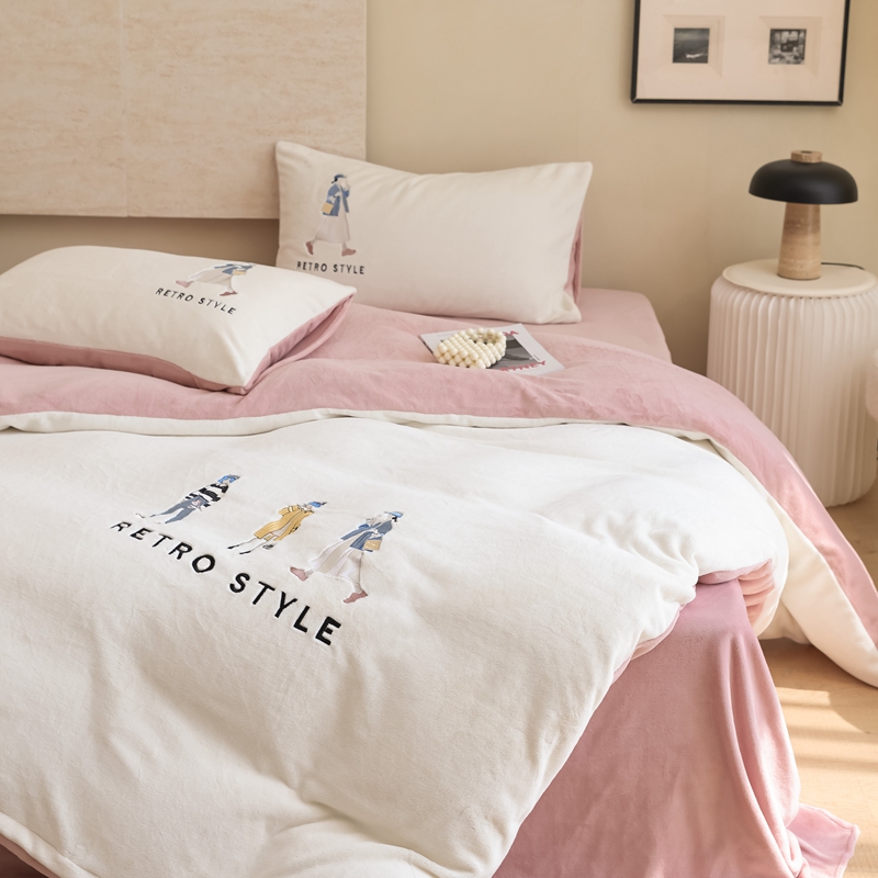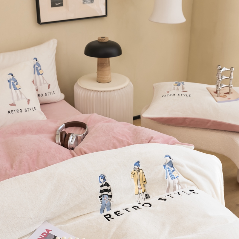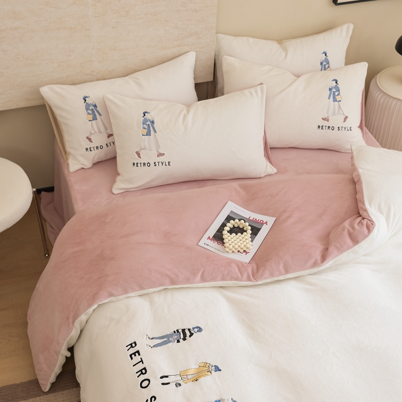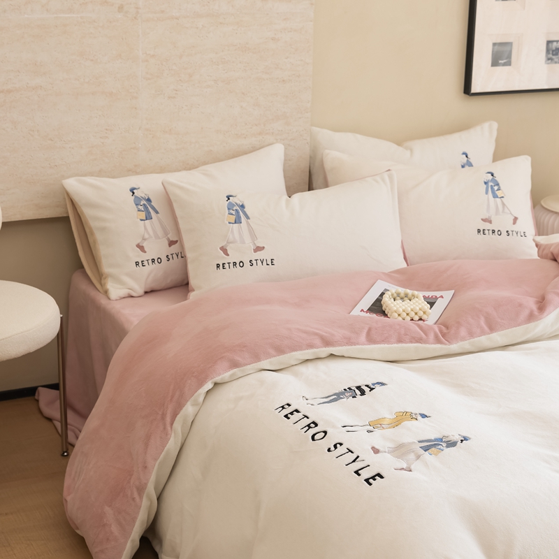 商品名称:121【牛奶绒刺绣四件套】2025新款毛毯被子四件套单件床单被套床笠珊瑚绒牛奶绒冬被法兰绒兔毛绒刺绣男孩-Boy系列场景二 baby-橘粉