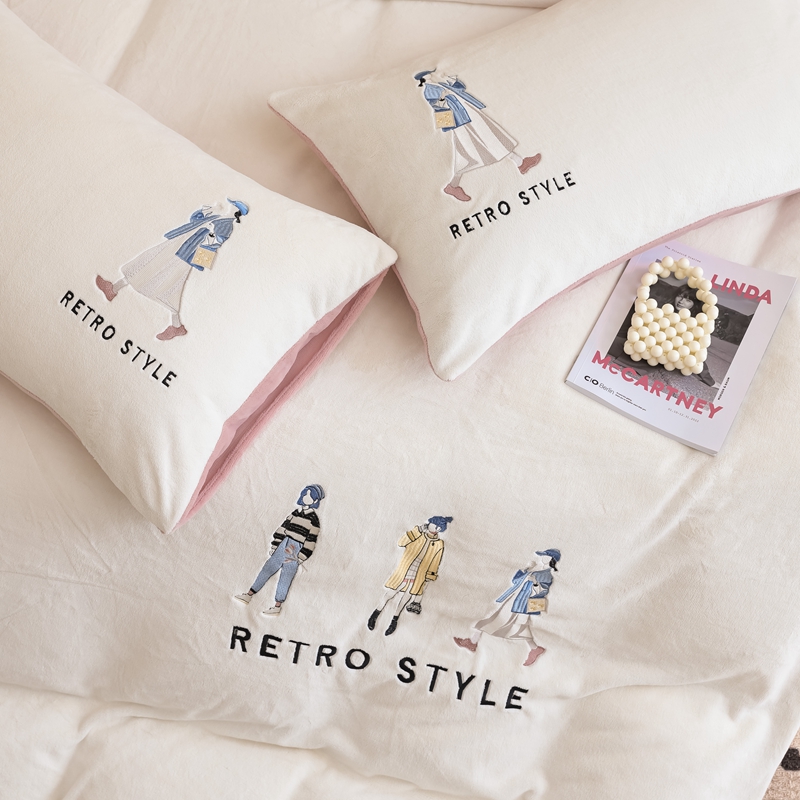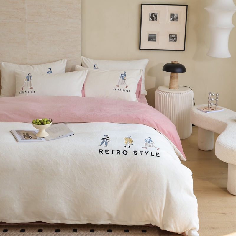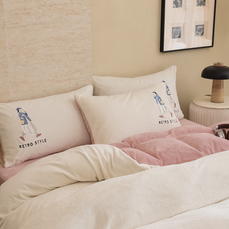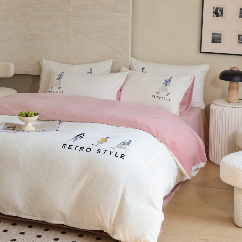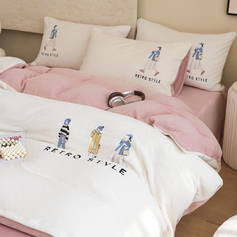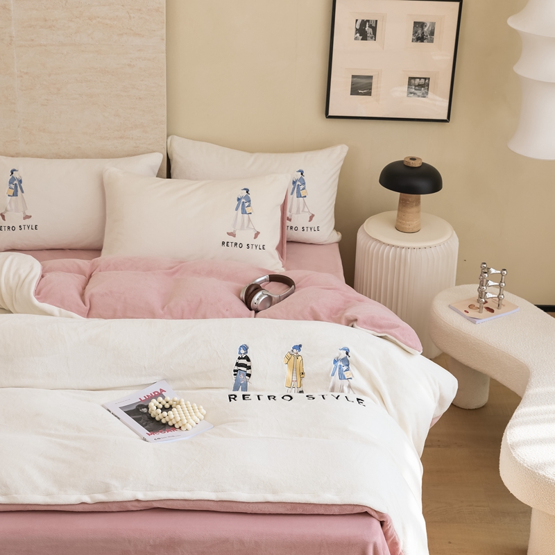 商品名称:121【牛奶绒刺绣四件套】2025新款毛毯被子四件套单件床单被套床笠珊瑚绒牛奶绒冬被法兰绒兔毛绒刺绣男孩-Boy系列场景二 baby-橘粉
