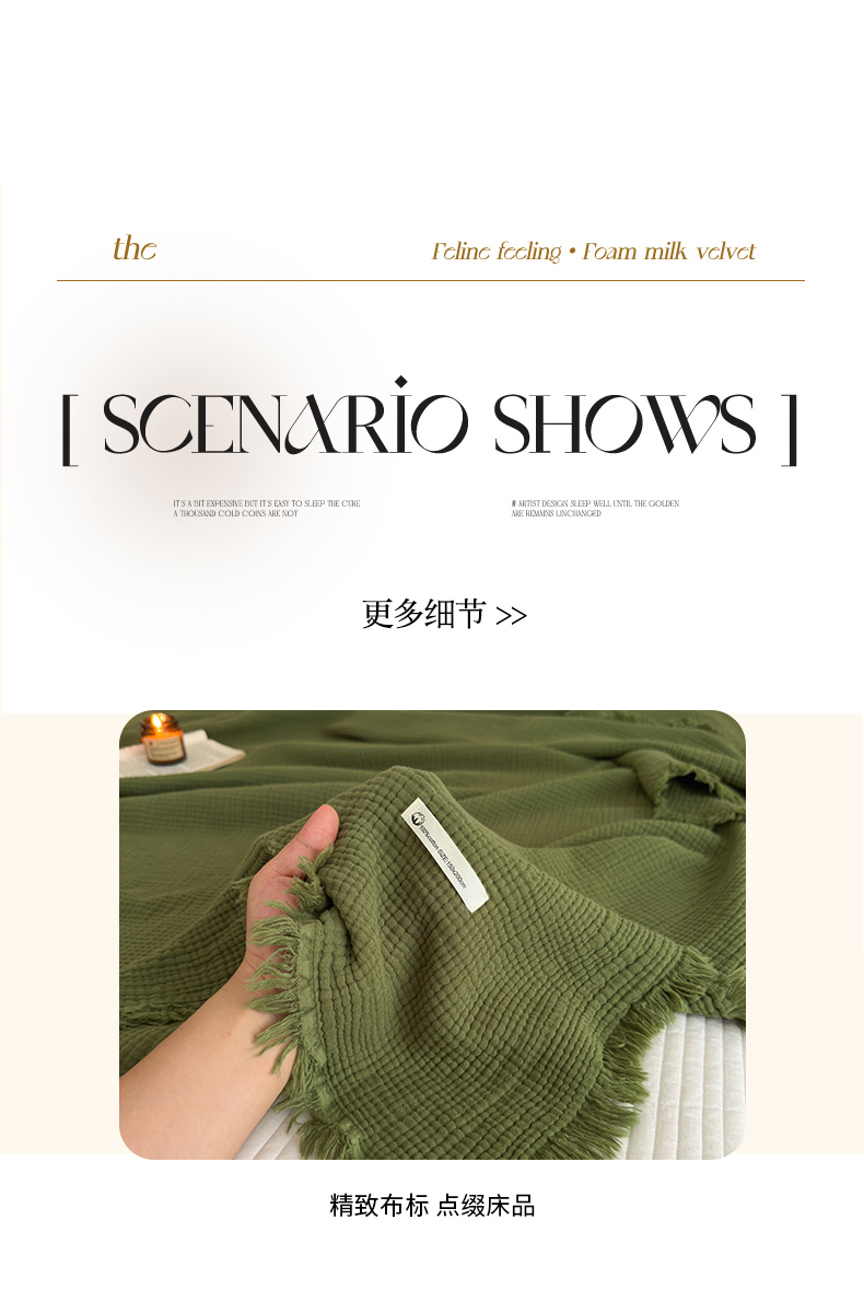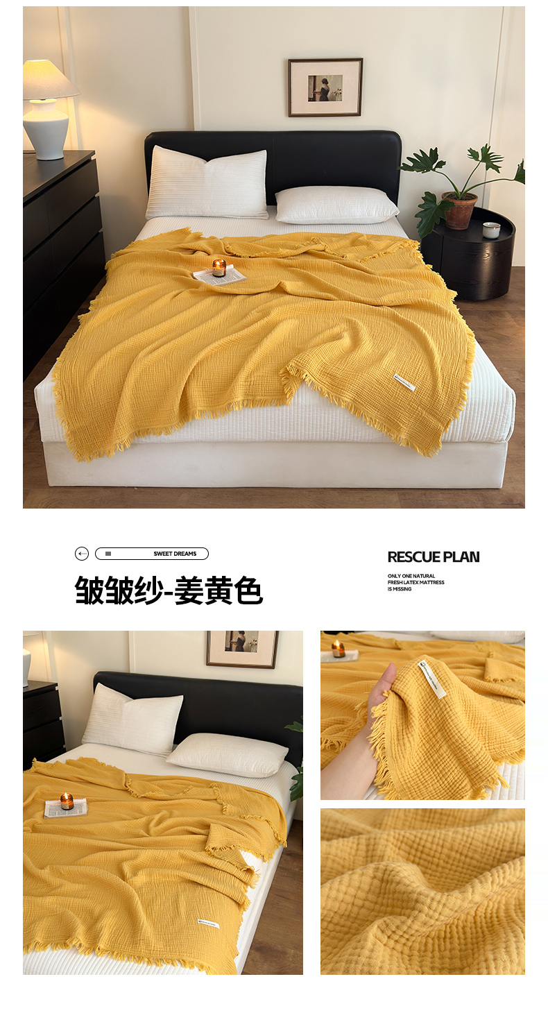 商品名称:小叮当家纺仓储工厂店 2025新款全棉纯棉四层纱皱皱流苏毯毛毯毯子 皱皱纱-姜黄色