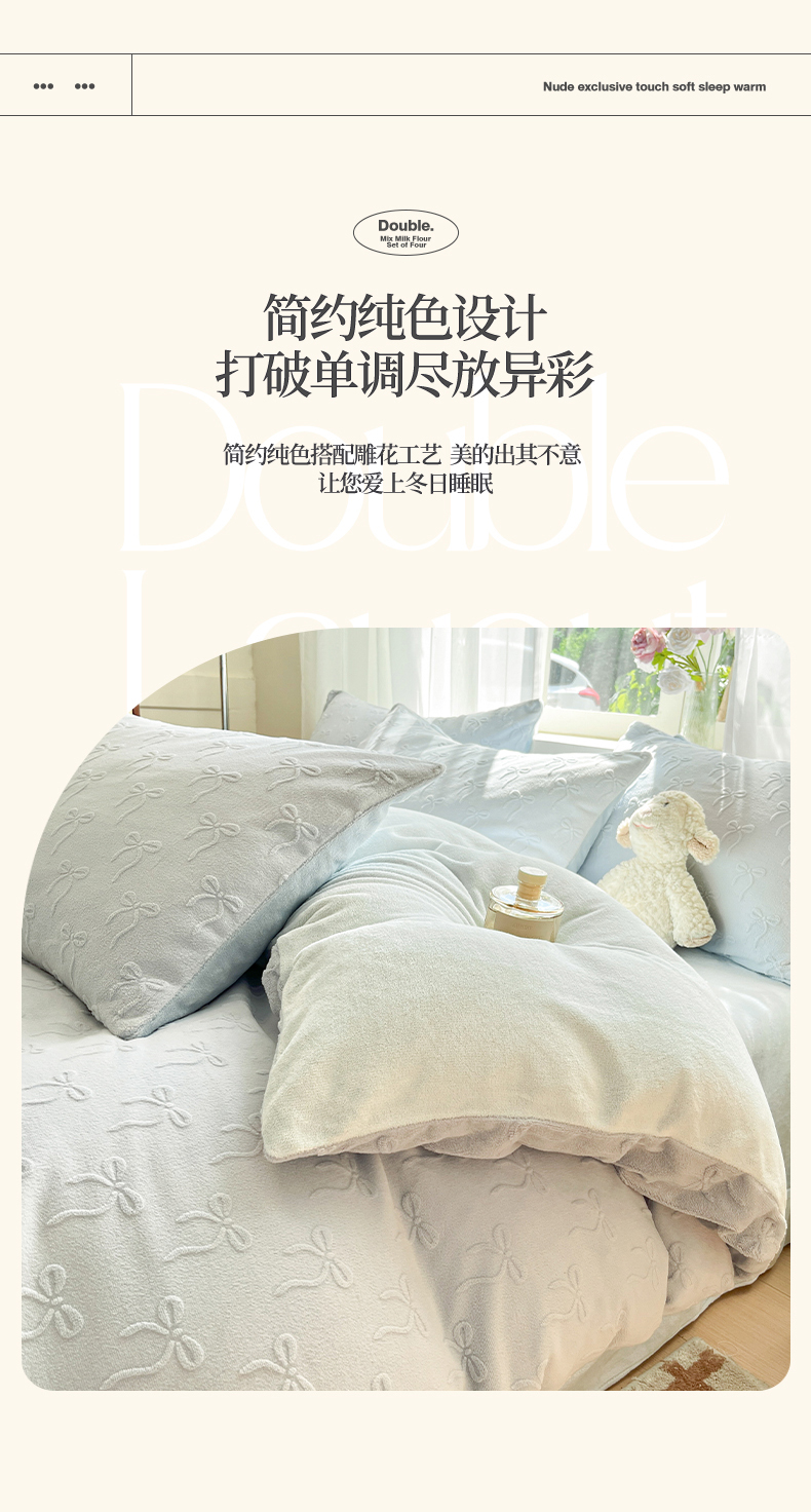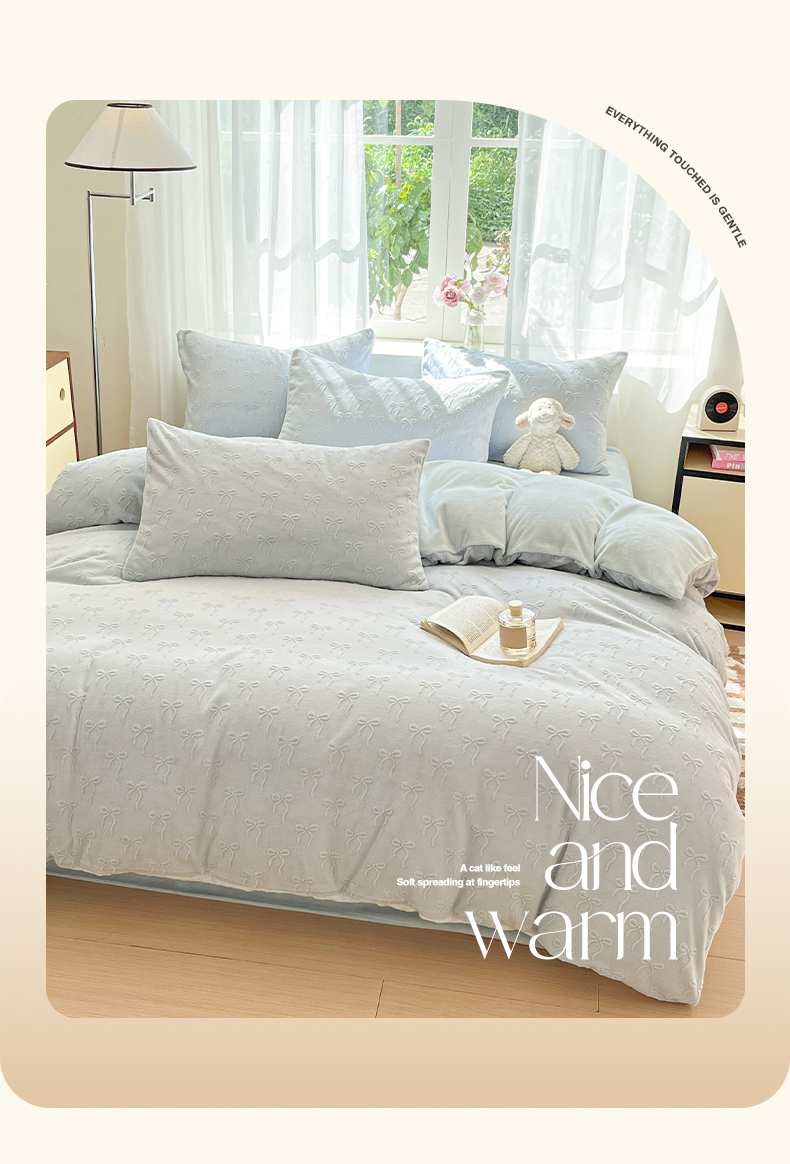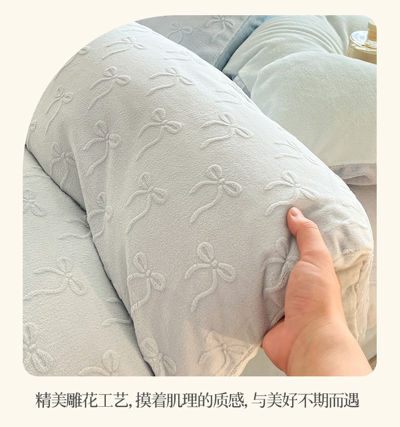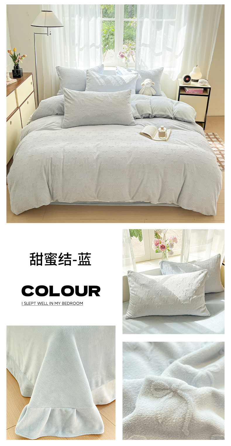 绘萱家居 2025新款高克重雕花雕印纯色牛奶绒四件套双拼法莱绒珊瑚绒 甜蜜结-蓝